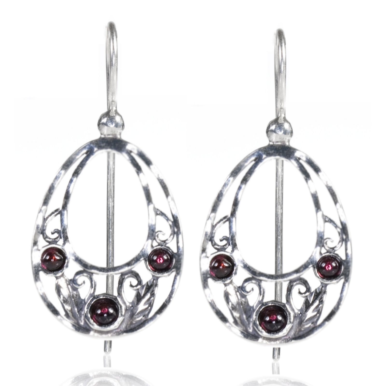 Or-Paz oval garnet open work drop earrings. Featuring a stunning open work sterling silver drop design with round red garnet stones. Match to a red outfit and nail polish for a striking look.