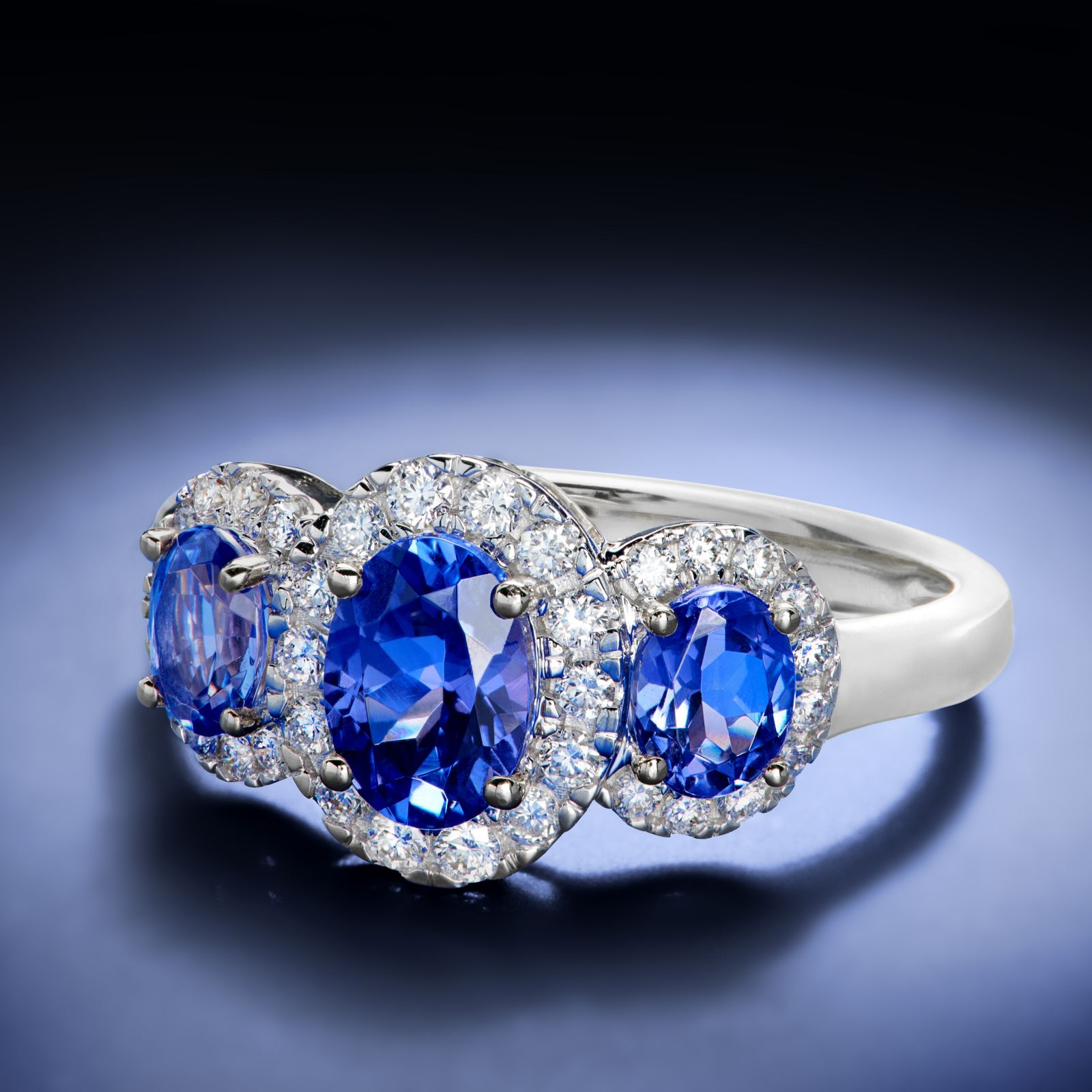 • Stones: 1x (7mm x 5mm), 2x (5mm x 4mm) brilliant cut oval AA tanzanite; 4x (1.5mm), 10x (1.4mm), 16x (1.2mm), 4x (1.1mm) round brilliant cut white diamonds, colour H, clarity I1