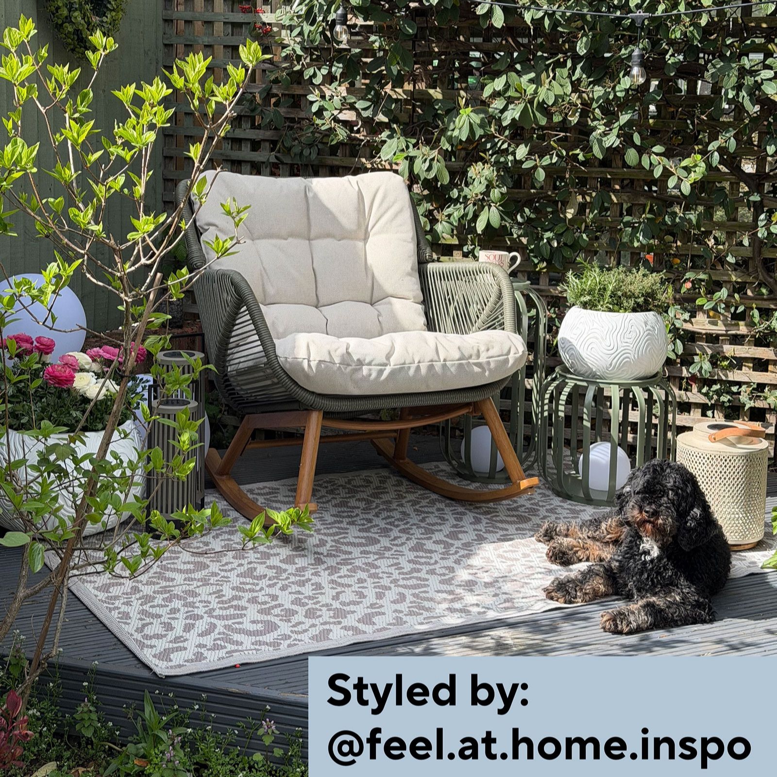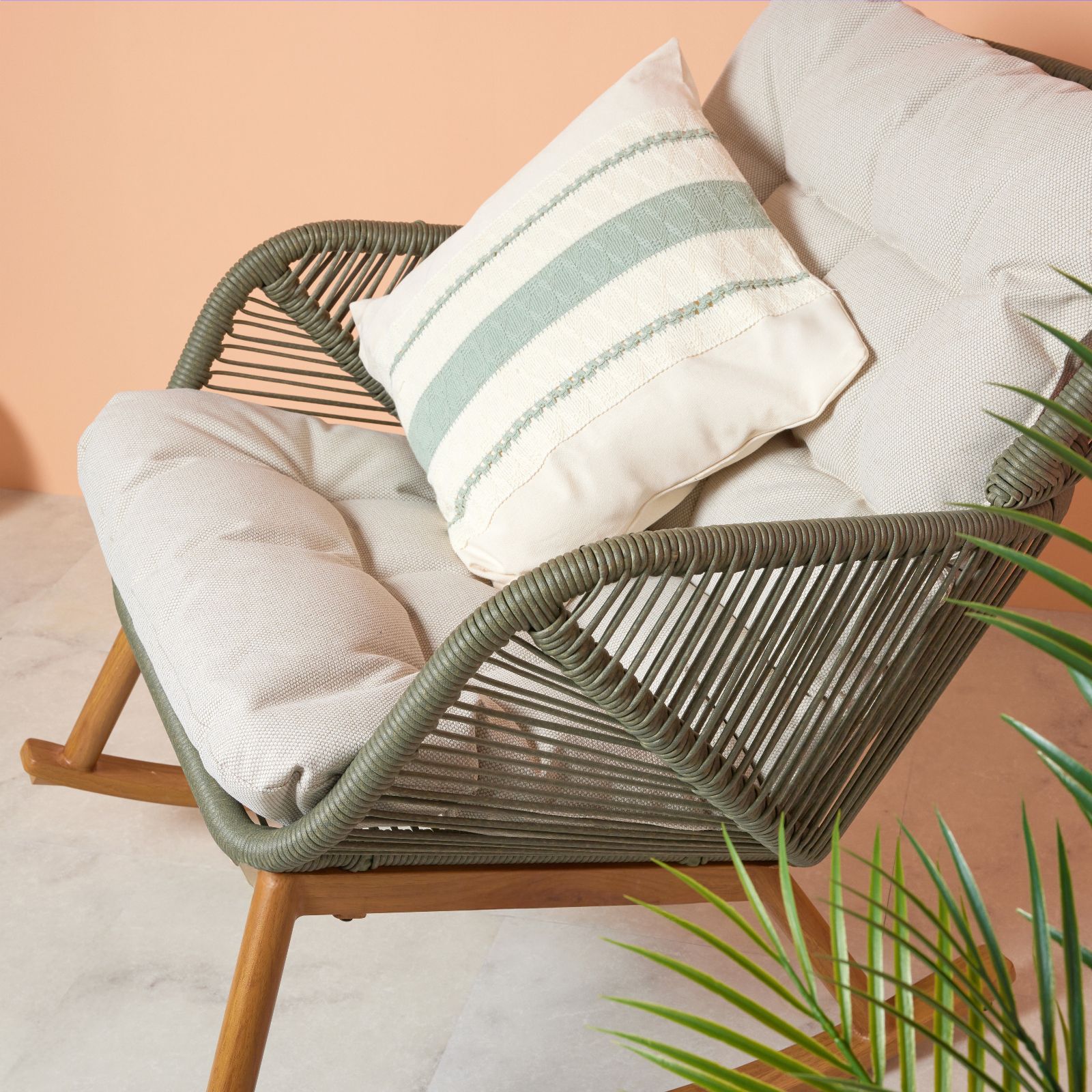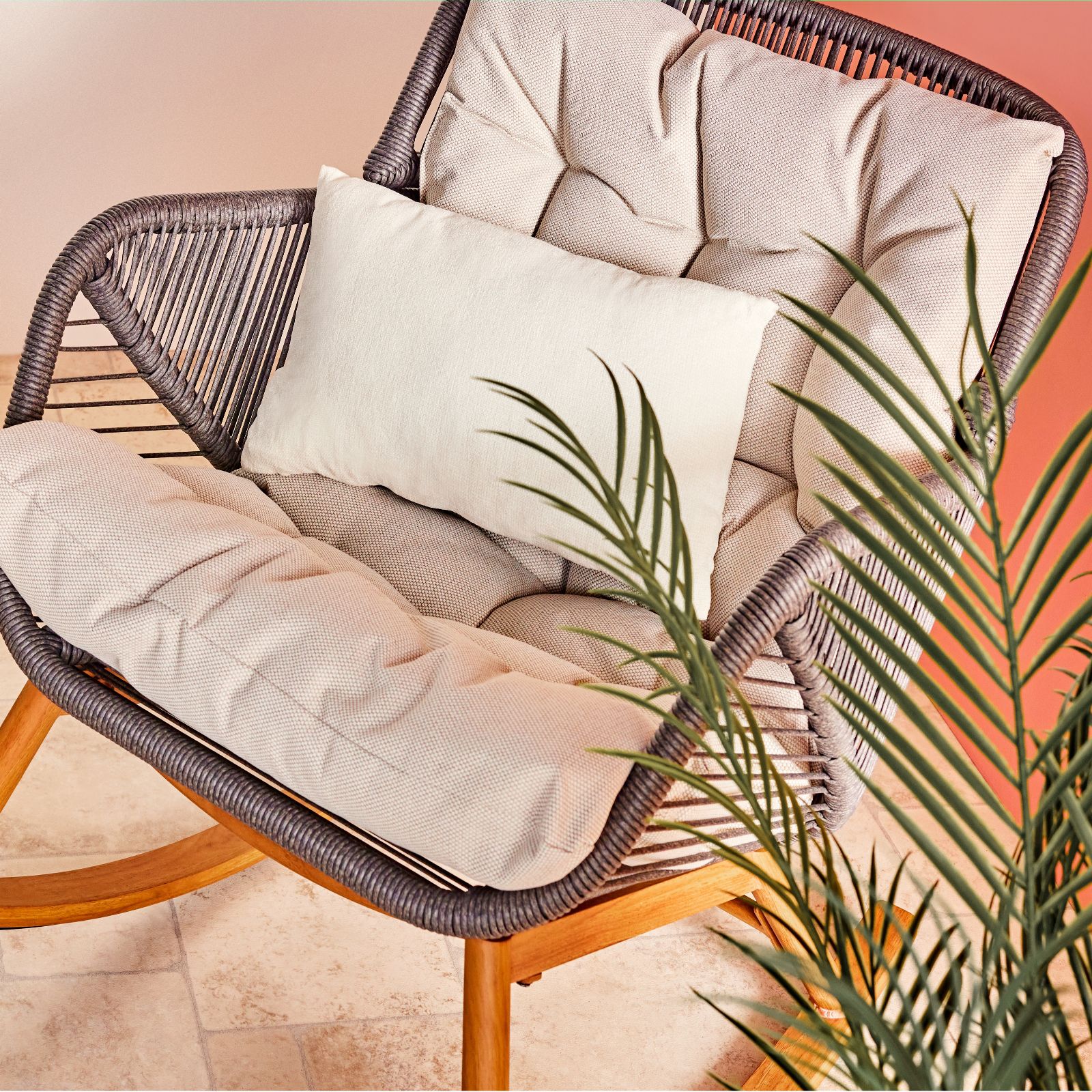 Style your interior or exterior with the contemporary Rope Rocker Chair from abode. With its modern rope detailing and sleek aluminium frame featuring a timber-inspired finish on the legs, this chair adds a sophisticated touch to any space. The high-quality powder-coated frame resists the elements, while two soft seat cushions and a gentle rocking motion invite you to unwind in endless comfort, whether you're relaxing in your garden, conservatory or living room.