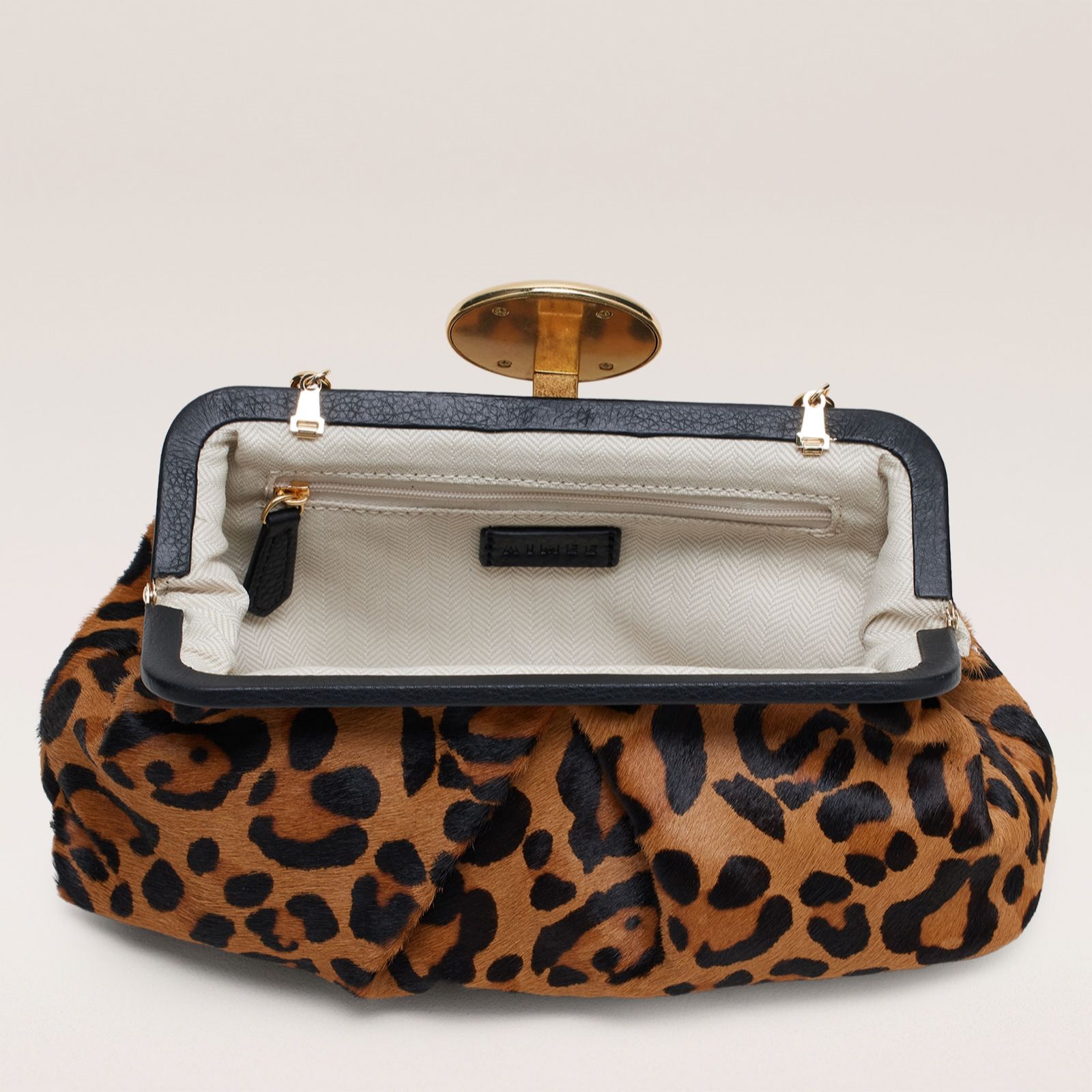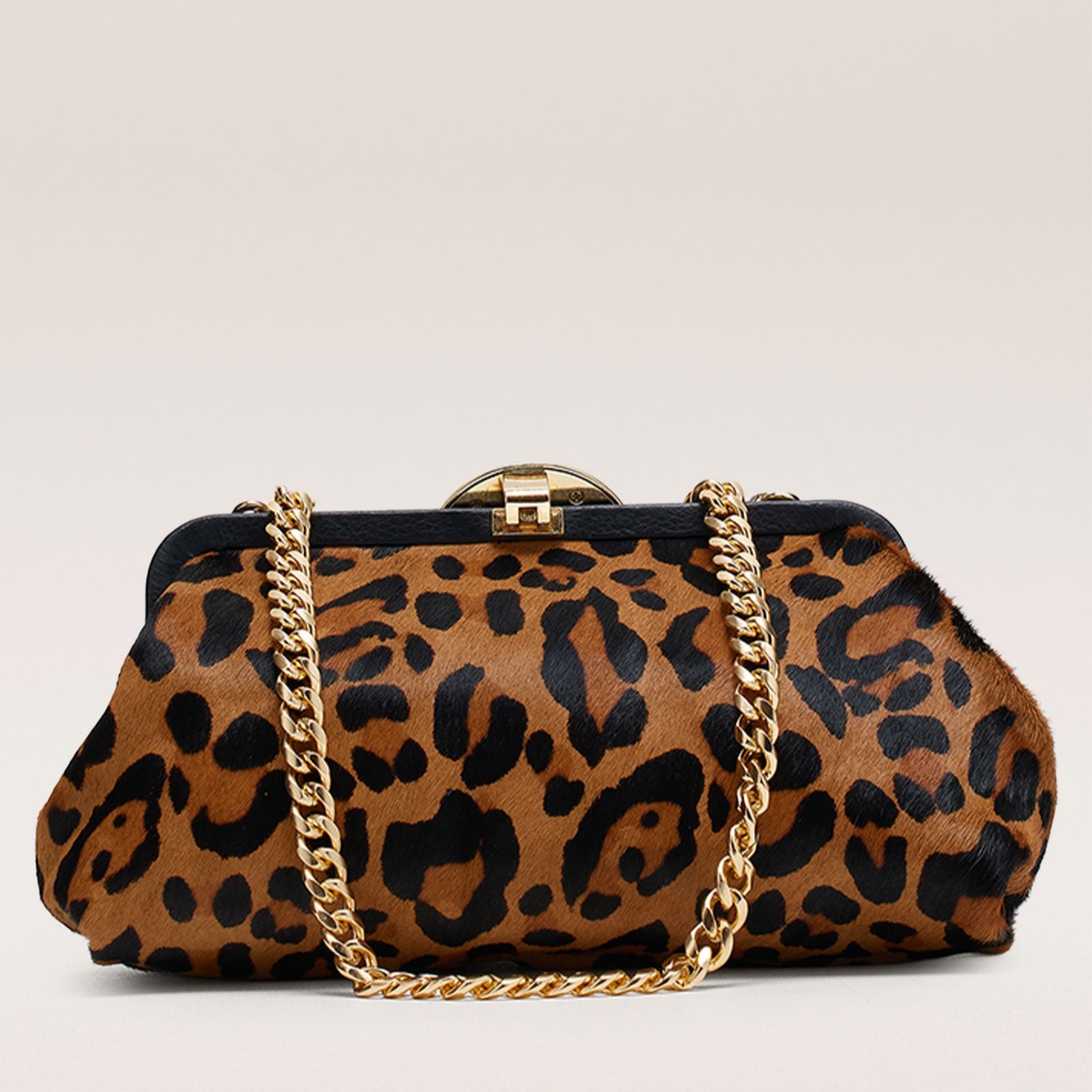 Bring a bold edge to your occasion wear with Aimee Kestenberg's Full Circle clutch. This piece stuns with its dazzling micro-studs, wildcat haircalf detail and a gleaming custom hardware clasp. Designed in genuine leather and finished with a chic chain strap, it's a perfect statement piece for evening events, dinners or whenever you want to add a touch of glamour to your look.