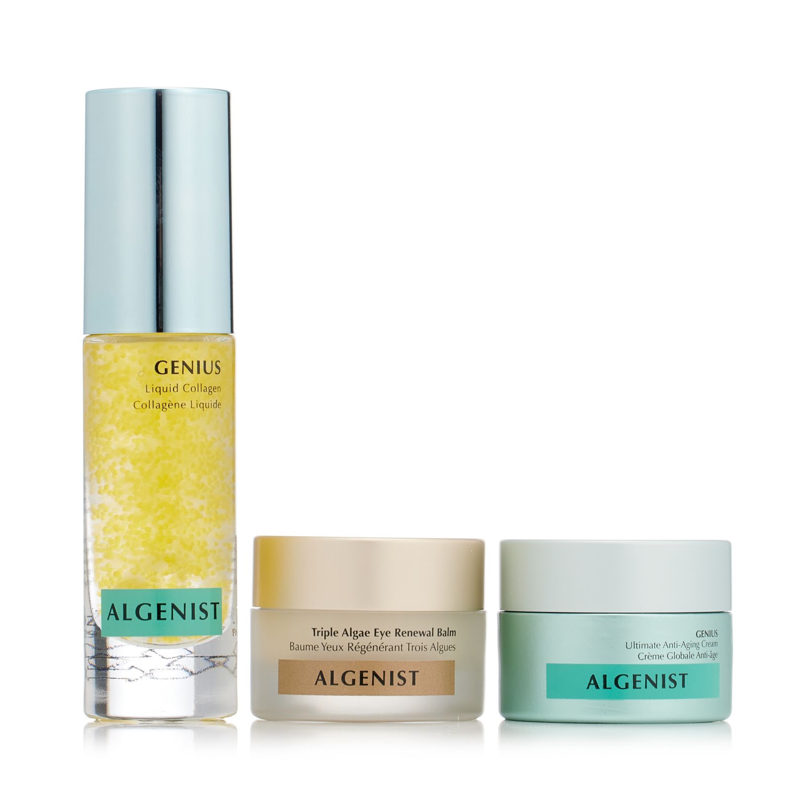 Elevate your skincare routine with Algenist's 3 Piece Skincare Results Kit, featuring a luxurious trio of products designed to help you achieve a revitalised appearance. This comprehensive set includes the Genius Ultimate Anti-Ageing Repairing Cream, Genius Liquid Collagen, and Triple Algae Eye Renewal Balm, all working together to help leave your skin looking and feeling refreshed and radiant.