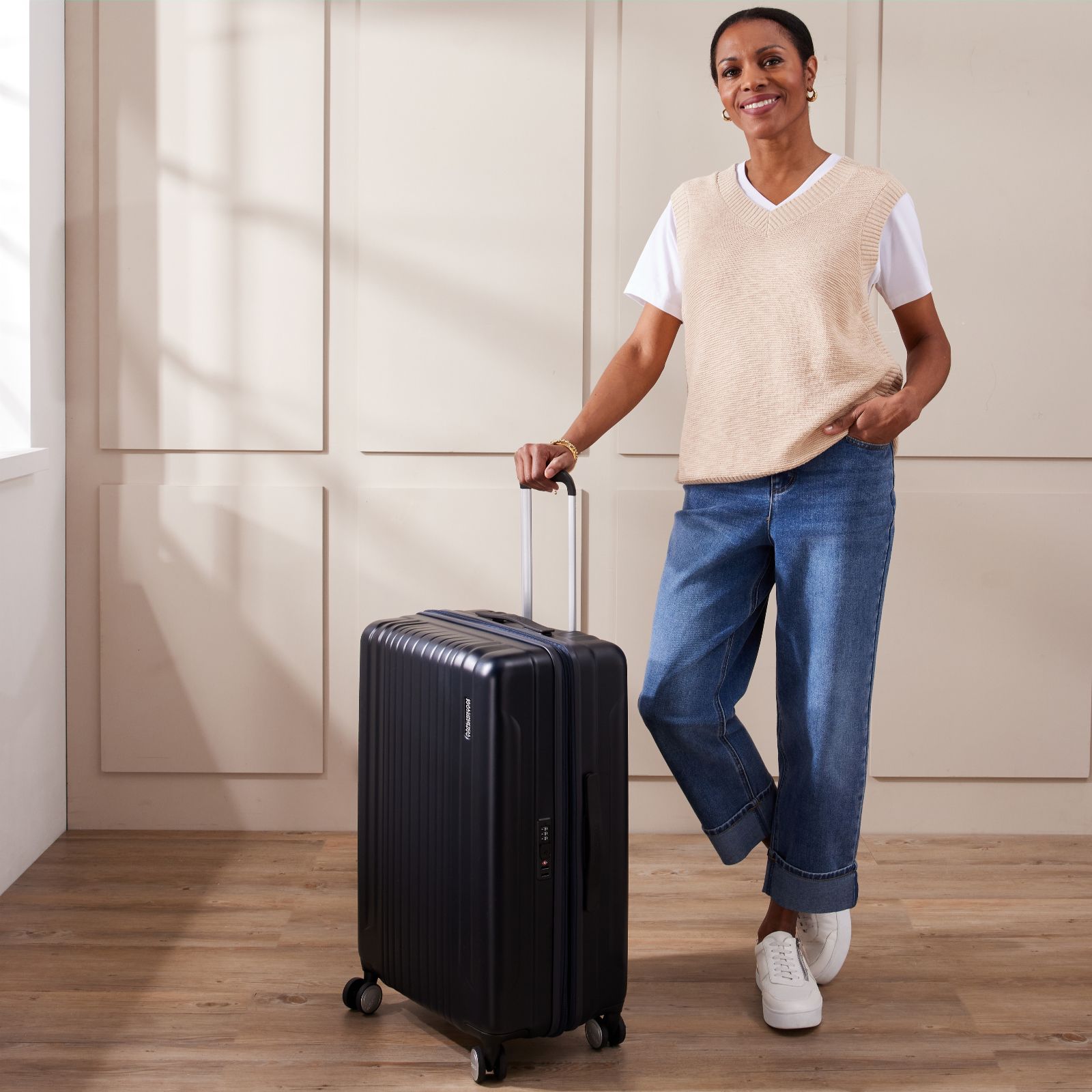 - instantly spot your luggage on the baggage claim belt thanks to the luxe metallic-effect finish. Premium in look and equally as sturdy, choose from four colour options for your cohesive set: there's elegant Navy, Sand, Violet or classic Black.
