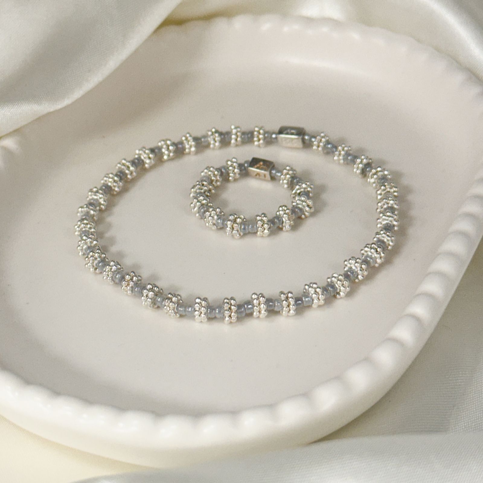 Bring a touch of effortless charm to your look with the Mini Ria Bracelet from Annie Haak. This dainty design combines premium 925 sterling silver with delicate Japanese glass beads, accented by pretty silver flower spacers for a hint of shine. Available in soft pink or cool grey, its lightweight, stackable, and hand-threaded on stretch fit elastic for all-day comfort  perfect for everyday wear or adding a subtle pop of colour to special outfits.