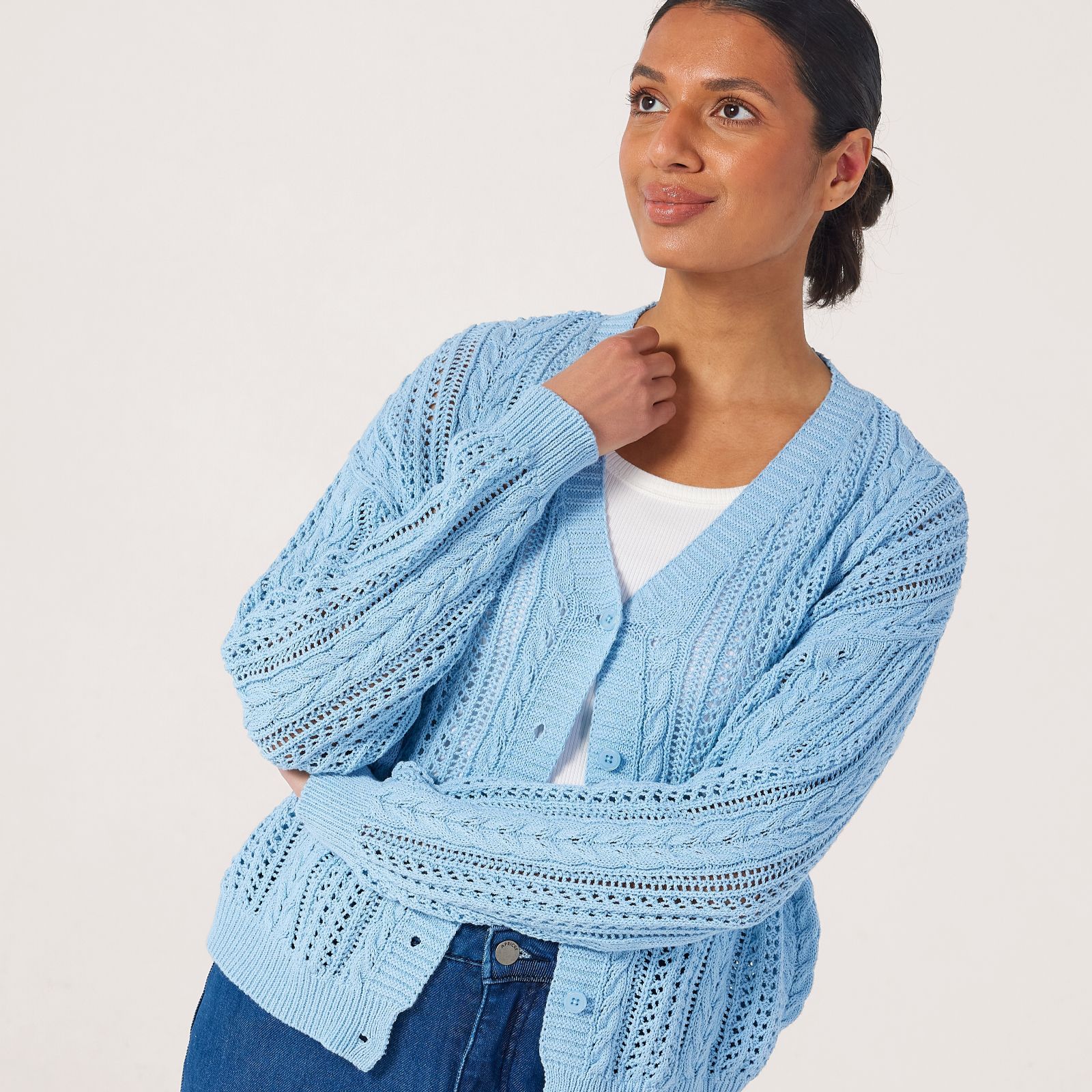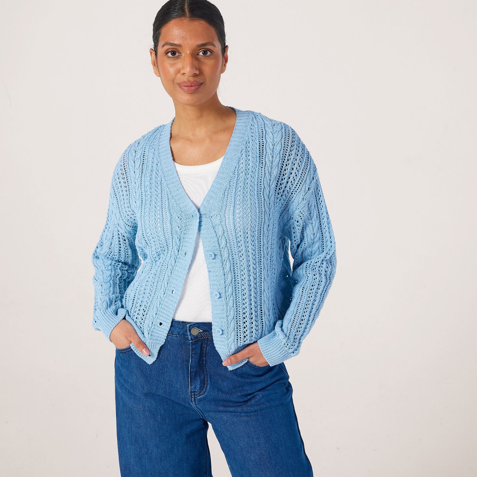 Embrace a coastal Bohemian vibe for all your spring adventures with the button-through crochet cardigan from Apricot. Crafted in a mid-weight knit with classic cable knit and delicate pointelle panels, this easy-to-wear cardigan offers timeless elegance, seamlessly taking you from beachside strolls to garden gatherings. Pair it over a simple tee and jeans for a laid-back, casual look that transitions perfectly from day to evening.
