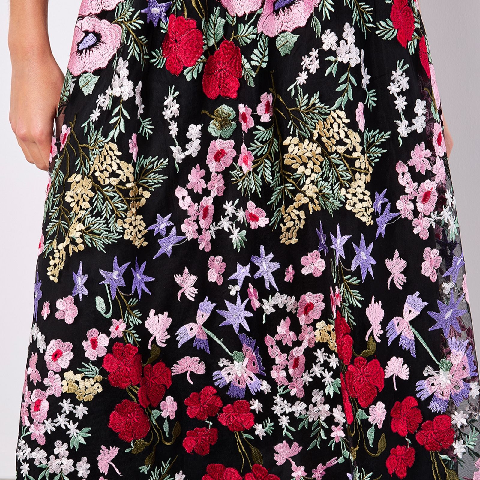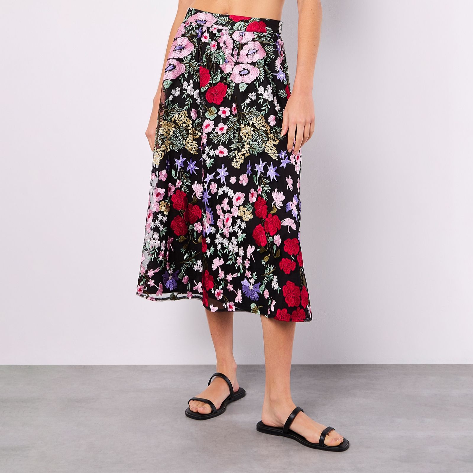 Step into elegance with the Apricot floral embroidered mesh A-Line midaxi skirt, perfect for those warm-weather occasions. This skirt is adorned with intricate floral embroidery that beautifully complements its mesh fabric, while the elastic waist ensures a comfortable fit. Whether you're attending a garden party or a casual brunch, this skirt is your go-to for effortless style. Pair it with a lace camisole and heels for a chic, sophisticated look.