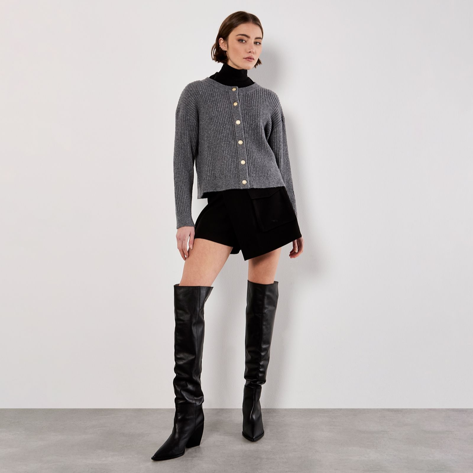 Add a touch of glamour to your look with this gold button knitted cardigan from Apricot, elevating classic charm with a modern twist. The textured knit and statement buttons make this cardigan a standout for desk-to-dinner dressing or laid-back weekends. For a polished look, style it over a crisp shirt and tailored trousers or dress it down with your favourite denim.