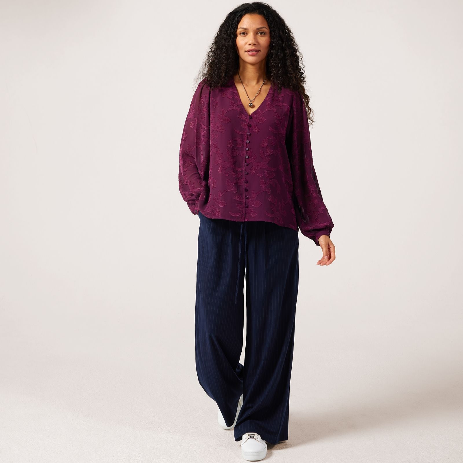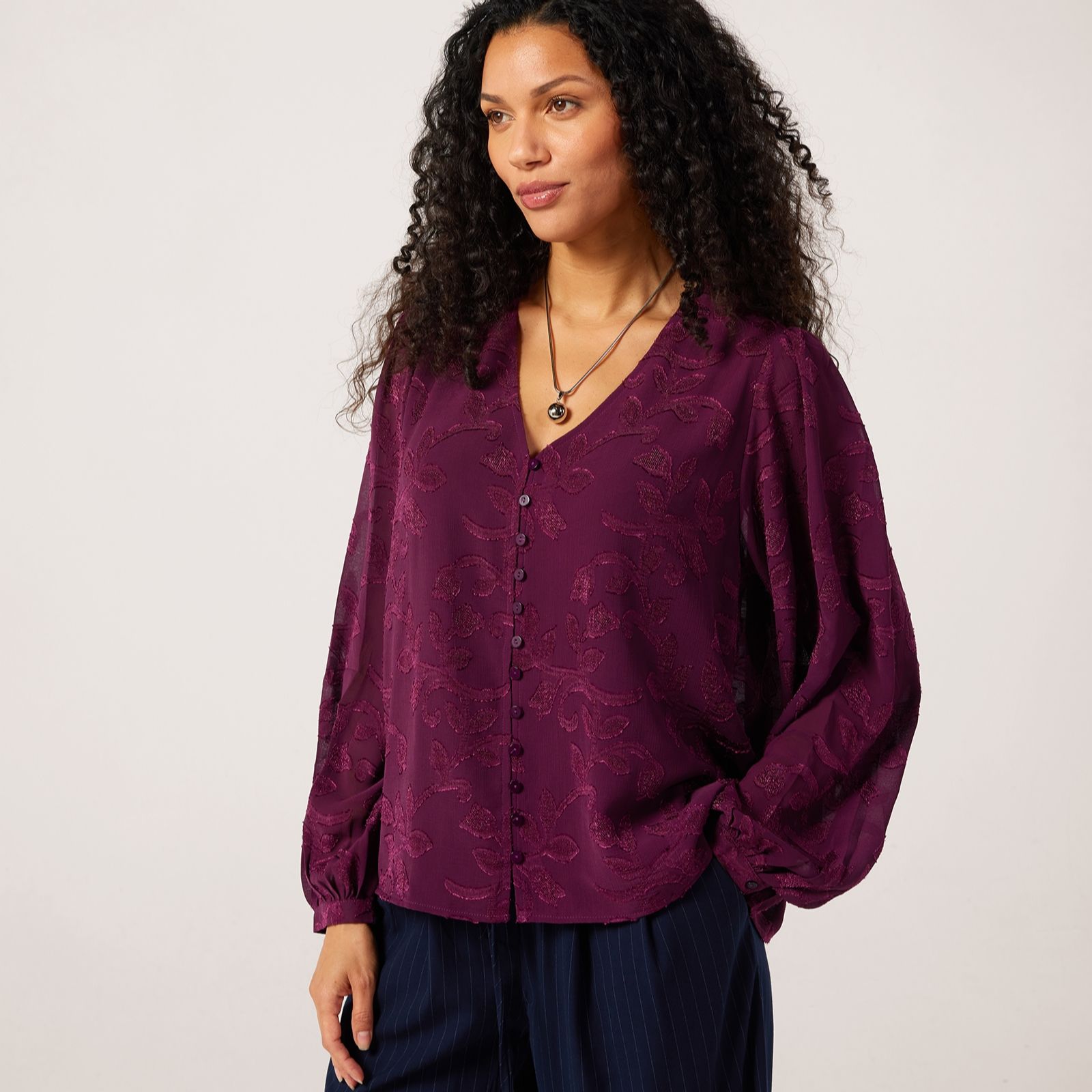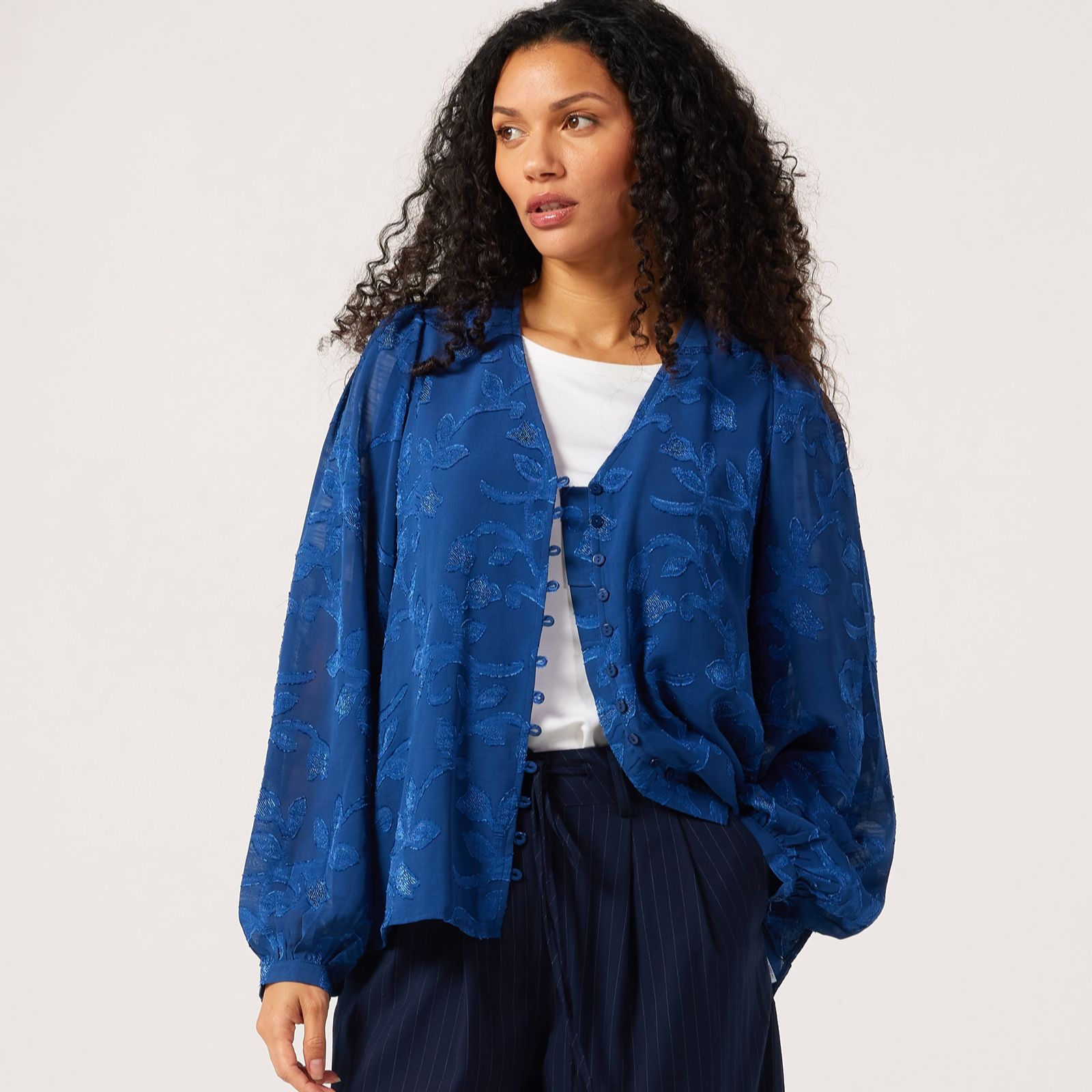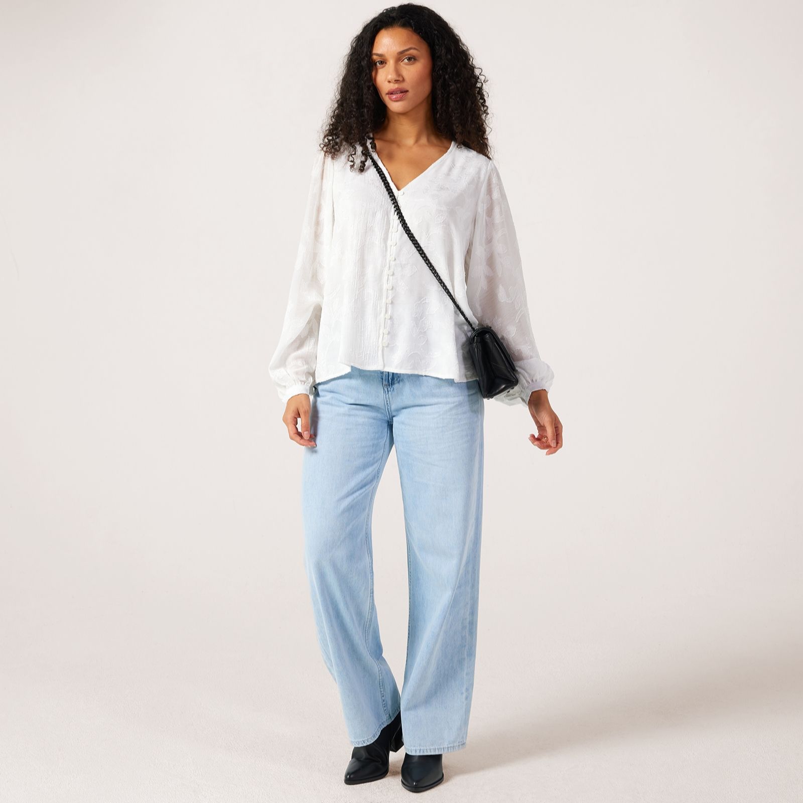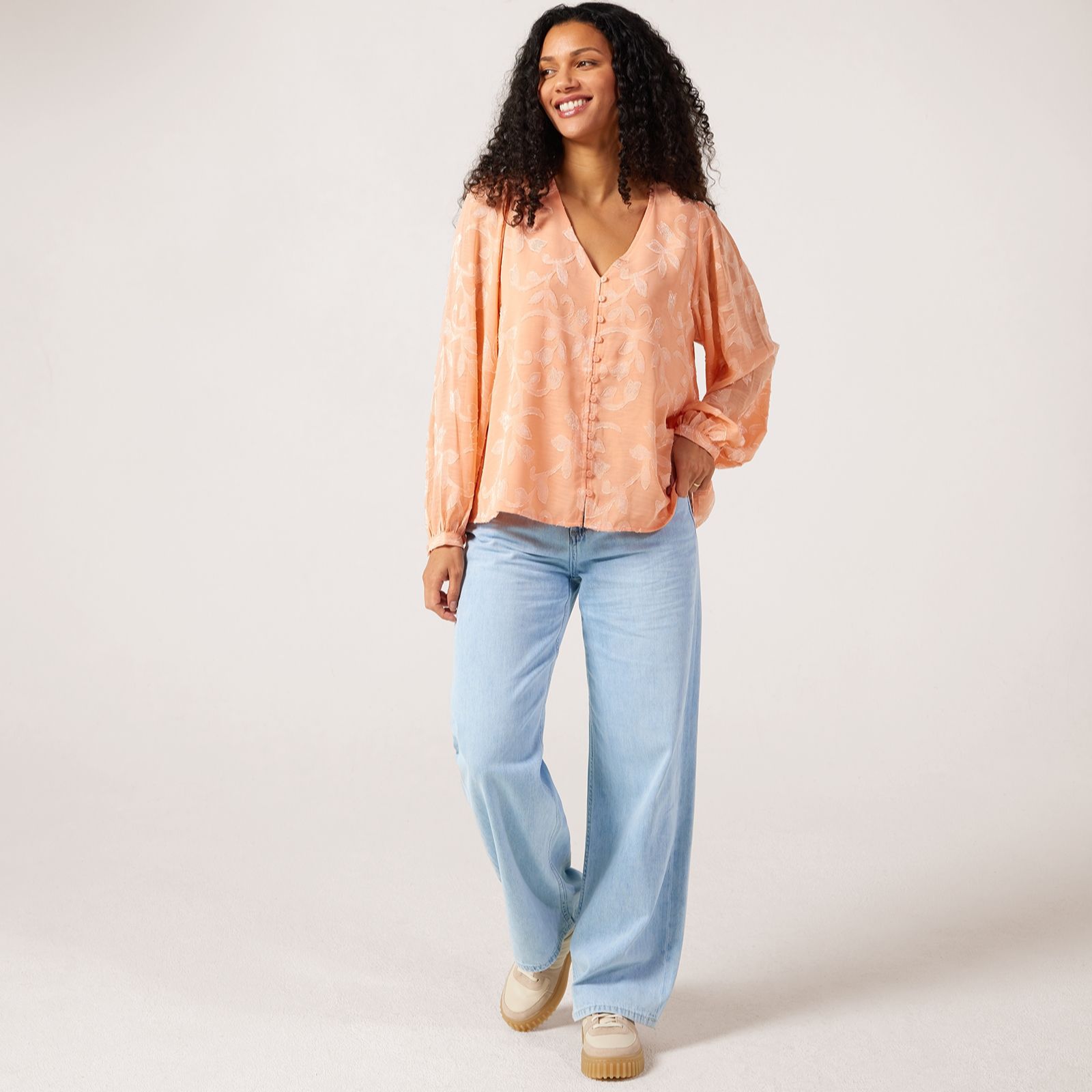 Bring boho charm to your everyday look with this jacquard blouse from Apricot. This gorgeous piece boasts long balloon sleeves with smock cuffs that creates a statement look while providing enough coverage for tricky transitional weather. The v-neckline, button detailing and jacquard texture add a touch of sophistication, making this blouse your versatile style staple. For a dependable desk-to-dinner outfit, try pairing it with tailored trousers, or just keep things casual with your favourite denim.