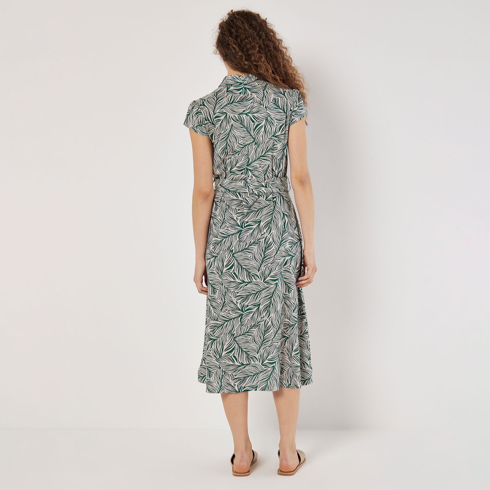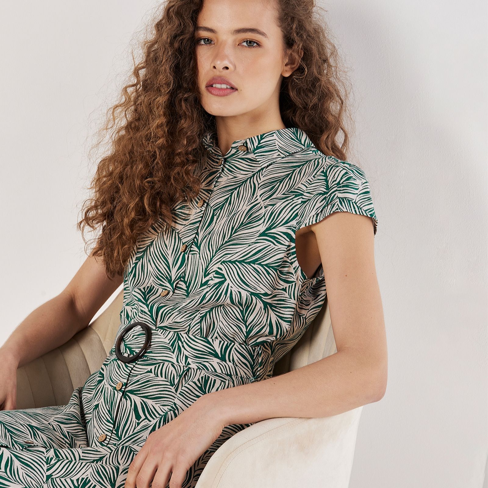 Elevate your wardrobe with the Apricot Mono Leaf Linen Belted Dress, a perfect blend of sophistication and comfort. This midi dress showcases a striking leaf print, enhanced by a chic collared neckline and cap sleeves, making it ideal for both work and weekend outings. The button-down front and fabric belt ensure a gorgeous fit, effortlessly transitioning from day to evening. Pair it with wedges or flats for a versatile look that complements any occasion.
