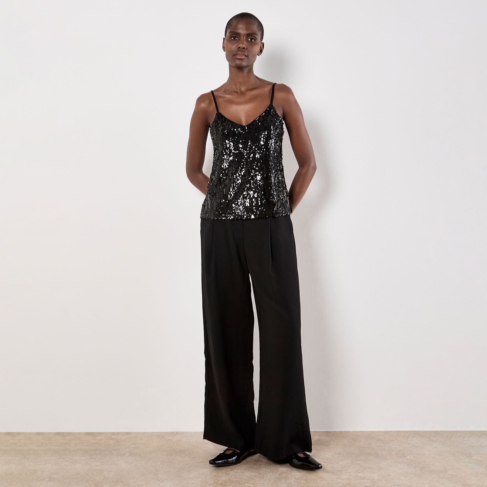 Shimmer into any evening with the Apricot linear sequin cami top, where black sequins catch the light to create a striking, sophisticated look. Whether youre heading to a cocktail party, dinner date or a night out with friends, this top brings instant glamour to your wardrobe. Pair it with tailored trousers or a sleek skirt for a chic ensemble thats sure to turn heads.