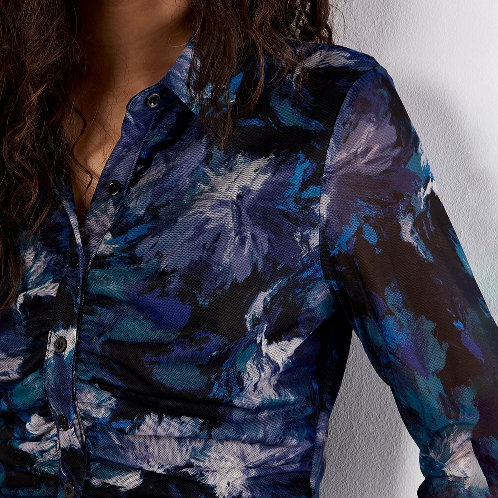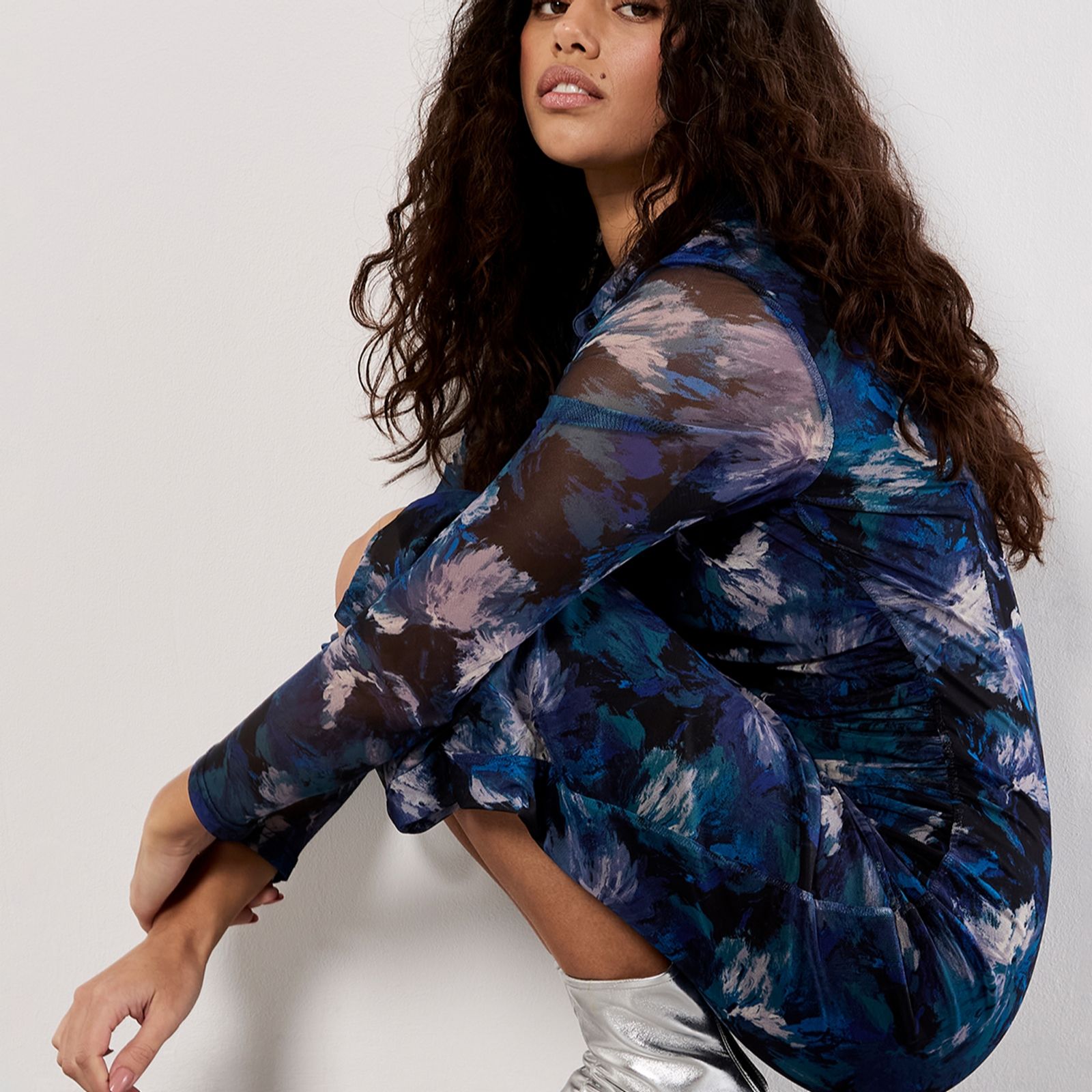 Set the tone for effortless elegance with the Apricot paintbrush floral mesh ruched midi shirt dress, a dreamy blend of artistic print and feminine detailing. Perfect for memorable parties, brunch dates or an evening out, its shirt-style silhouette and ruched accents bring a touch of sophistication to any occasion. Pair it with strappy heels and a cross-body bag for a chic, laid-back look that works from day to night.