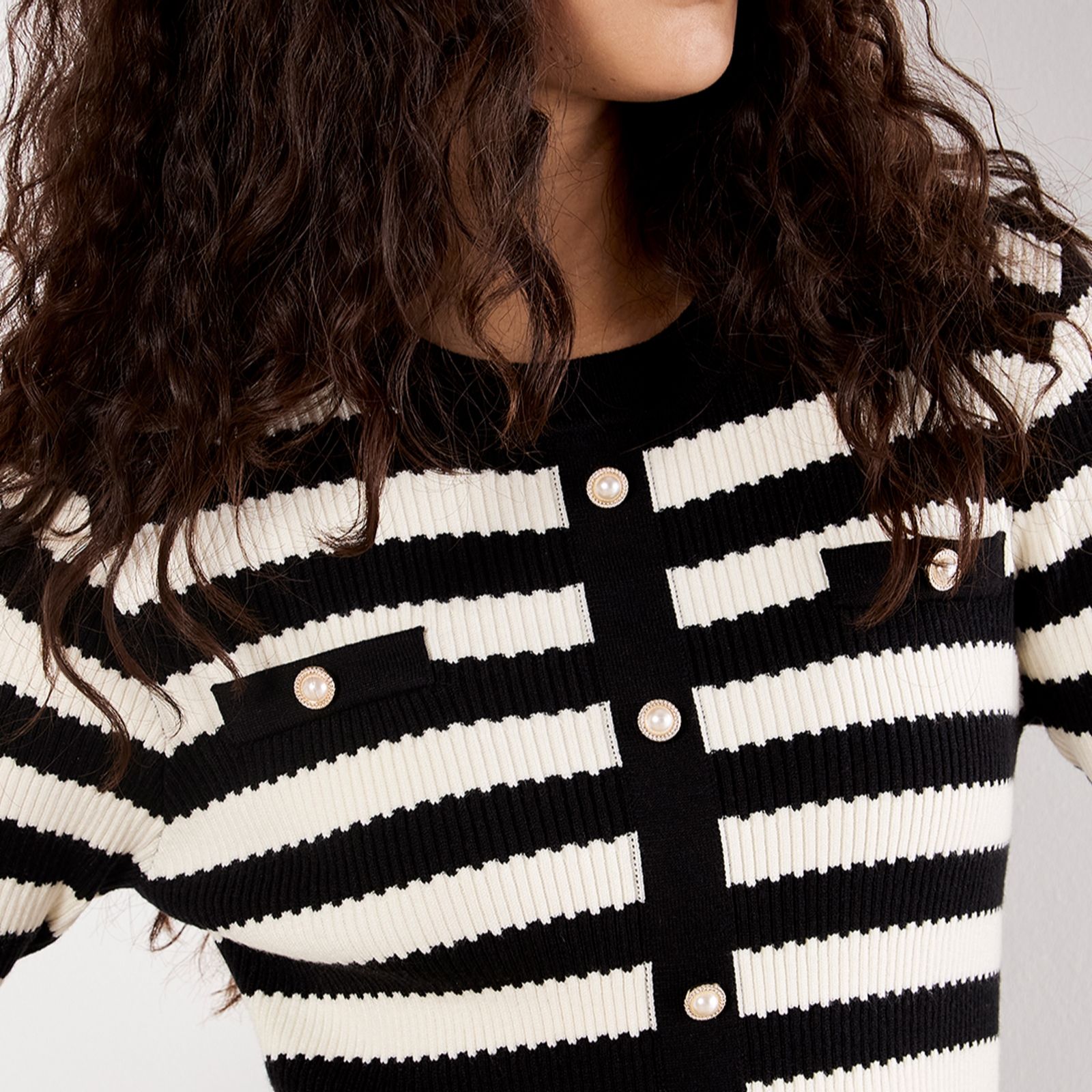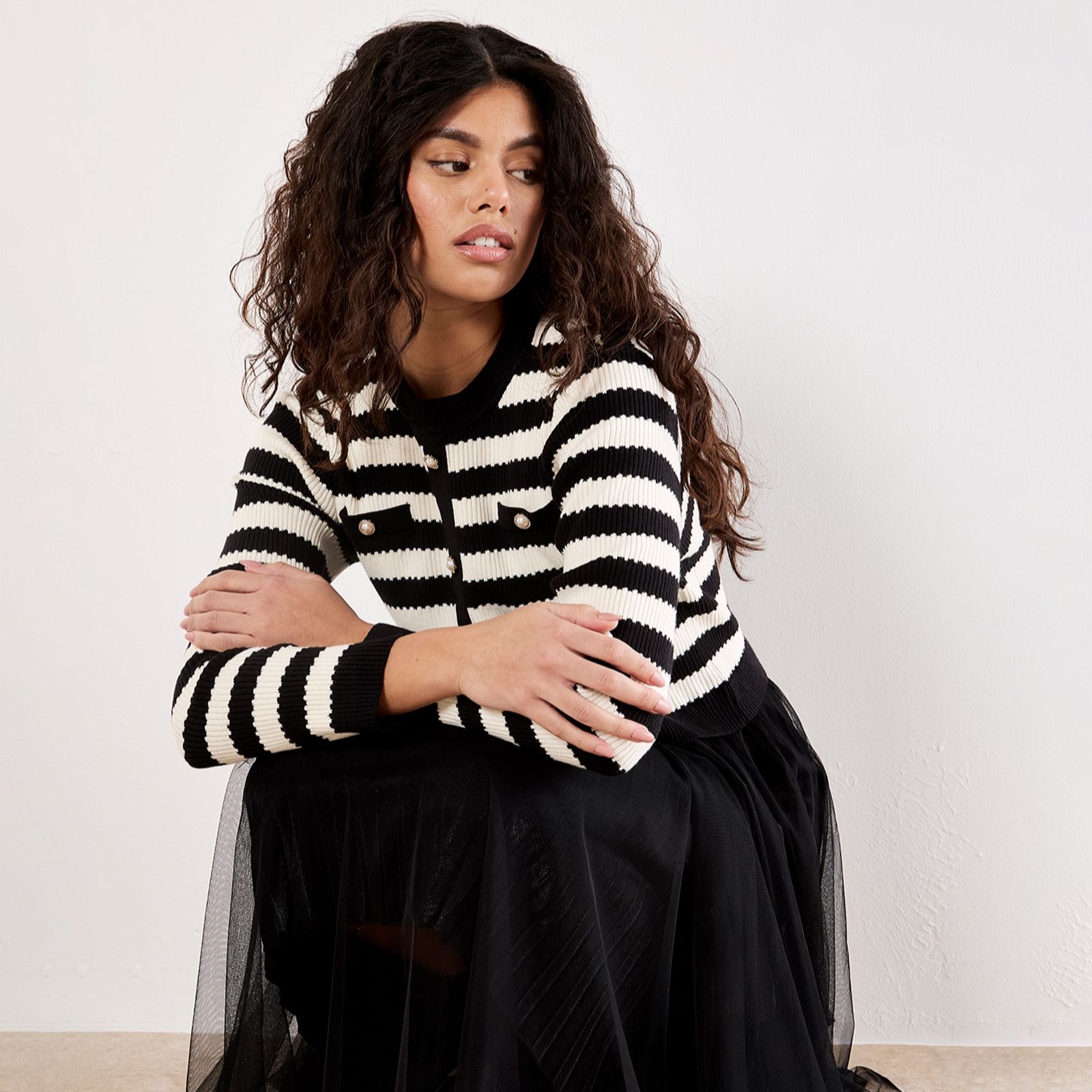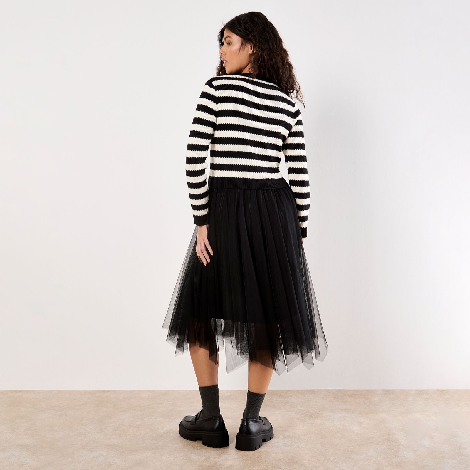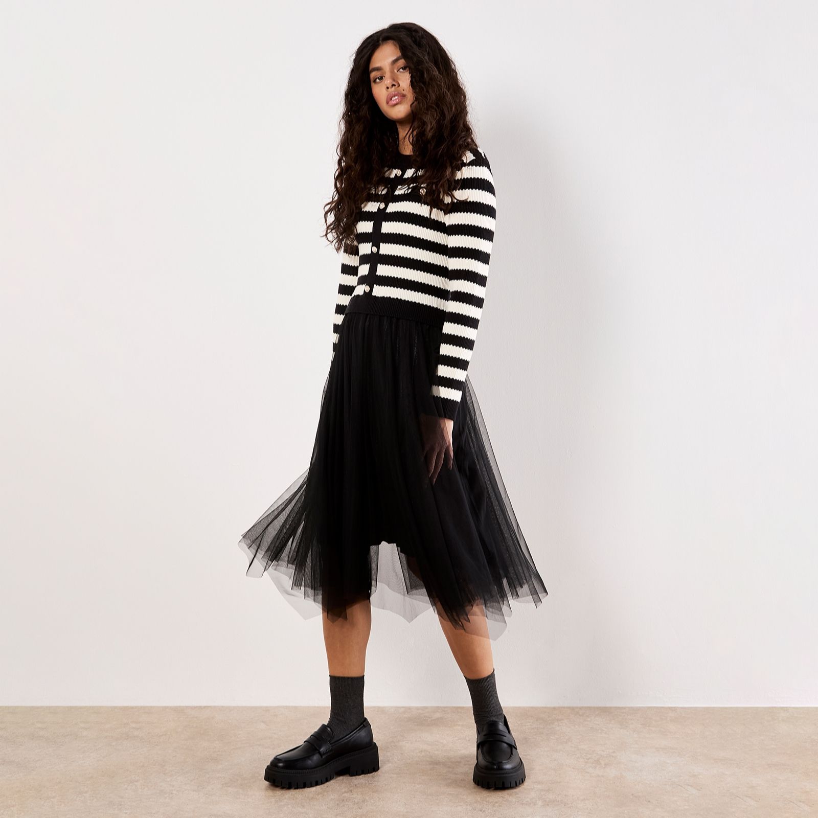 Bring a touch of playful sophistication to your wardrobe with the pearl buttons & stripe jumper tulle skirt dress from Apricot, a chic fusion of a nautical-inspired striped knit top and a romantic layered tulle skirt. Perfect for brunch dates, weekend strolls or evening gatherings, this dress effortlessly balances comfort and style. Pair it with ankle boots for a contemporary edge or ballet flats for a softer, feminine finish