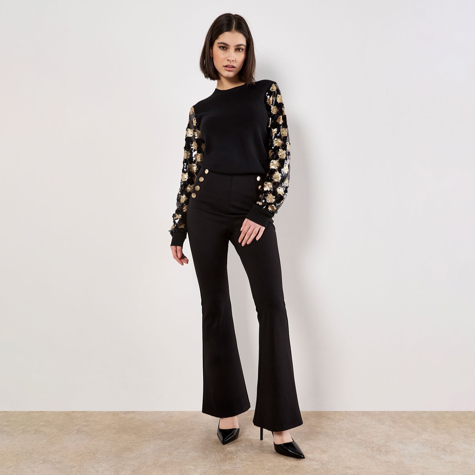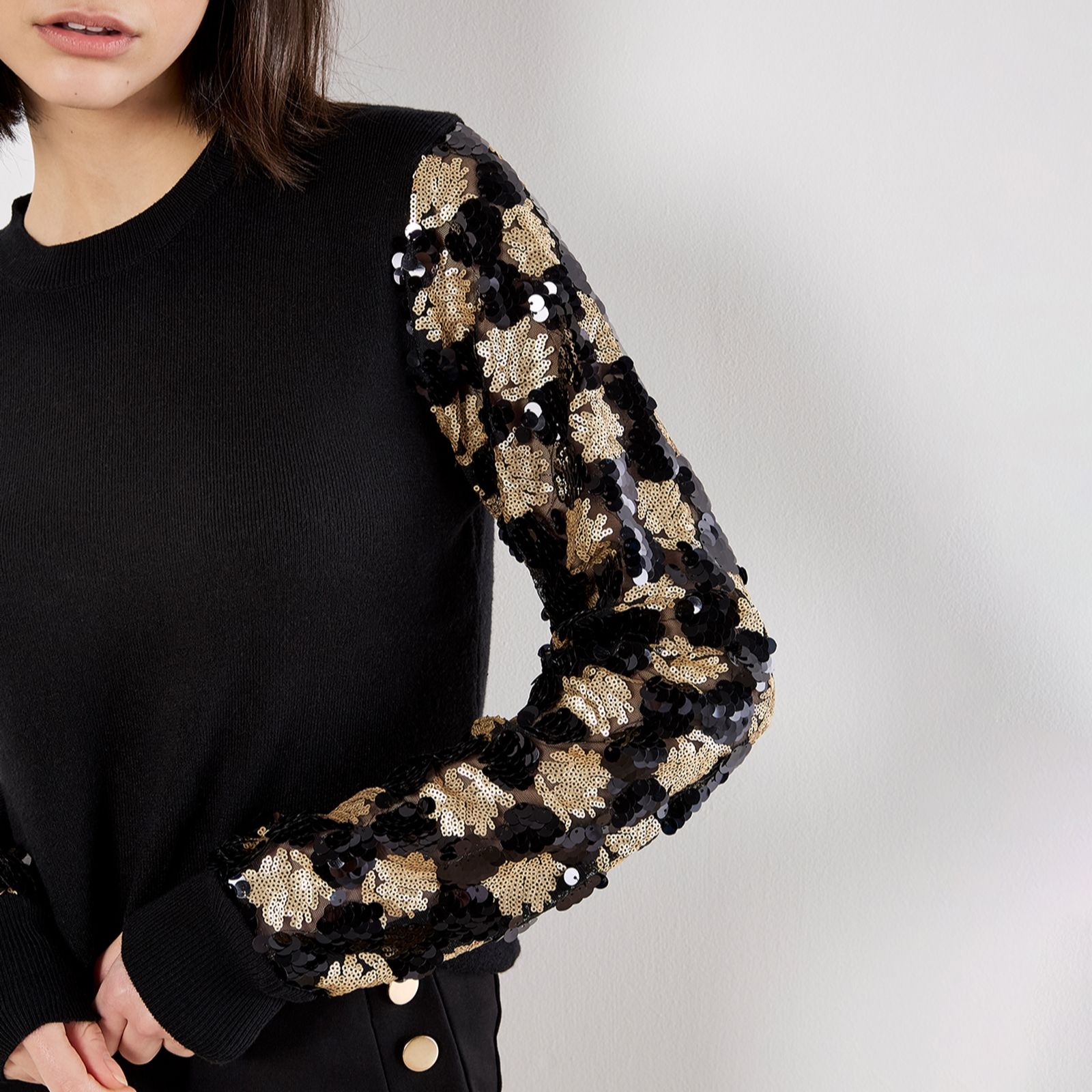 Add a touch of sparkle to your everyday style with the Sequin Arm Jumper from Apricot, where classic comfort meets eye-catching detail thanks to shimmering sequin embellishments along the sleeves. Perfect for everything from relaxed brunches to evening gatherings, this jumper brings a playful twist to your knitwear collection. Try pairing it with tailored trousers or a sleek skirt for a chic, modern look.