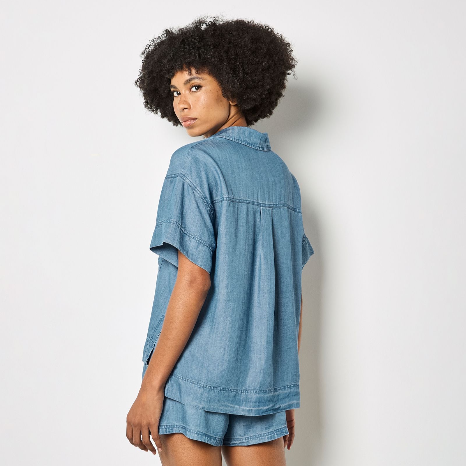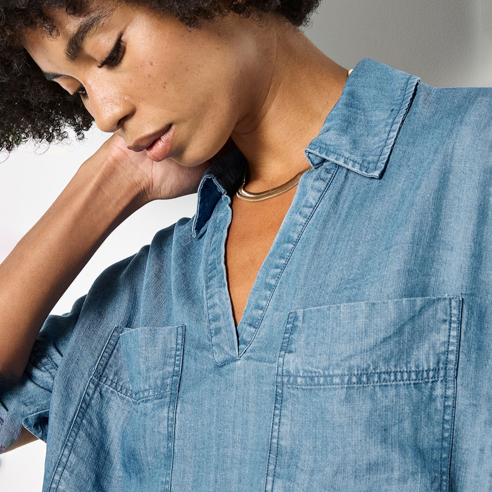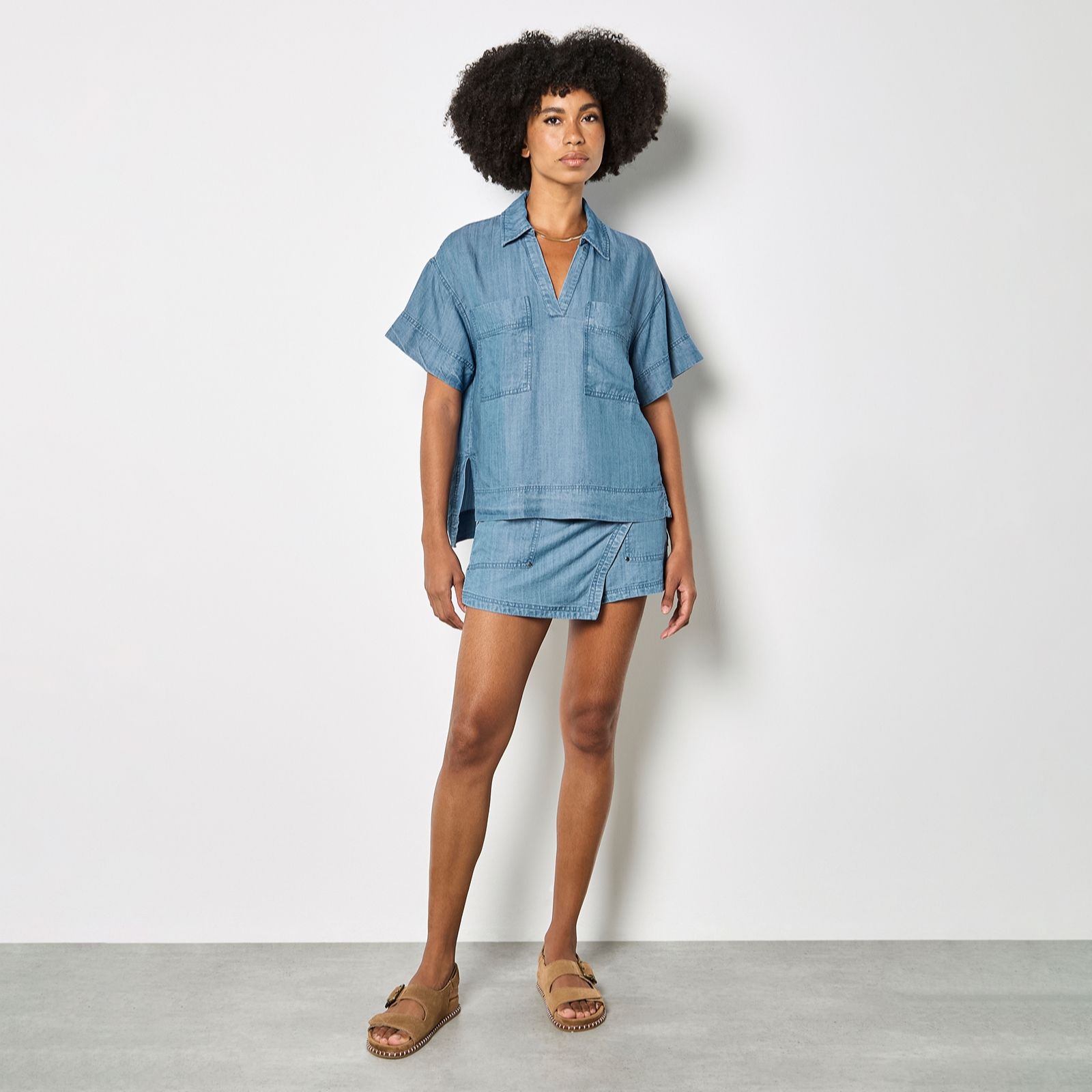 Relaxed yet refined, the Apricot slub open neck denim shirt brings a laid-back edge to everyday dressing. Its loose fit and open neckline create an effortlessly cool silhouette that works beautifully for casual brunches or weekend strolls. Style it with tailored trousers for a smart-casual twist or layer over a vest and jeans for an easy, off-duty vibe.