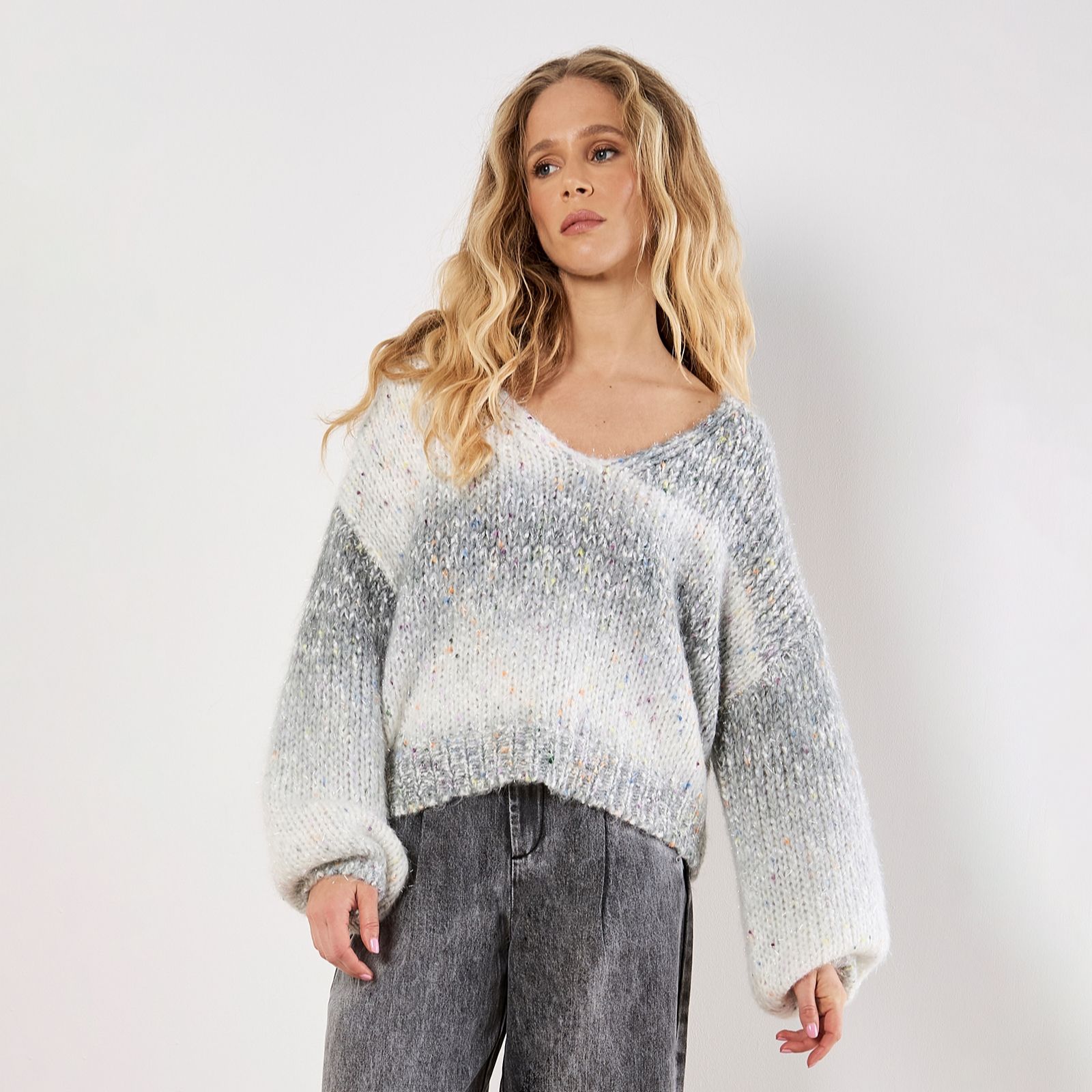 Add a touch of sparkle to your knitwear collection with this tinsel and fleck V-neck fisherman knit jumper from Apricot. Its textured design and subtle shimmer make it perfect for brightening up casual days or adding a playful twist to evening looks. Pair it with jeans and ankle boots for a relaxed vibe, or layer over a slip skirt for a chic, contemporary outfit.