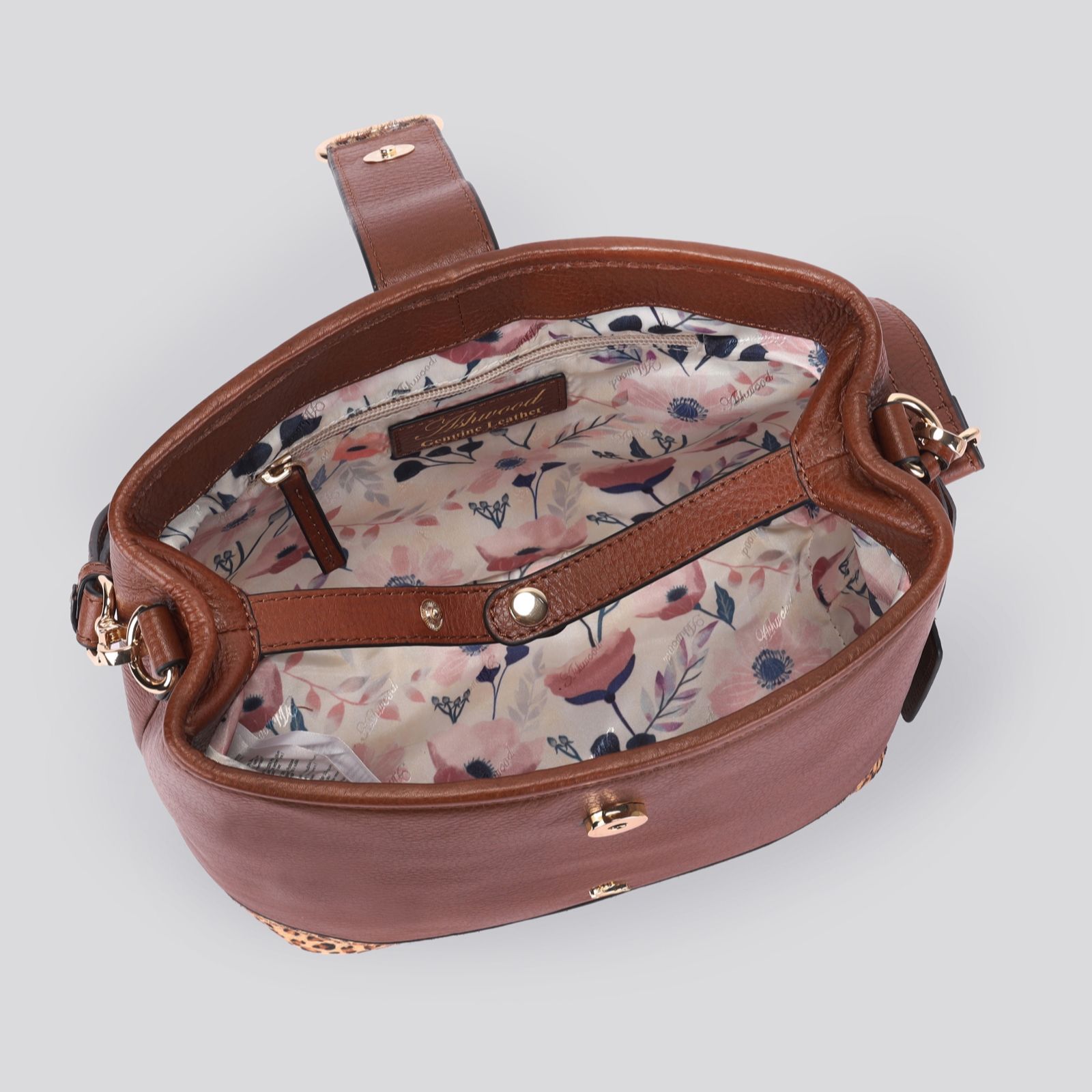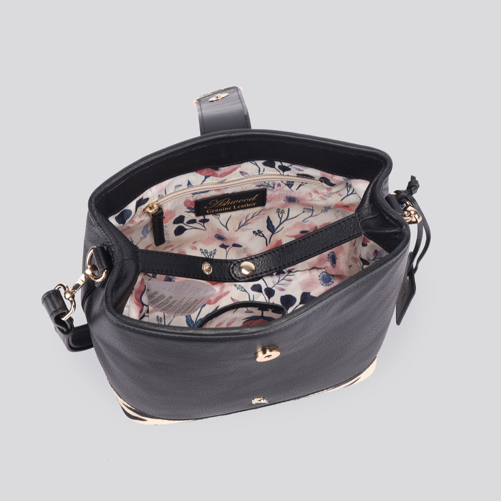 Set your style on point with the spacious bucket bag from Ashwood, crafted in leather and finished with striking contrast detailing for a bold, modern twist. Featuring a sleek front tab with metal ring detail and a floral jacquard lining, it's as practical as it is stylish. Perfect for everyday wear, city strolls or weekend outings, it offers versatile carrying options with its detachable, adjustable cross-body strap.