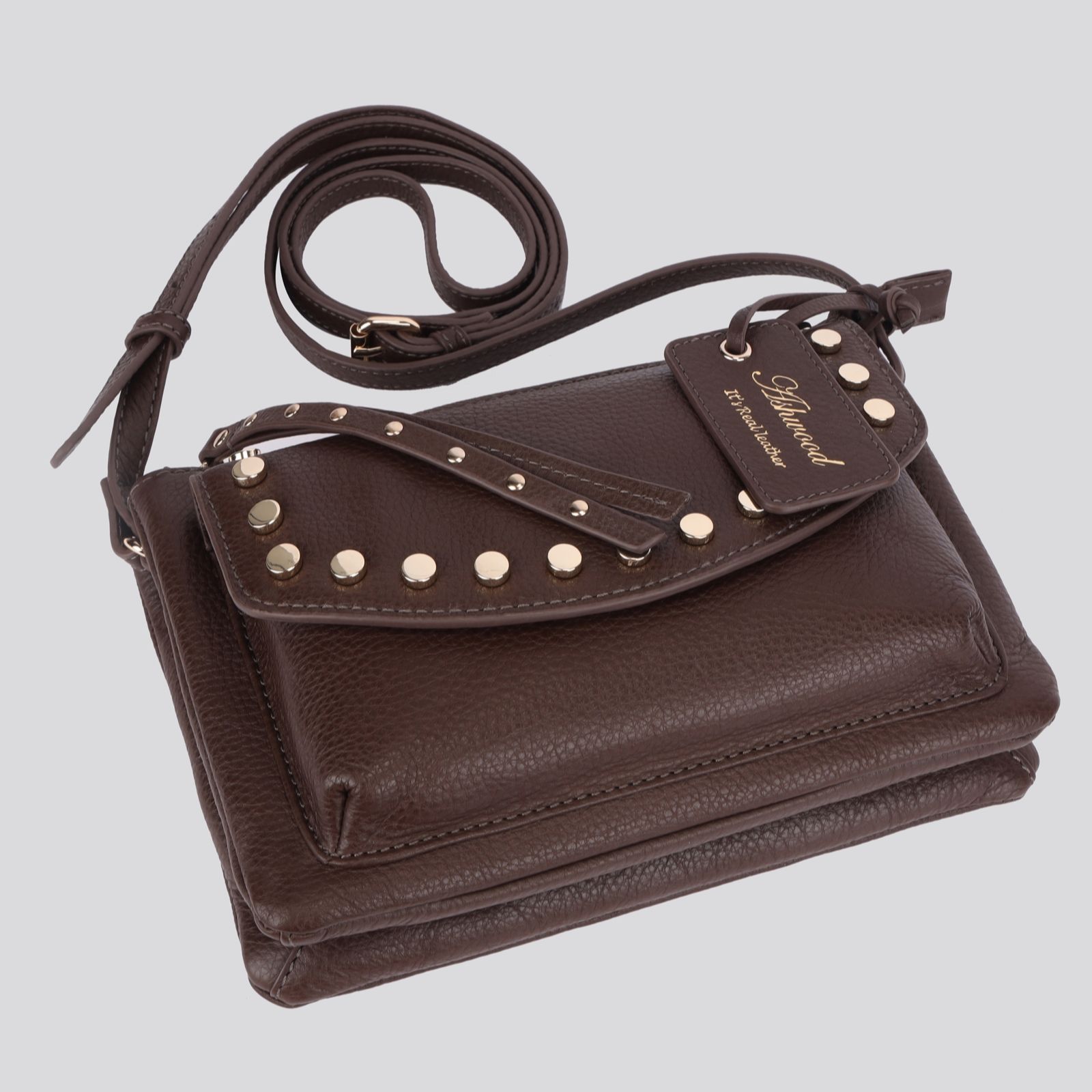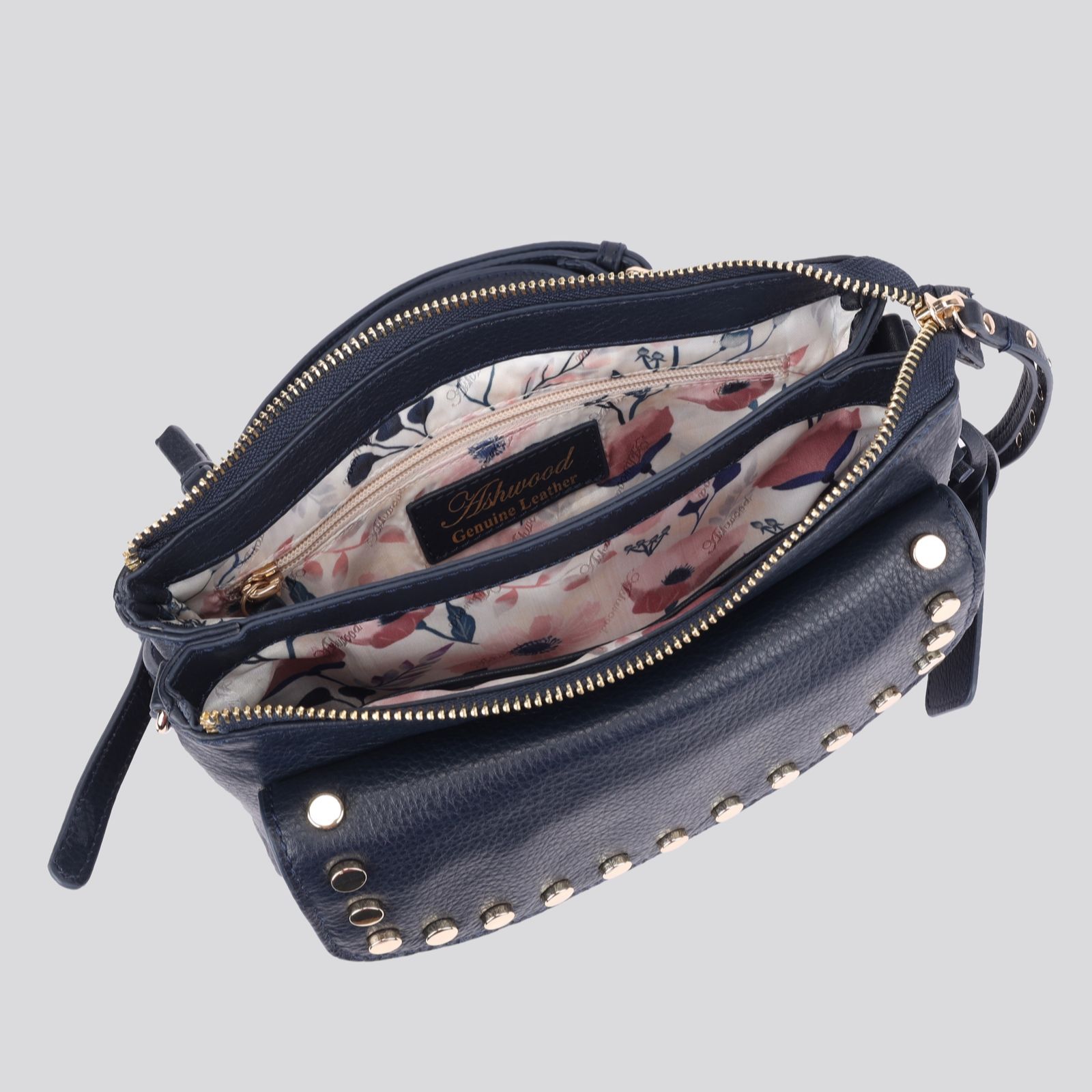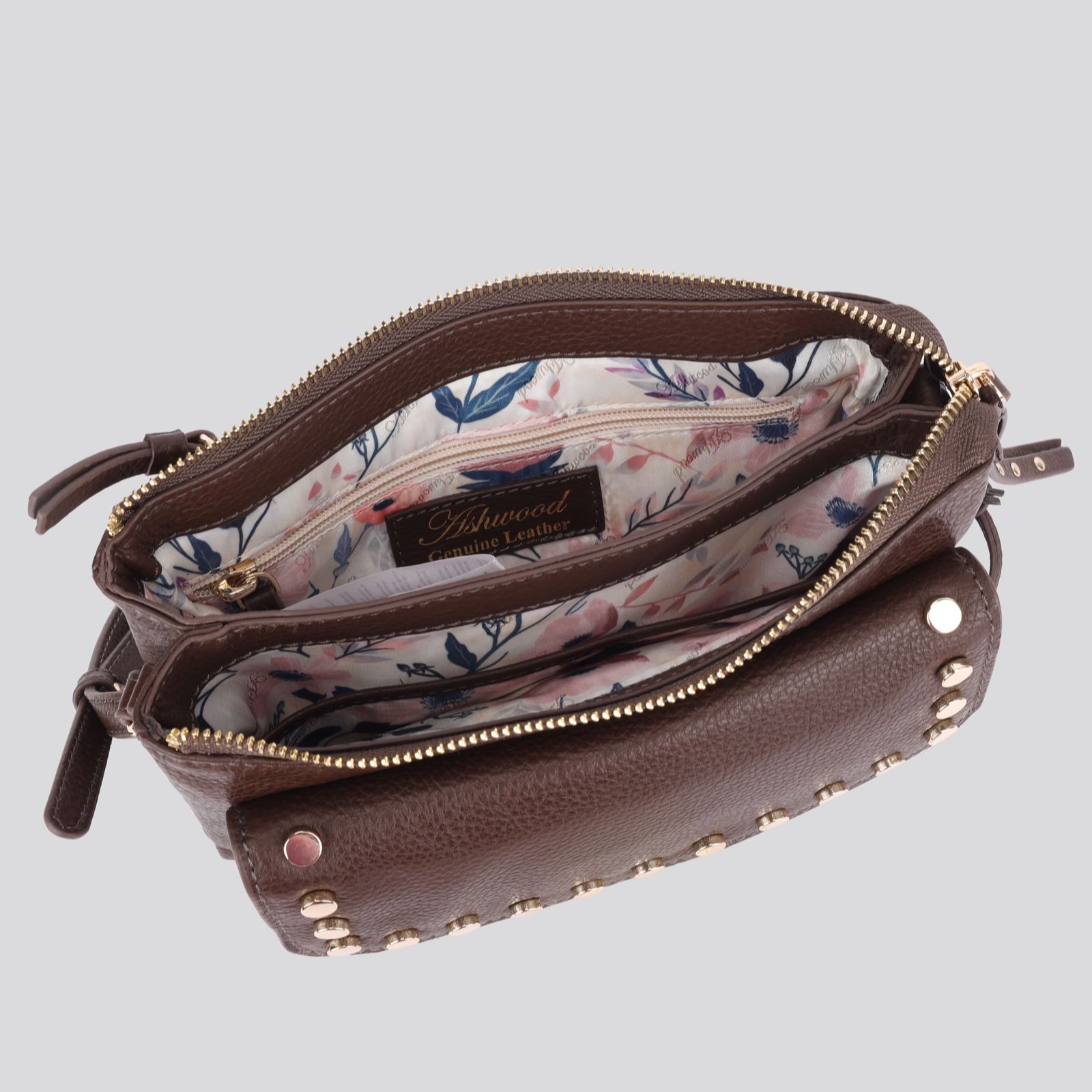 With its chic stud detail and luxurious genuine leather, this Ashwood crossbody bag brings a touch of elegance to everyday style. The floral jacquard lining adds a charming surprise, while twin compartments and practical pockets keep your essentials organised. Whether you're heading to brunch, running errands or enjoying an evening out, its adjustable strap ensures comfort and versatility wherever you go.
