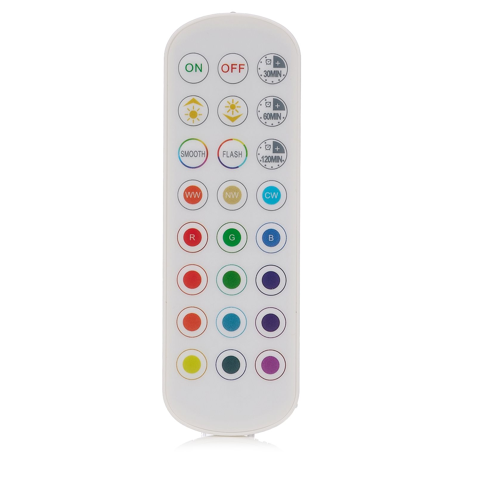 - Remote control for adjusting brightness, white temperature, static colours, colour changing mode and auto off timer