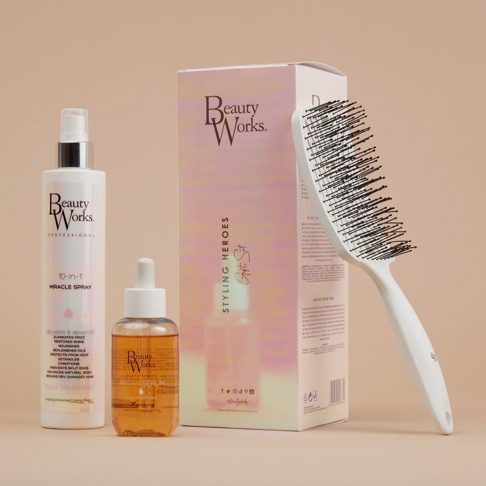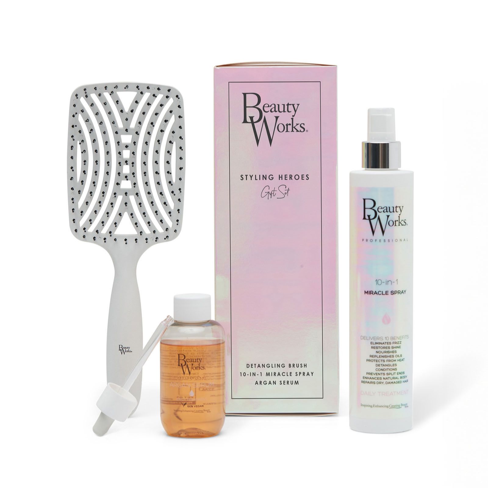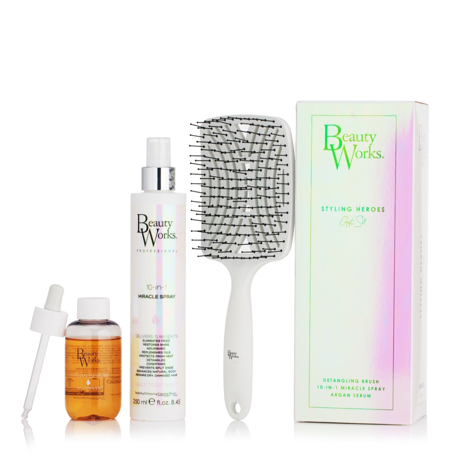 Unleash your best hair days with the Beauty Works Styling Heroes Gift Set, featuring three essentials to help enhance shine and protect against heat styling. This collection includes the bestselling 10-in-1 Miracle Spray, Argan Serum, and an exclusive detangling brush, making it ideal for everyday styling and keeping your hair looking smooth and manageable, whether youre prepping for a big event or refreshing your routine.