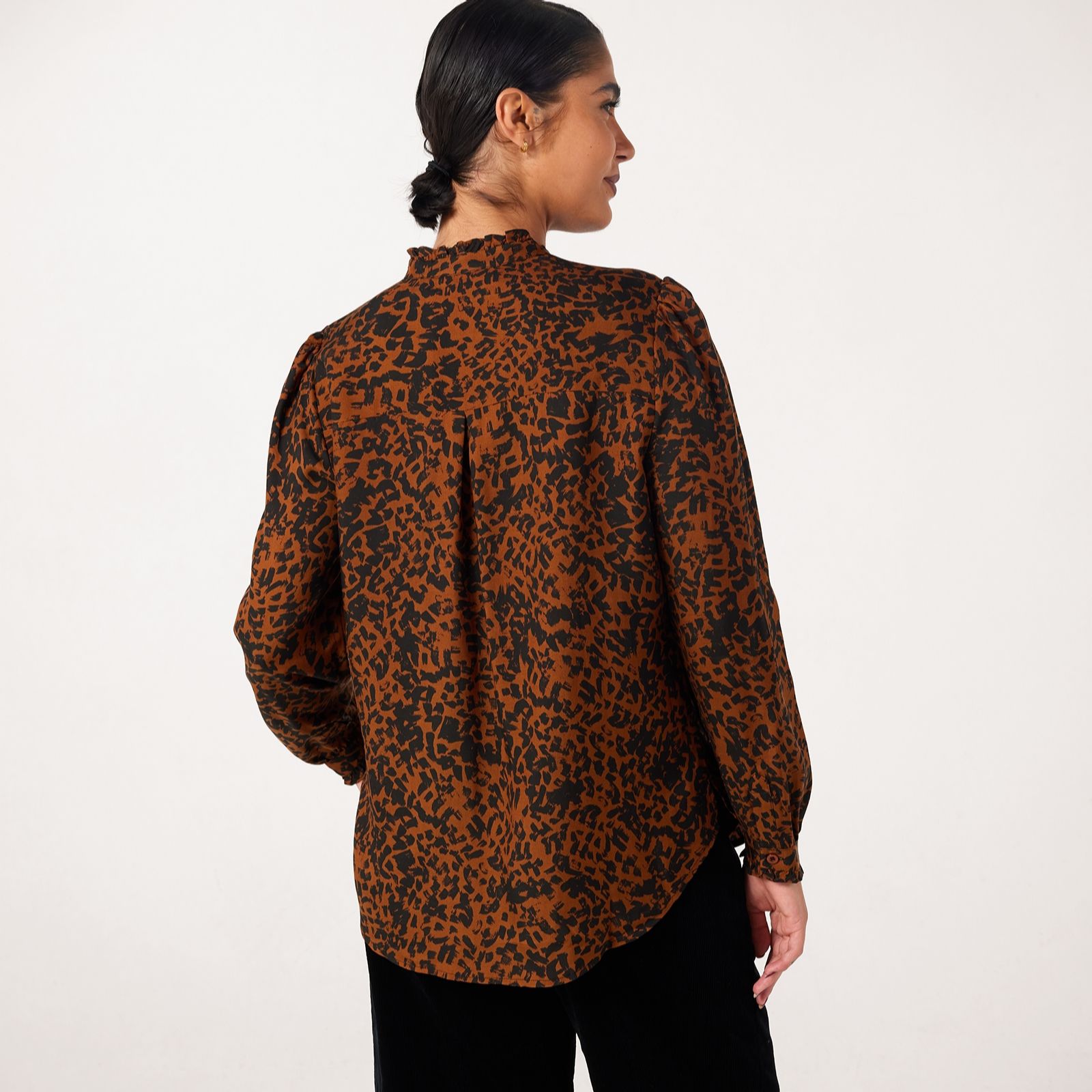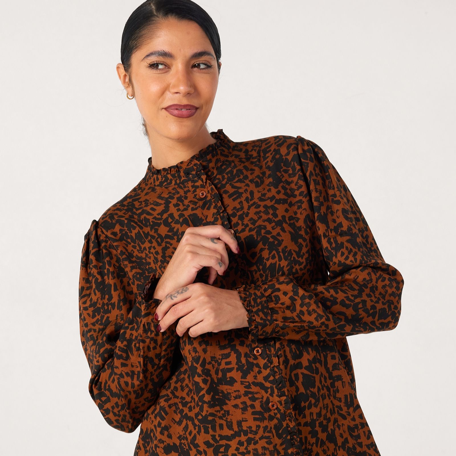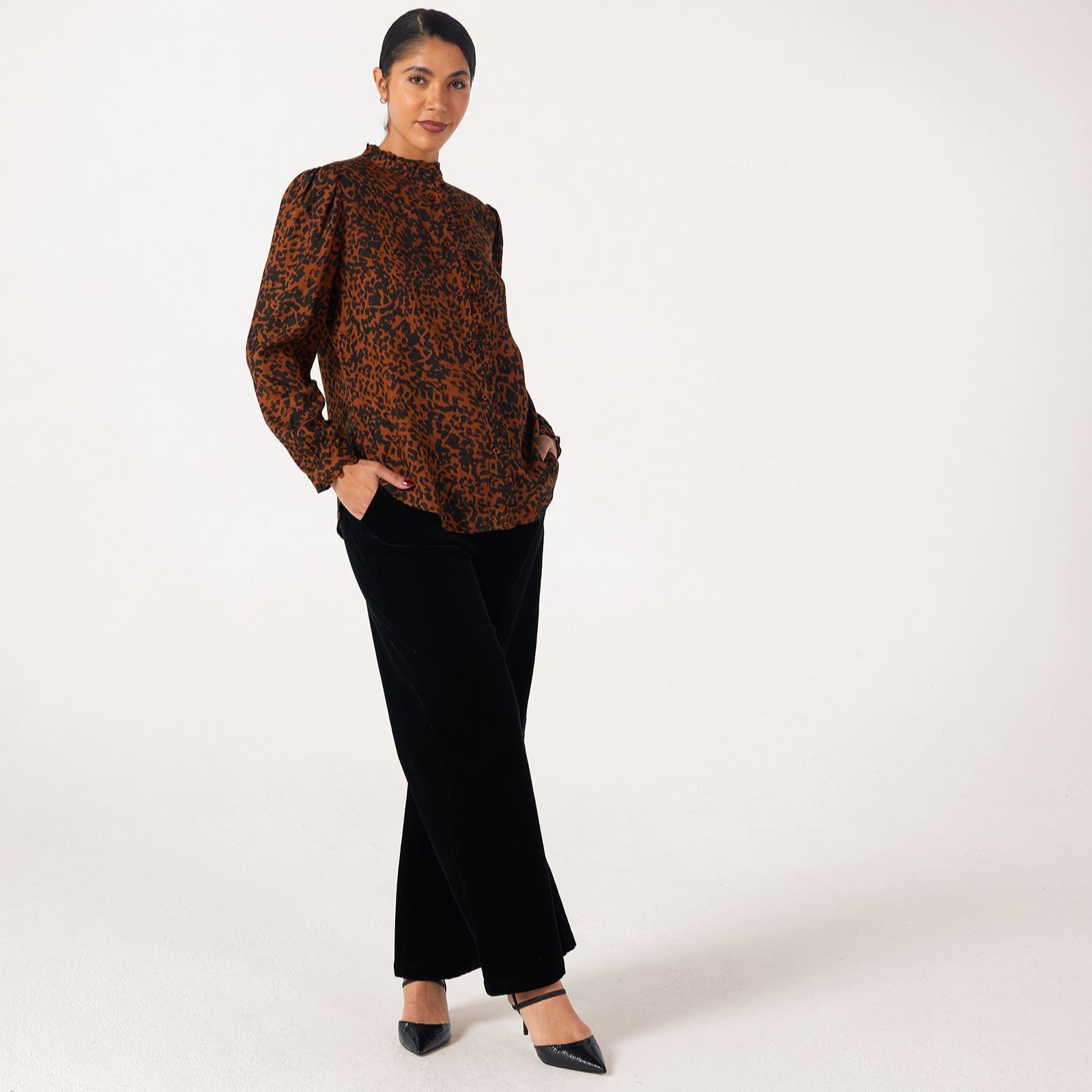 Embrace statement style with the printed ruffle front blouse from Ben de Lisi, where the glamorous leopard print and flowing ruffle detail create an eye-catching silhouette. The curved hem, crisp cuffs and button-through front add a tailored finish, making this blouse a chic companion for both work and weekends. For a contemporary look, wear it tucked into high-rise jeans or layered under a blazer.