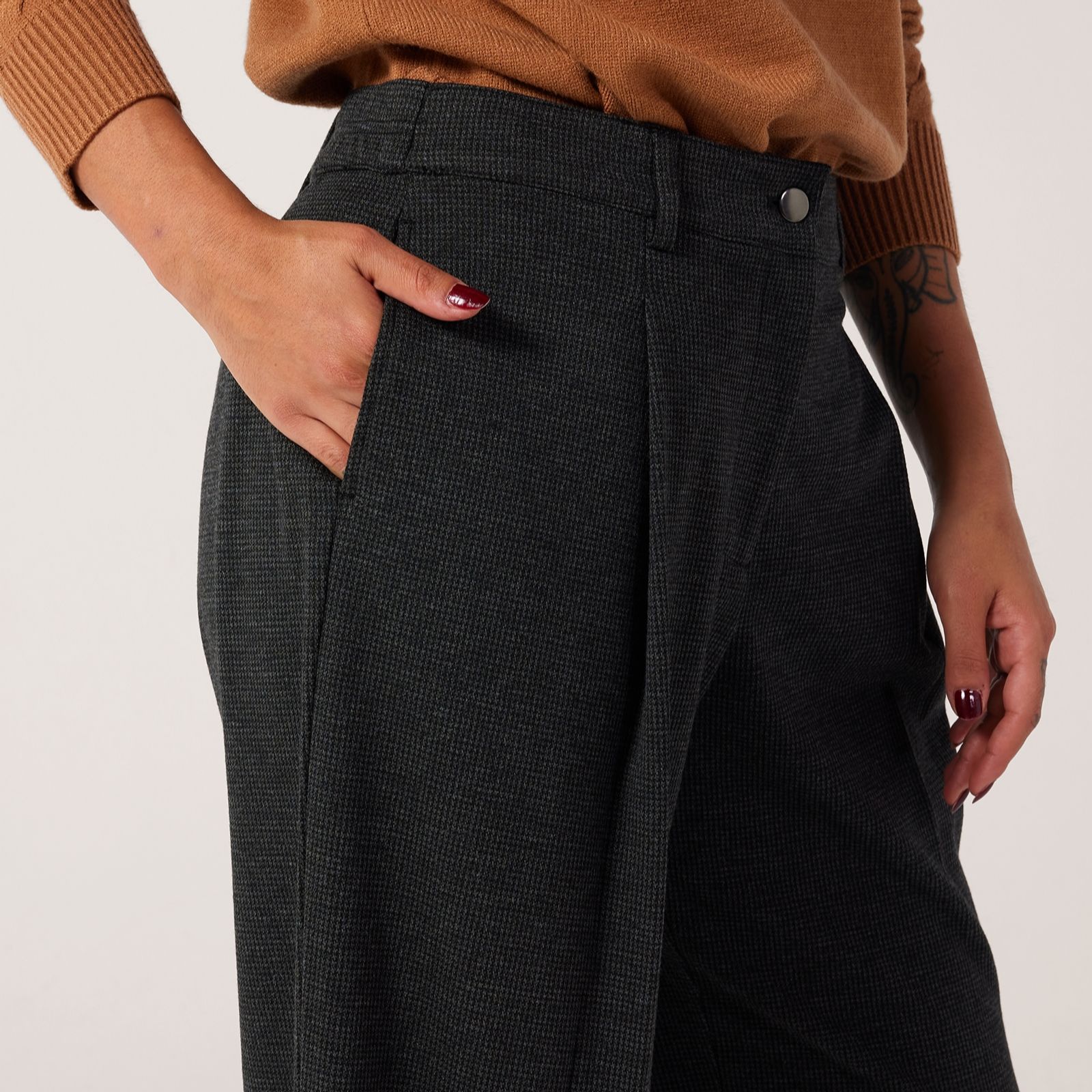 Experience the effortless sophistication of Ben de Lisi's puppytooth standard wide-leg trousers, designed to bring a touch of classic charm to your wardrobe. With a sleek, wide-leg silhouette, front knife pleats and an elasticated waistband, these trousers are perfect for everything from busy workdays to relaxed weekend outings. Pair them with a crisp white blouse and ankle boots for a chic, polished look.
