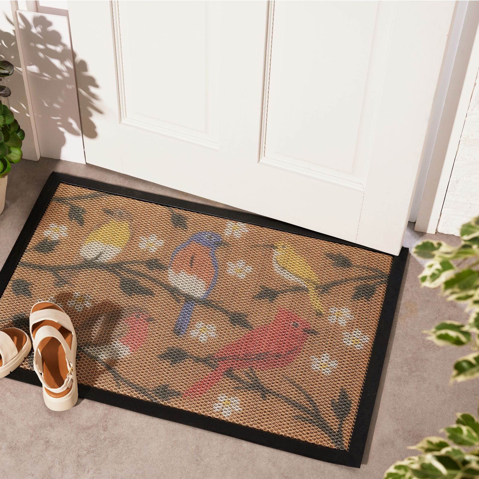 - this doormat is available in five different prints - Bird Print, Brown Scroll Frame, Flower Print, Grey Scrollwork Print or