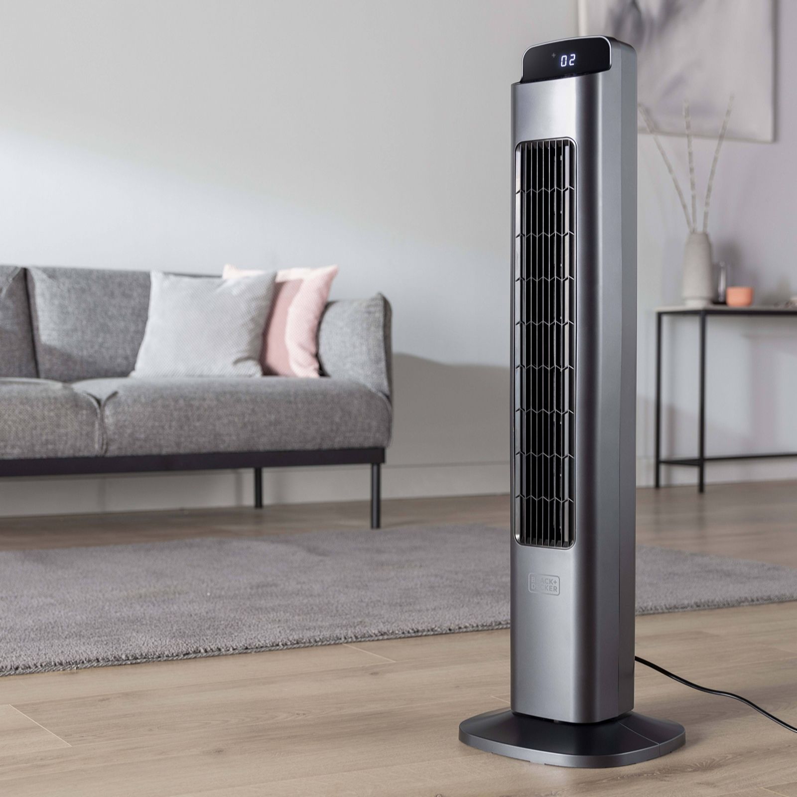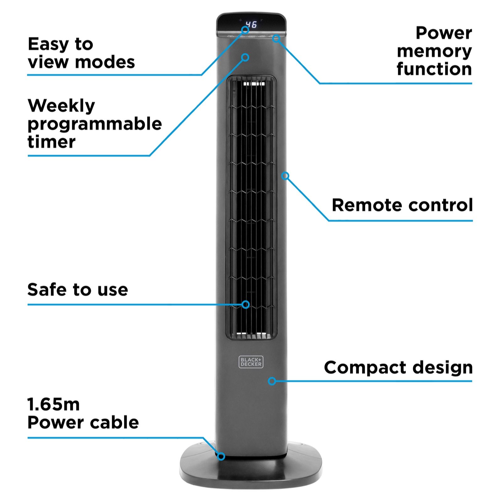 Stay cool and in control all summer long with the Black and Decker 36" Smart Tower Fan, where sleek design meets smart home living. Effortlessly set cooling schedules via the Black and Decker Home App, and enjoy tailored comfort thanks to five speed settings and multiple airflow modes, all while the 80 degree oscillation ensures every corner of your room feels refreshed.