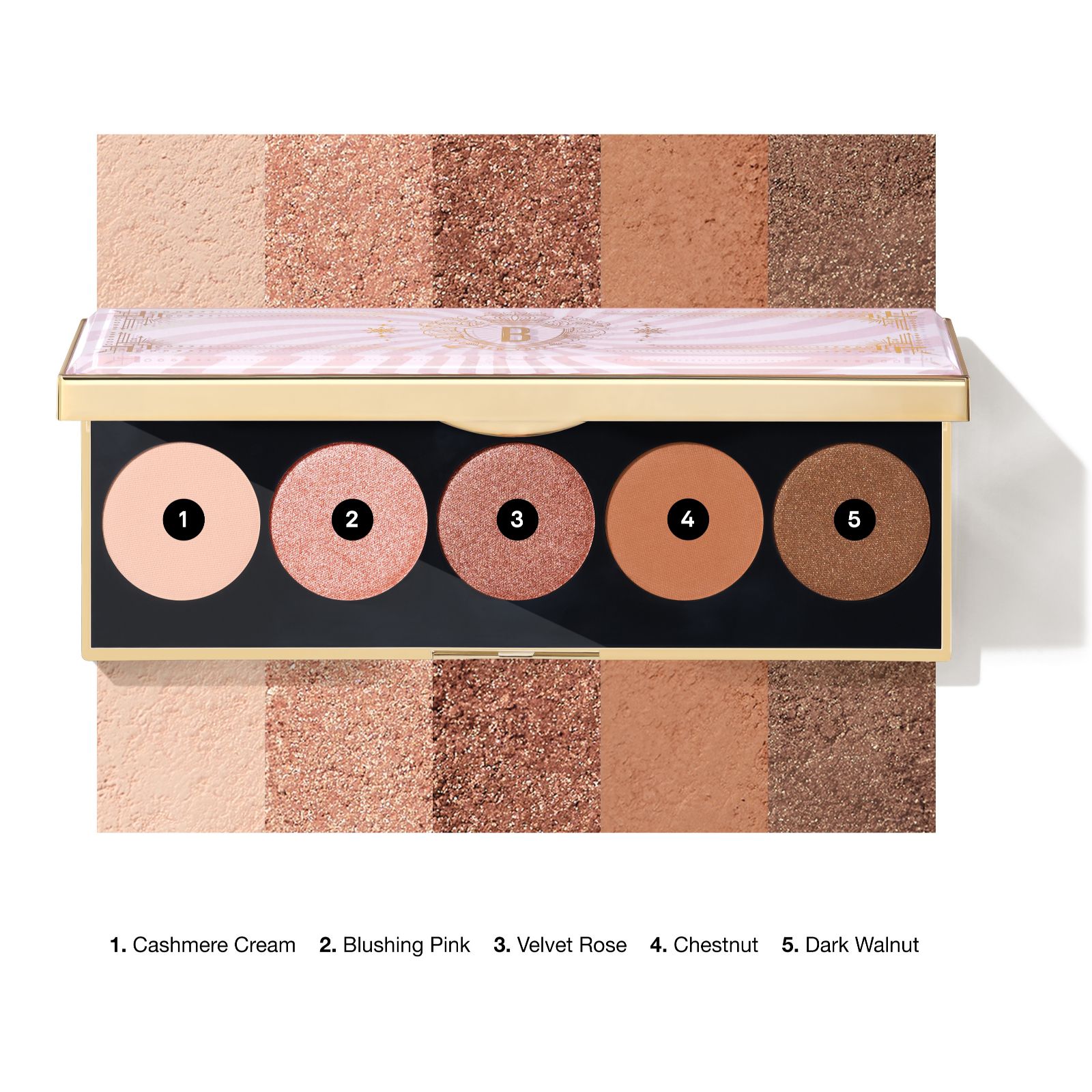 - 1 x Bobbi Brown Pink Mirage Eye Shadow Palette (6.5g total, 1.3g each) in: Cashmere Cream (warm cream), Blushing Pink (medium warm pink), Velvet Rose (rosy pink mauve), Chestnut (warm medium brown) and Deep Walnut (deep brown)