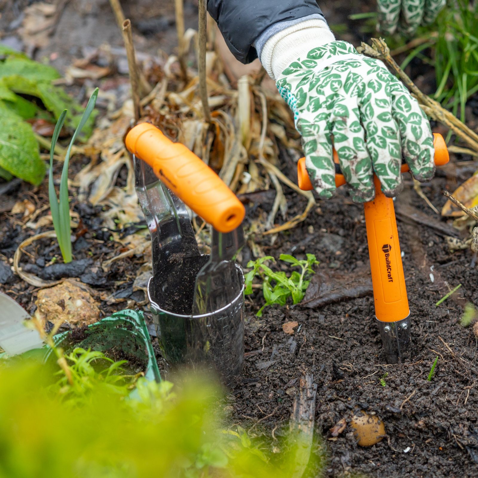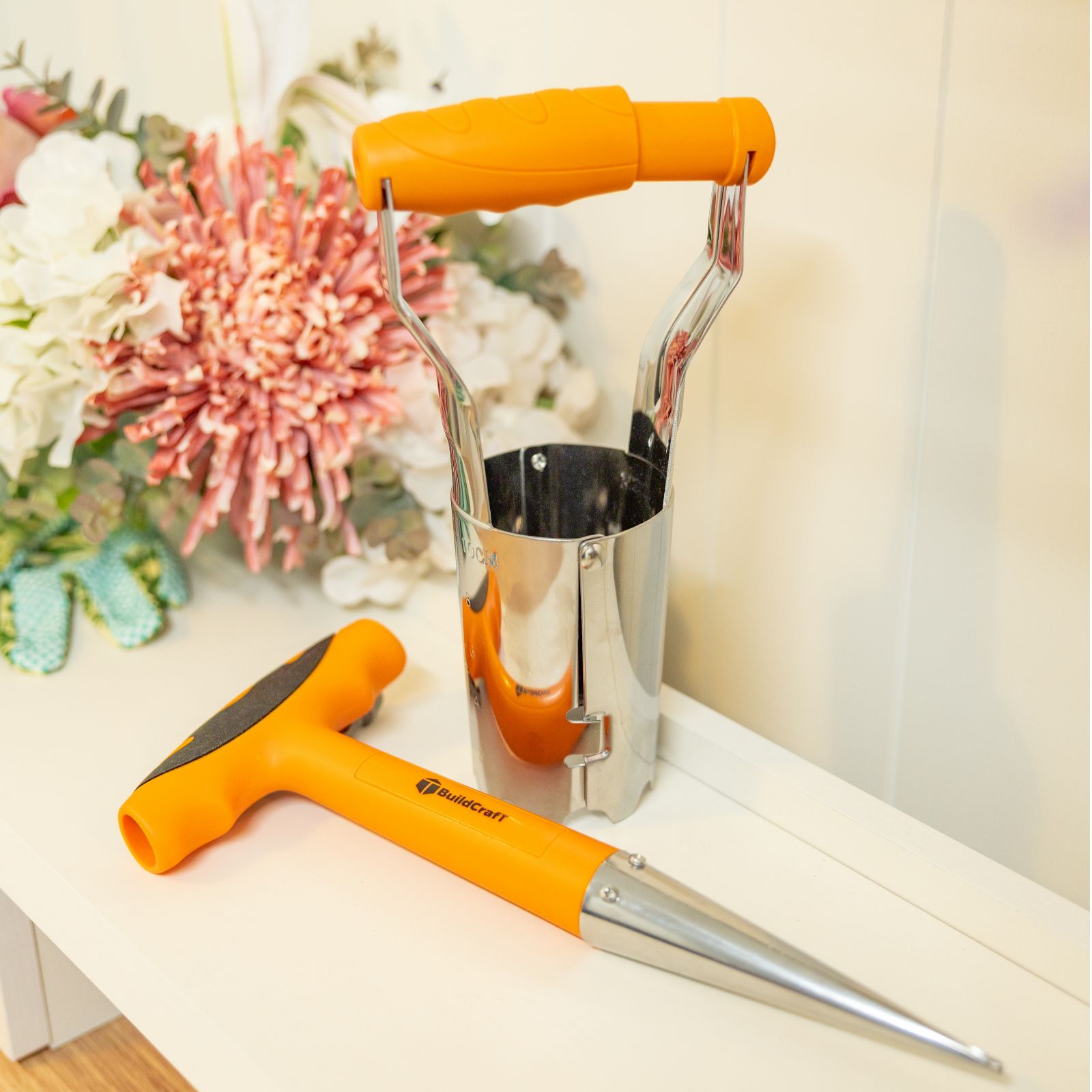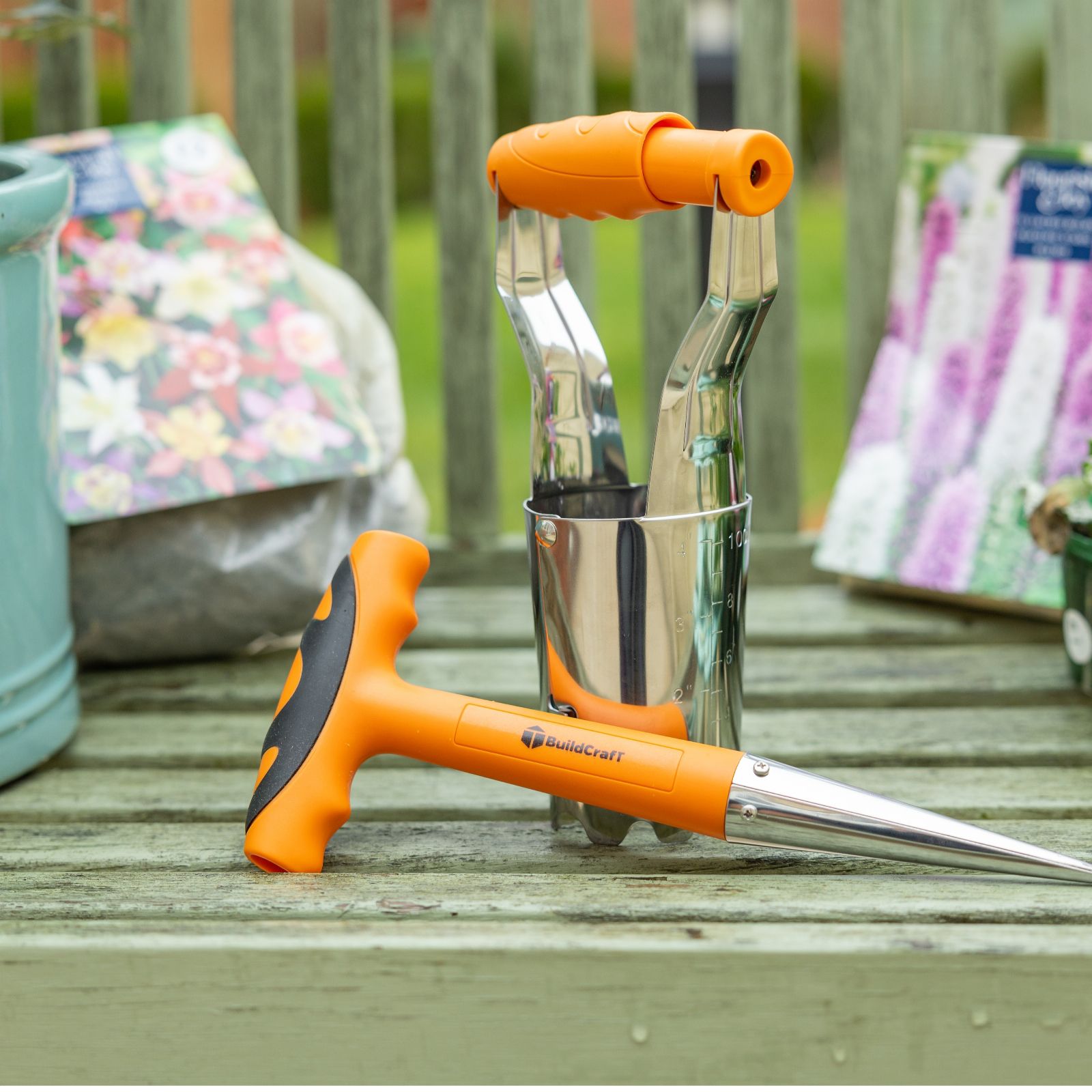 Get your garden ready for planting with the Buildcraft two-piece Seed & Bulb Planter Set. This set features a garden dibber and a garden bulb planter, both designed to make planting easier and more efficient with their ergonomic handles. The garden bulb planter includes an automatic soil release mechanism to speed up the planting process, while the dibber is ideal for creating holes for seeds. Both tools feature reinforced steel handles for durability and serrated edges to cut through soil effortlessly.
