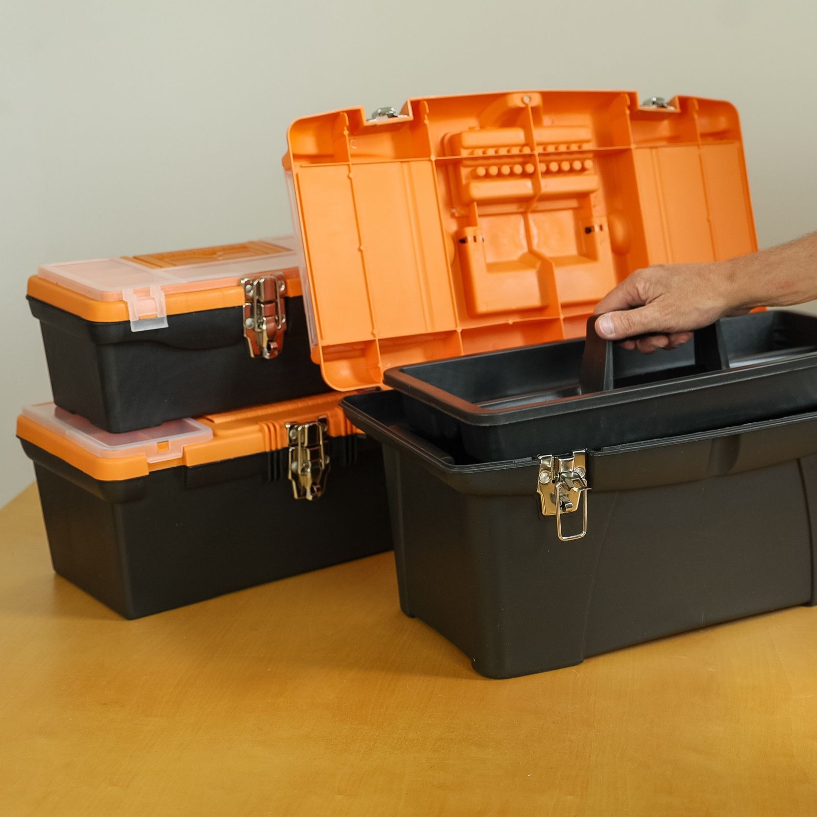 Upgrade your tool storage with this set of three tool boxes from Buildcraft. This versatile collection includes a small, medium and large tool box, perfect for organising and transporting various-sized tools and equipment. Each equipped with a carry handle for easy transportation, they also feature removable interior trays, transparent storage compartments and strong metal latches. We couldn't think of a better way to store all your go-to tools and DIY accessories.