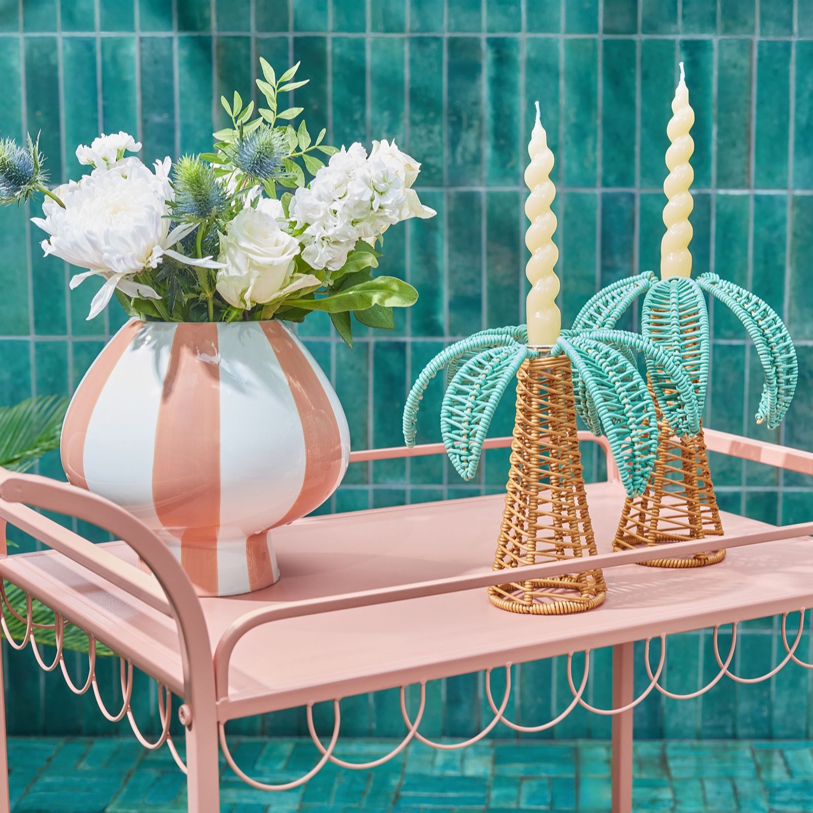 Bring a touch of tropical charm to your home with this set of two palm tree-style rattan candle holders from BundleBerry by Amanda Holden. Available in Sage Green or Raisin, their intricate woven design adds warmth and texture, perfect for creating an inviting glow indoors or outdoors. Use them to dress up your dining table, patio or cosy corner for a stylish, atmospheric finish.