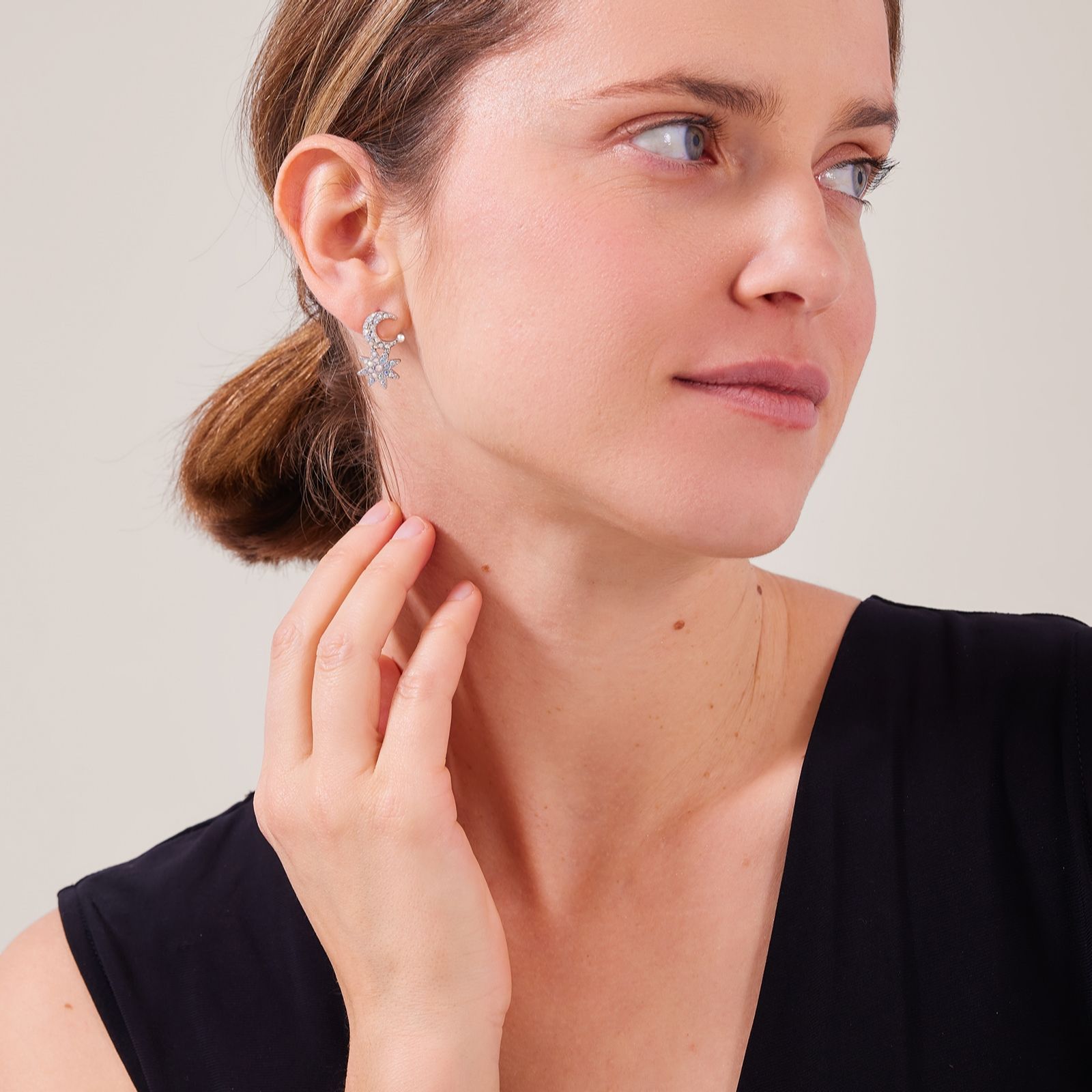 Glow with celestial charm in the Butler & Wilson moon & star earrings, adorned with sparkling Austrian crystals that capture the magic of the night sky. Featuring luminous crescent moons and twinkling stars, this enchanting design symbolises dreams and endless wonder. Crafted from nickel-free base metal and secured with a comfortable stud fastening, they're perfect for adding a whimsical touch to any outfit.