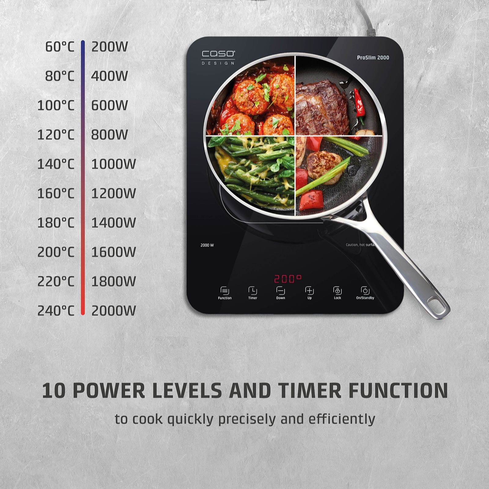Power up your cooking wherever you are with the CASO Design ProSlim 2000 portable induction hob, blending sleek modern design with impressive functionality. Its ultra-slim, all-glass surface and built-in safety features make it perfect for home kitchens, holidays or even keeping dishes warm at the table. With 10 power levels up to 2000W and adjustable temperatures up to 240C, it offers rapid heat and precise control for every culinary occasion.