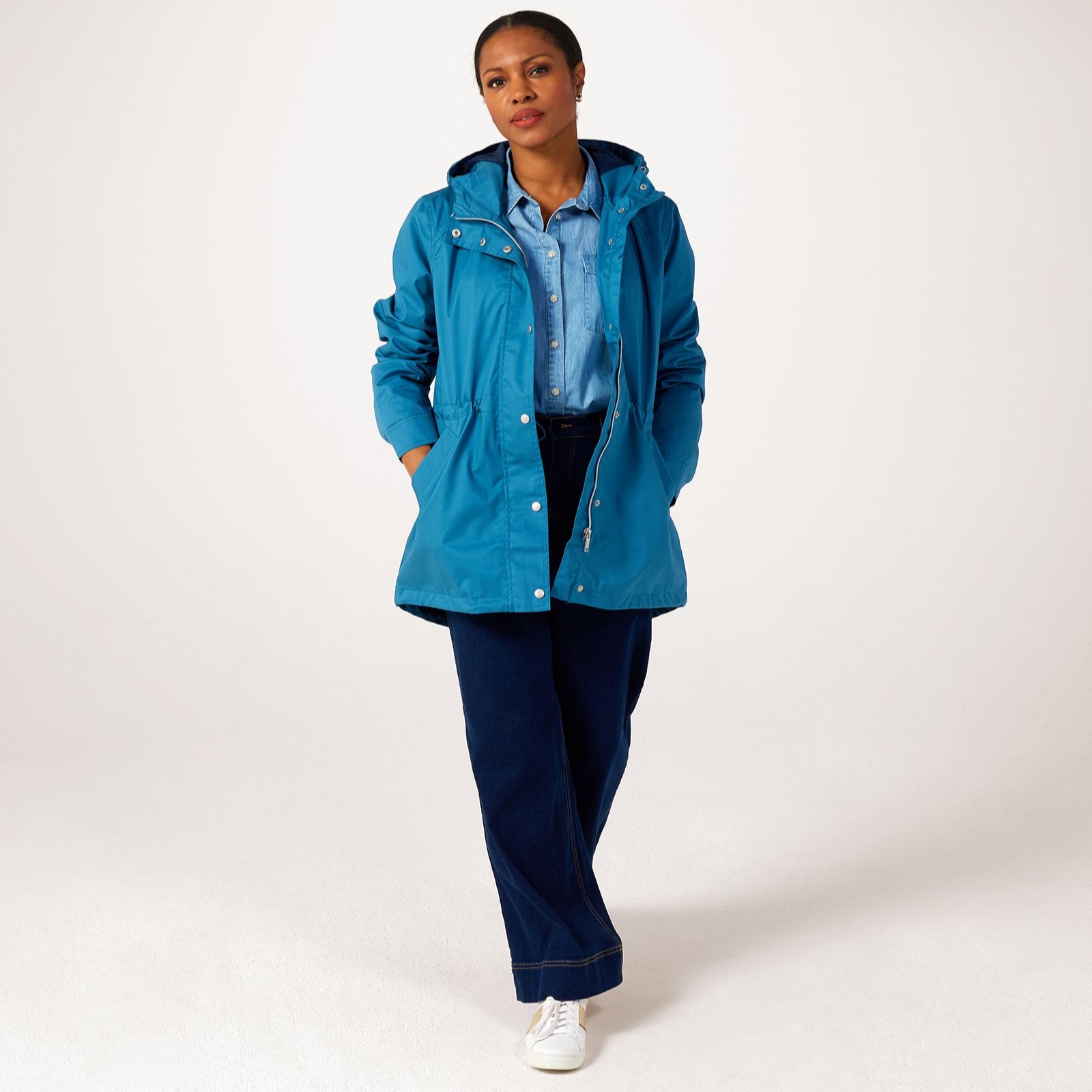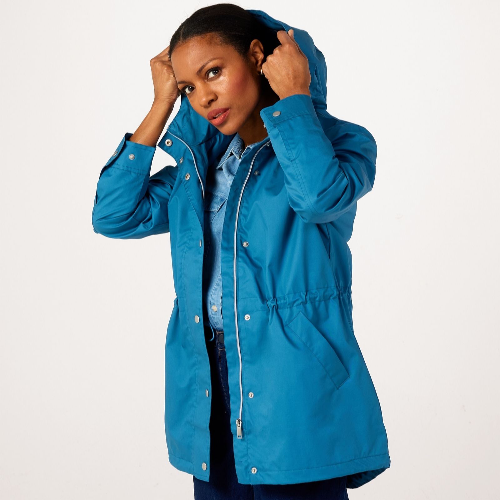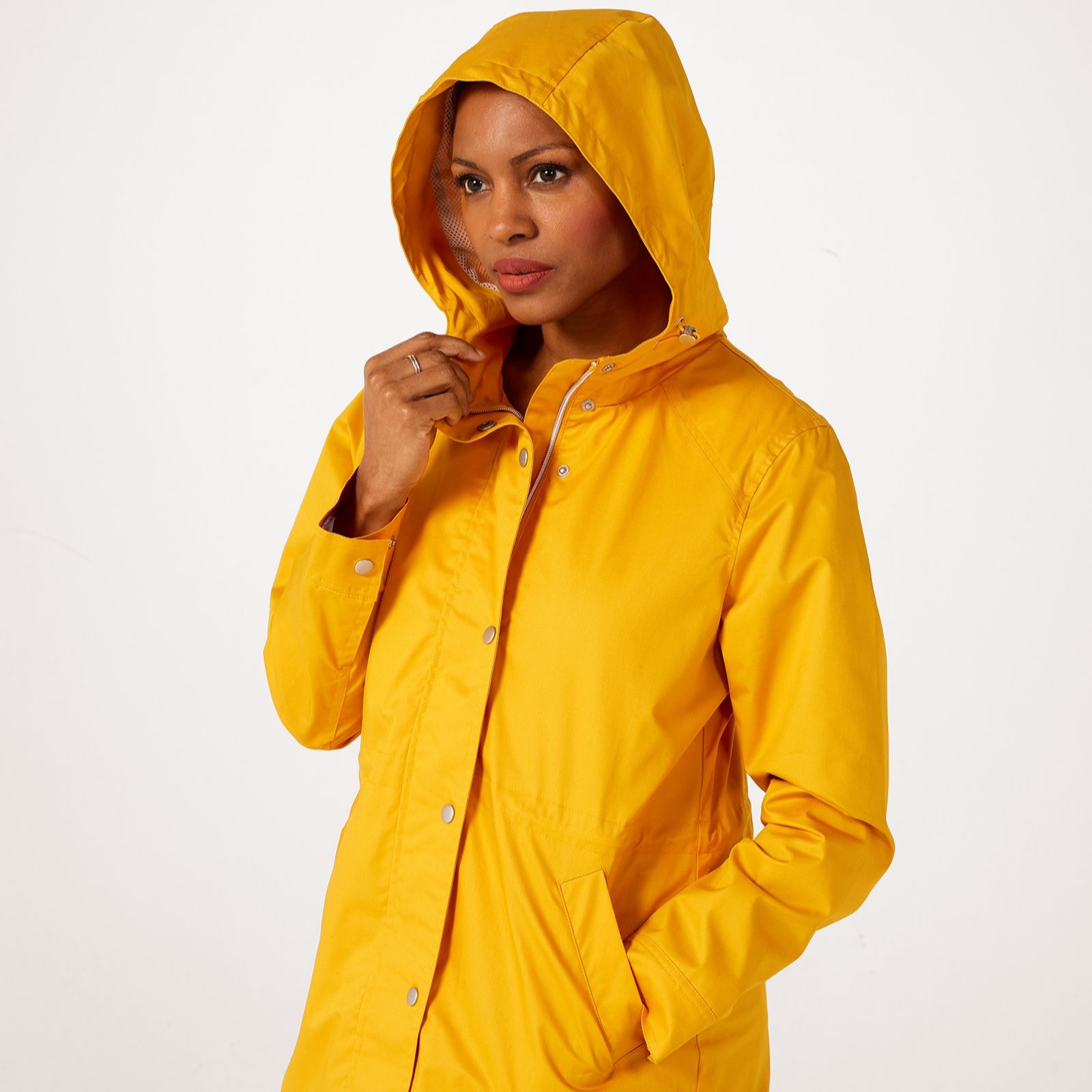 with this rain-resistant coat, there's no compromise on style, thanks to the sleek metallic touches of the snap fastenings and flattering shape, complete with a clever drawstring waist to give you a silhouette you'll love.