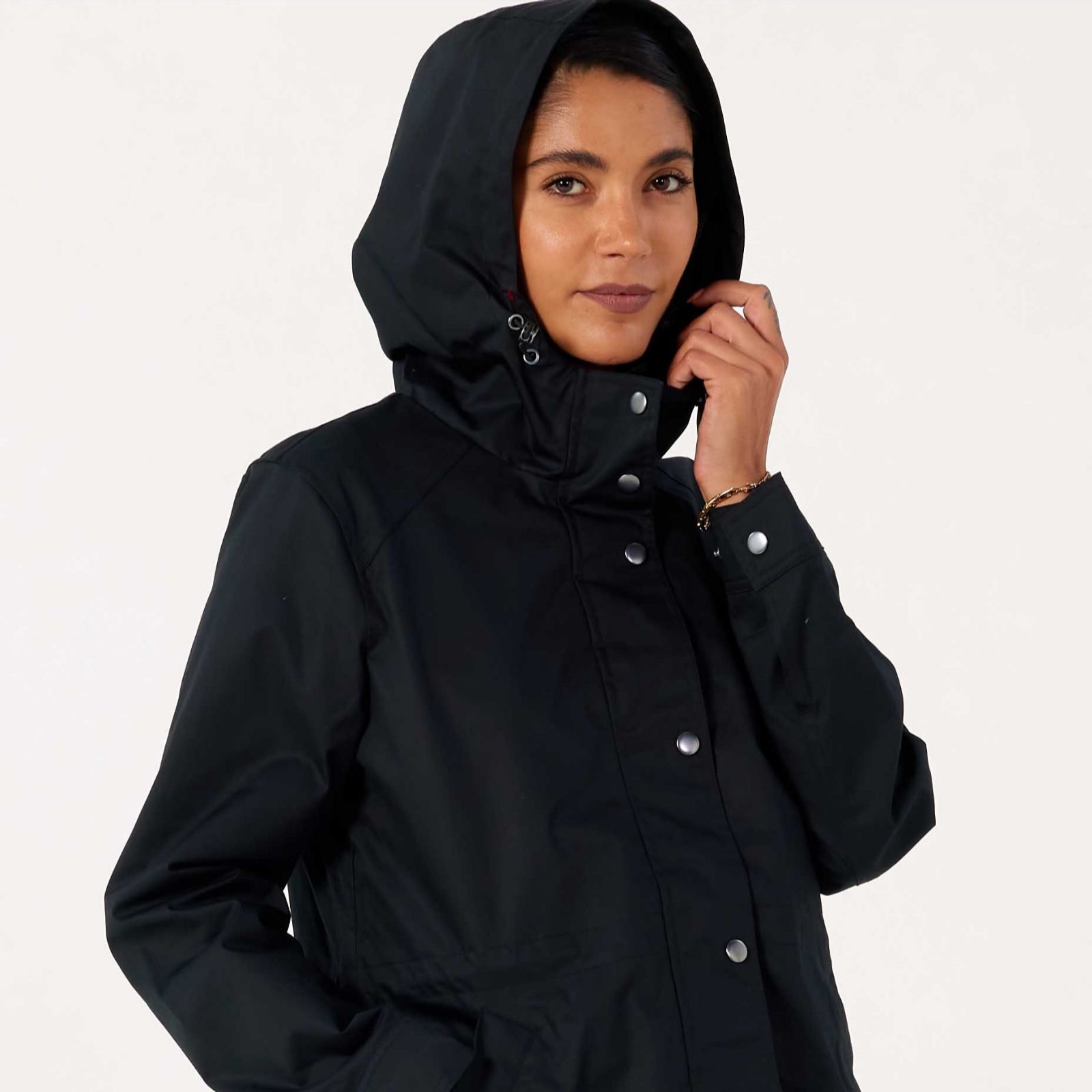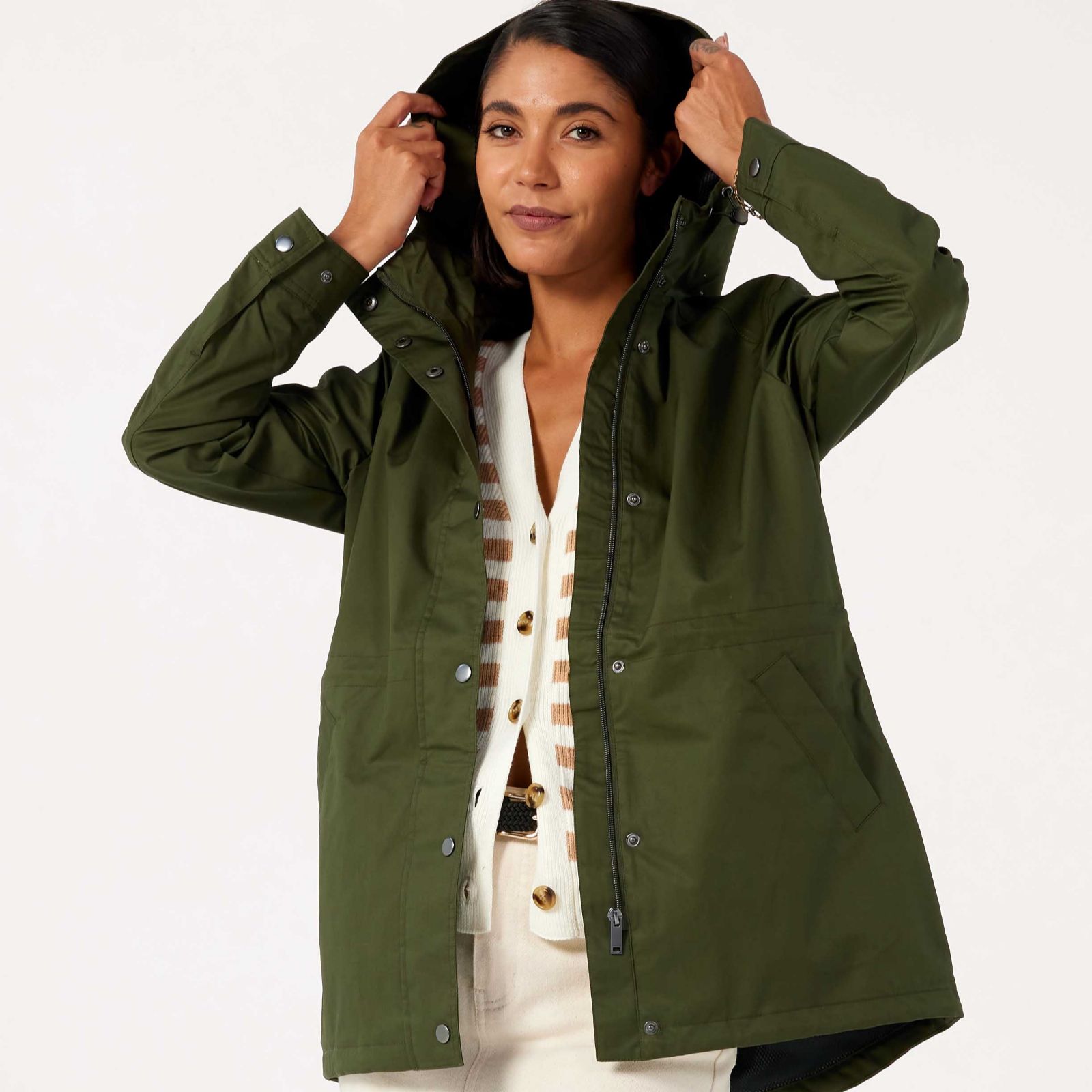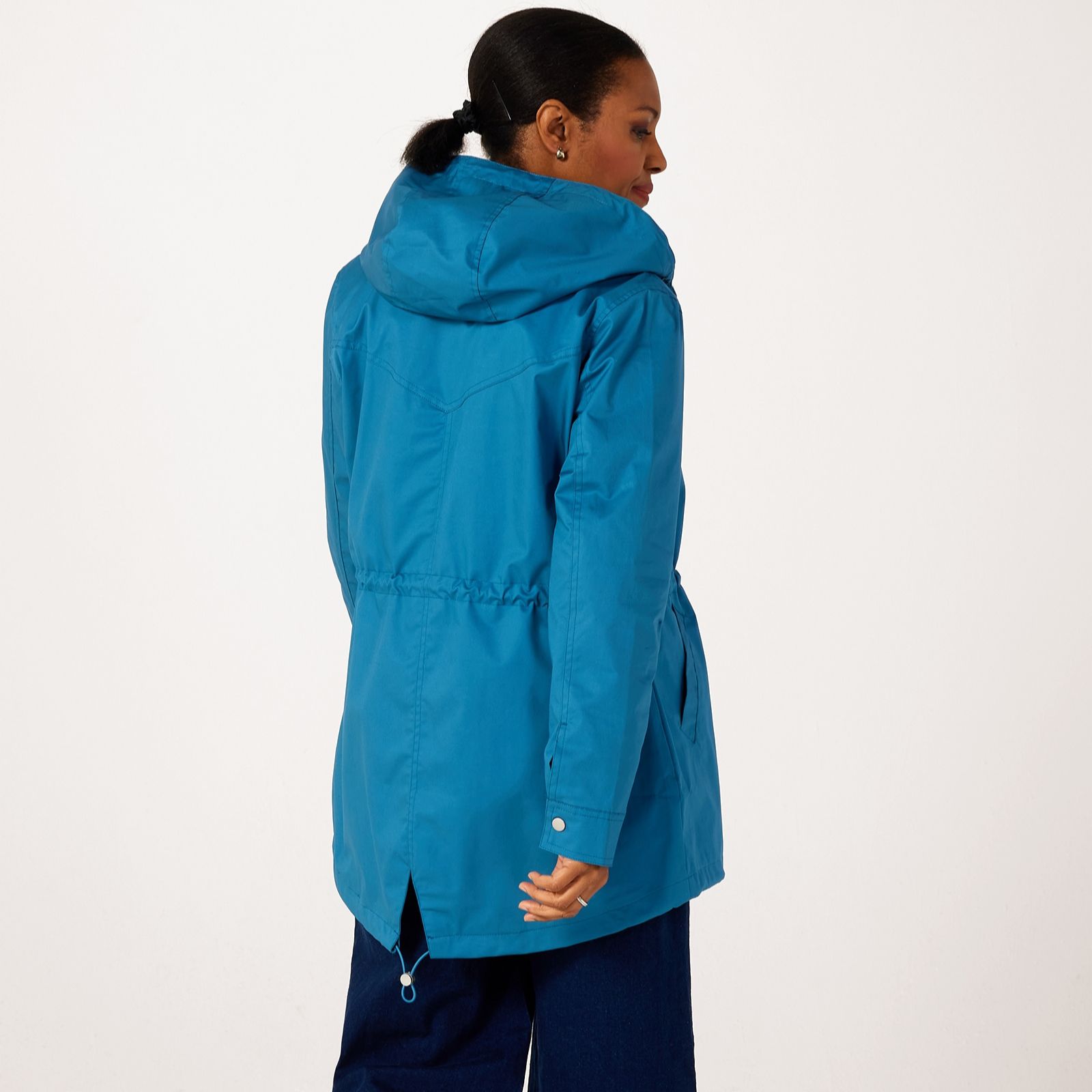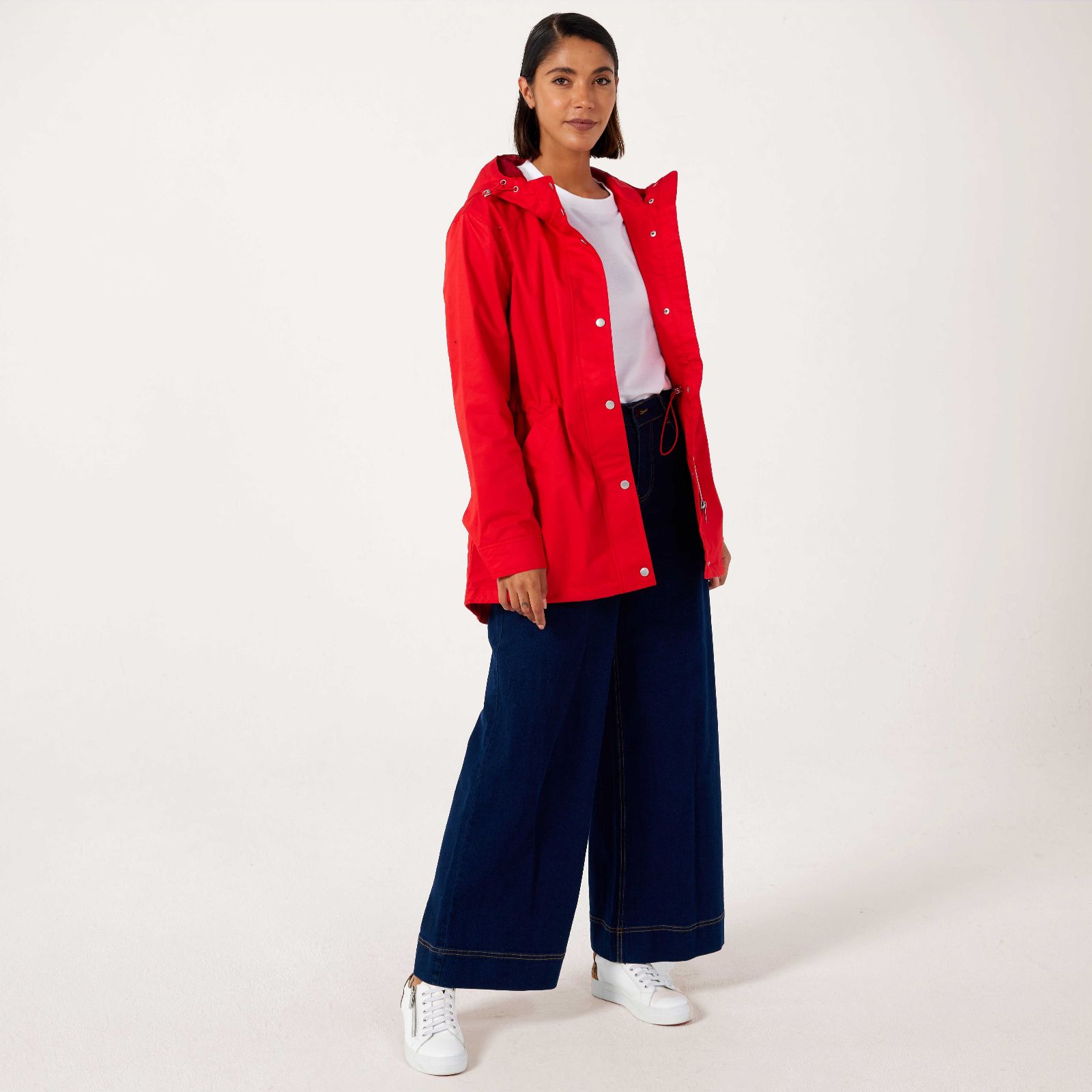 with this rain-resistant coat, there's no compromise on style, thanks to the sleek metallic touches of the snap fastenings and flattering shape, complete with a clever drawstring waist to give you a silhouette you'll love.