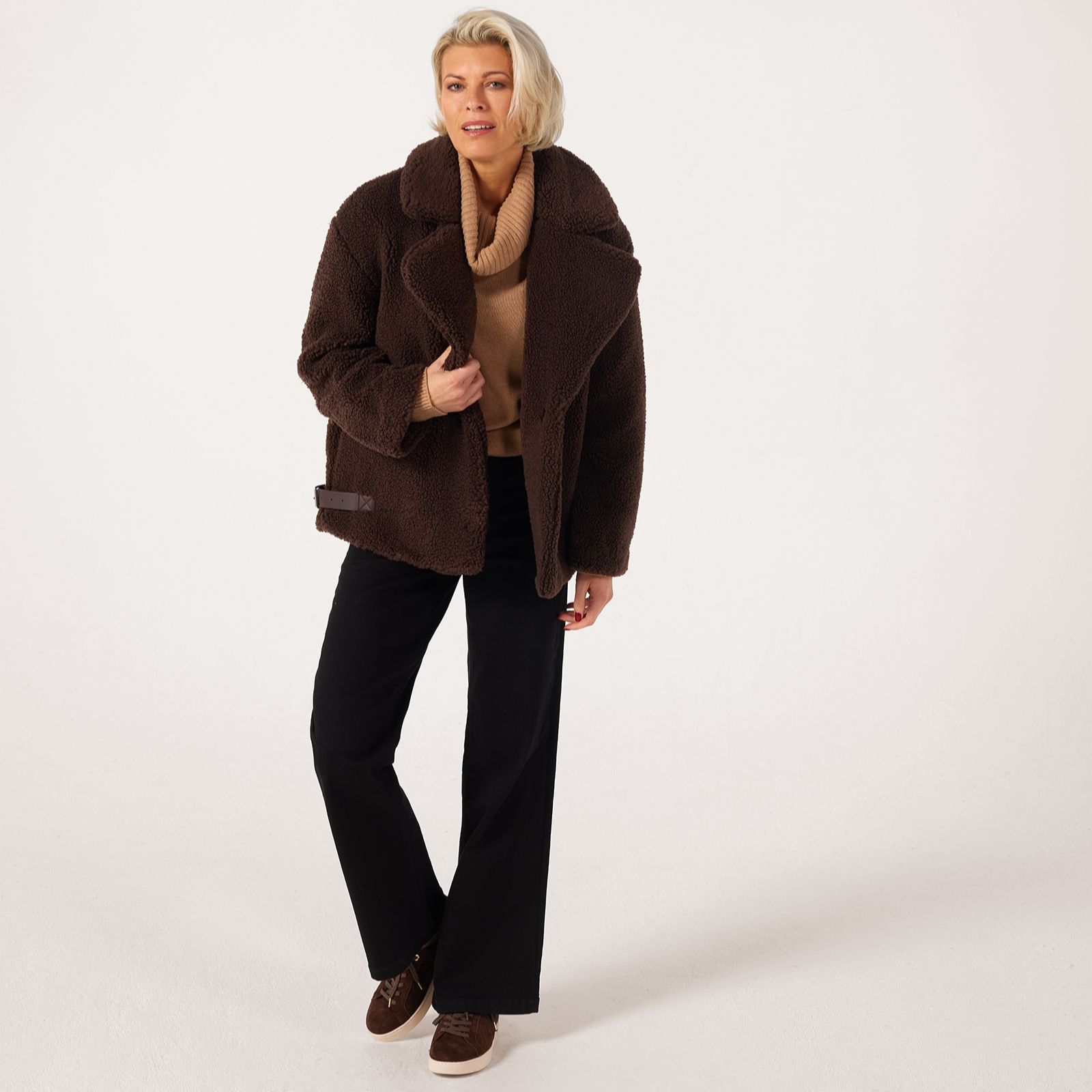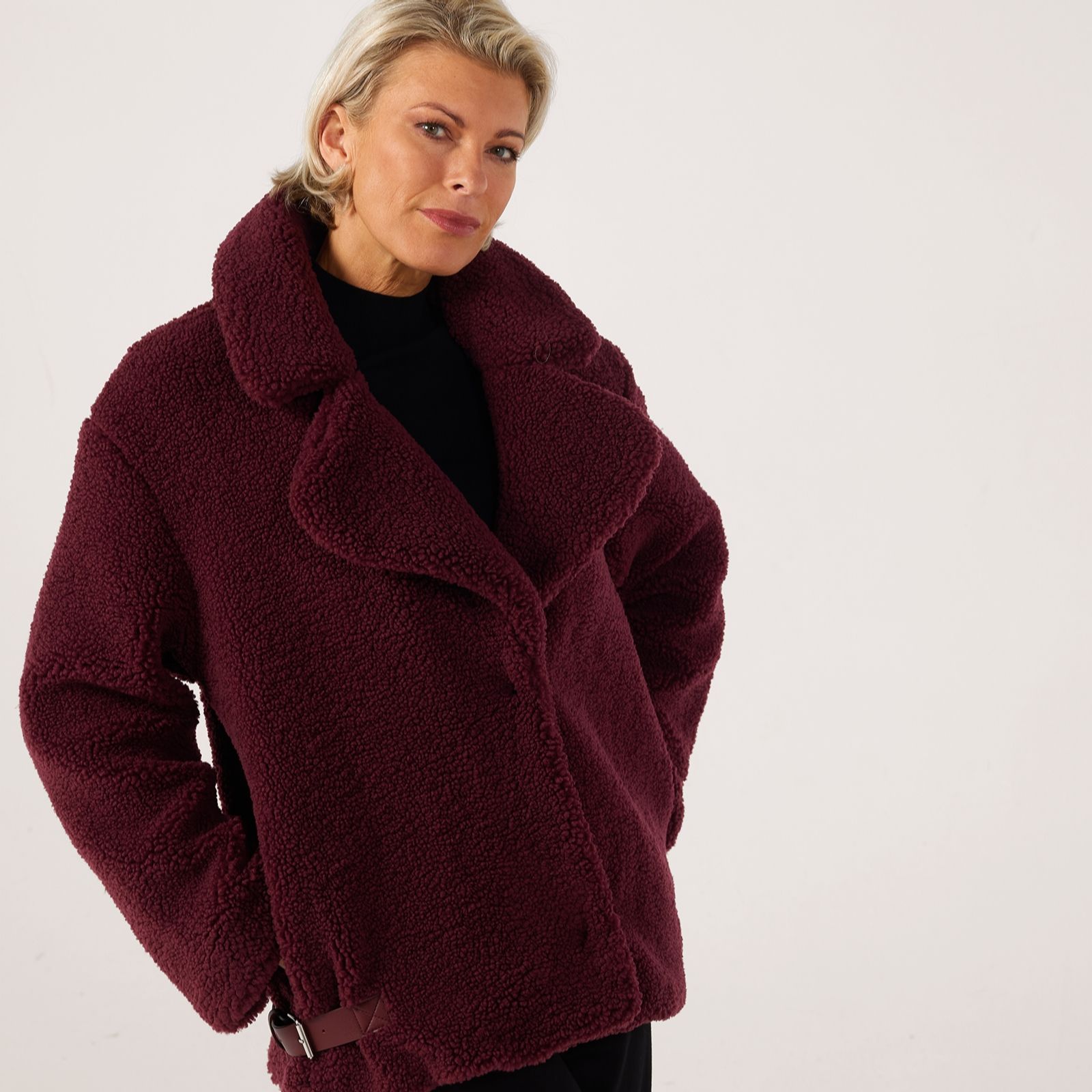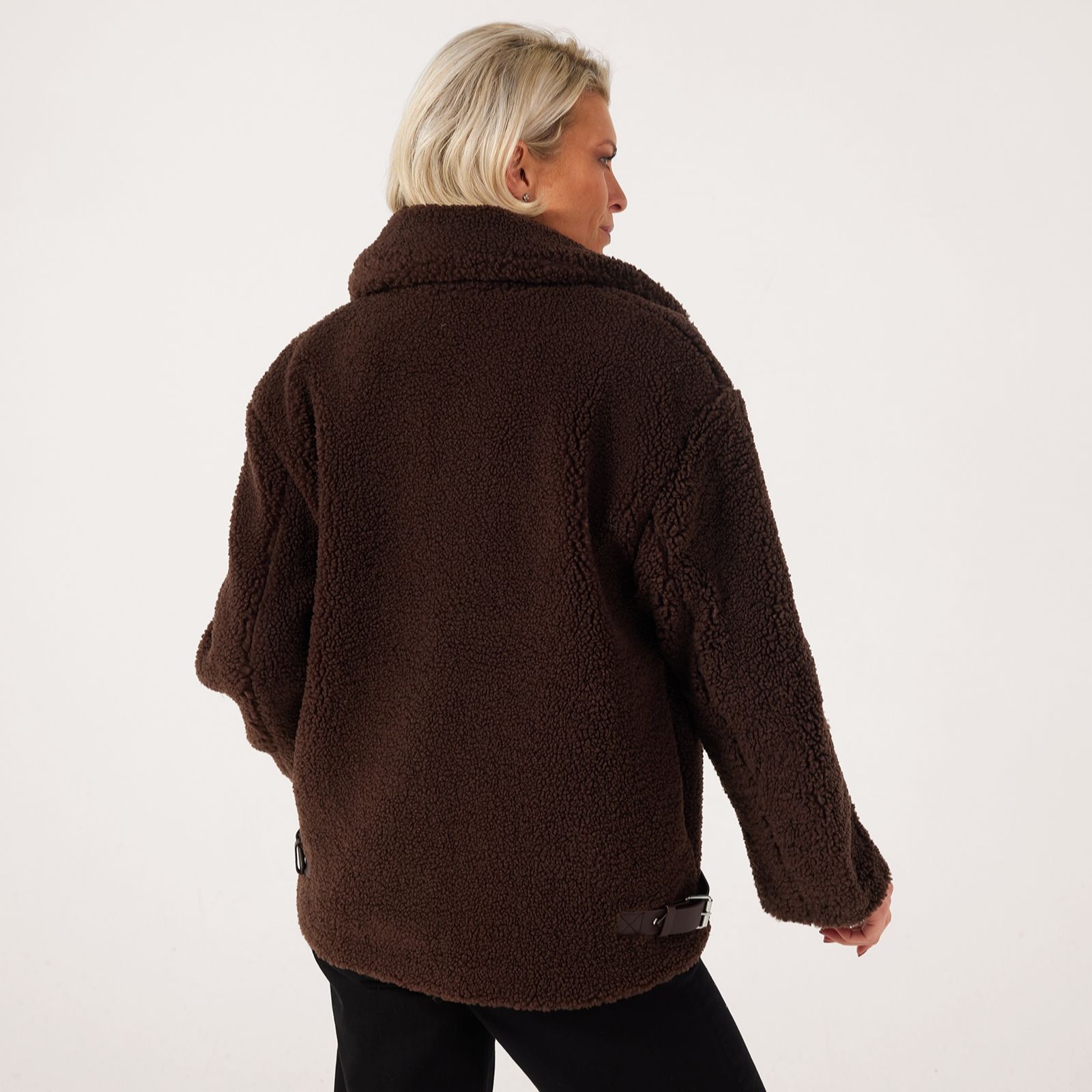 Wrap yourself in cosy sophistication with the Centigrade Teddy Mid Length Coat, crafted in a soft teddy borg fabric thats perfect for braving crisp autumn air. The concealed popper fastening keeps the look sleek, while buckle trim detailing at the side hem adds a subtle edge. Ideal for everything from weekend walks to coffee catch-ups, it pairs beautifully with slim trousers and ankle boots for an effortlessly chic layered look.