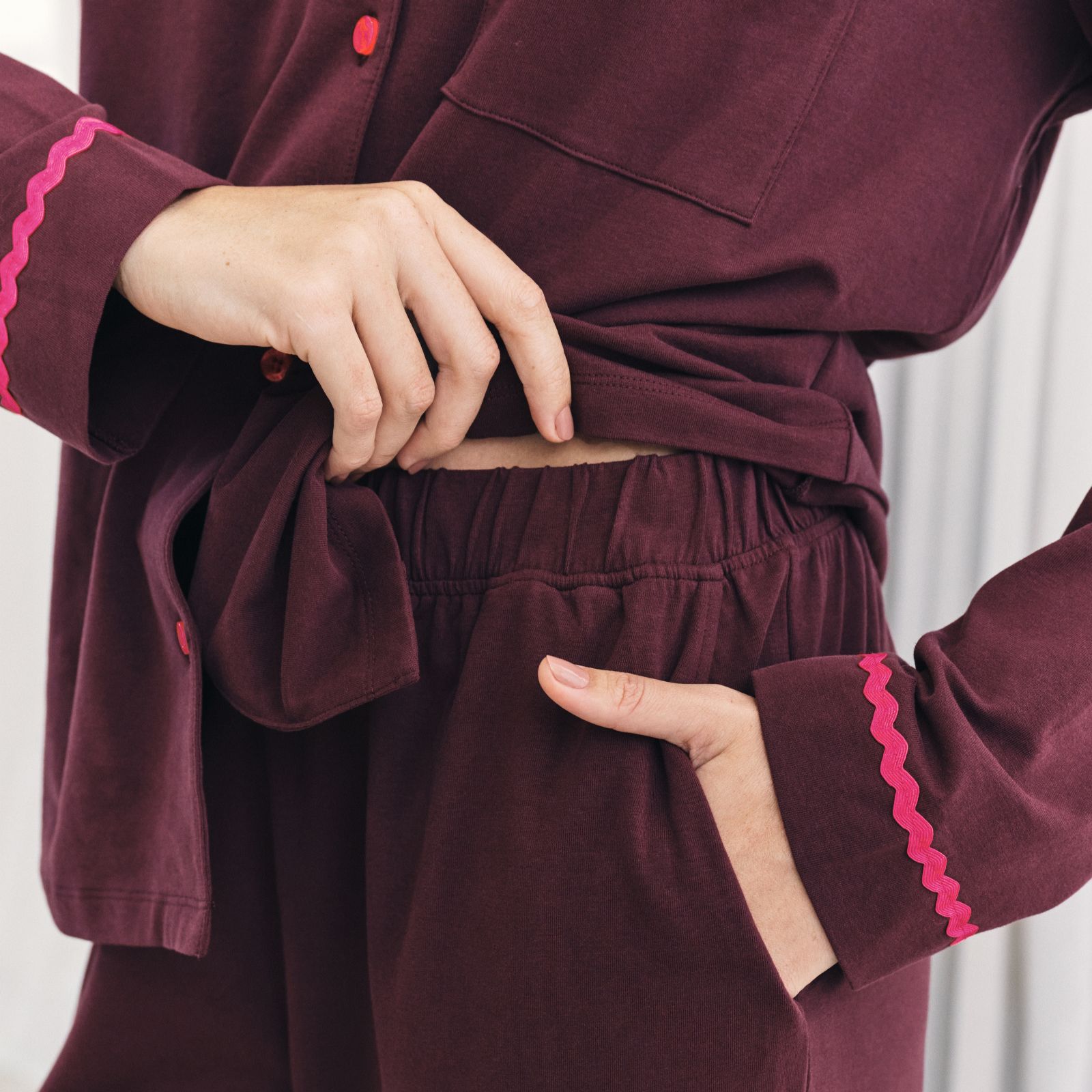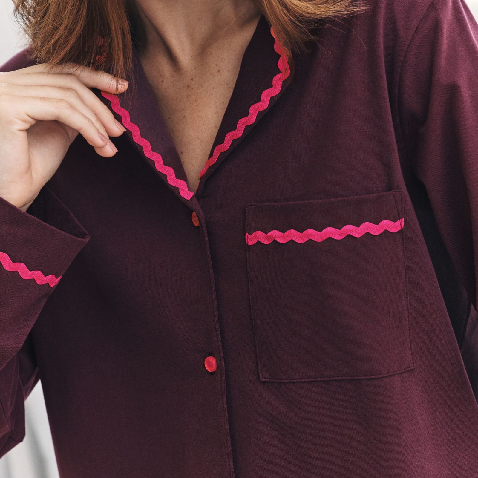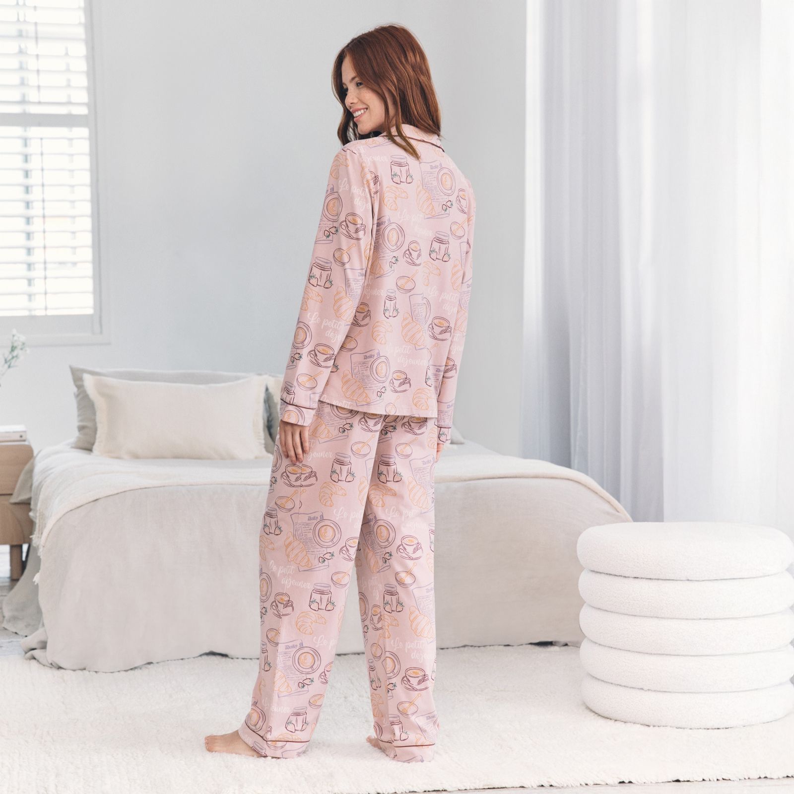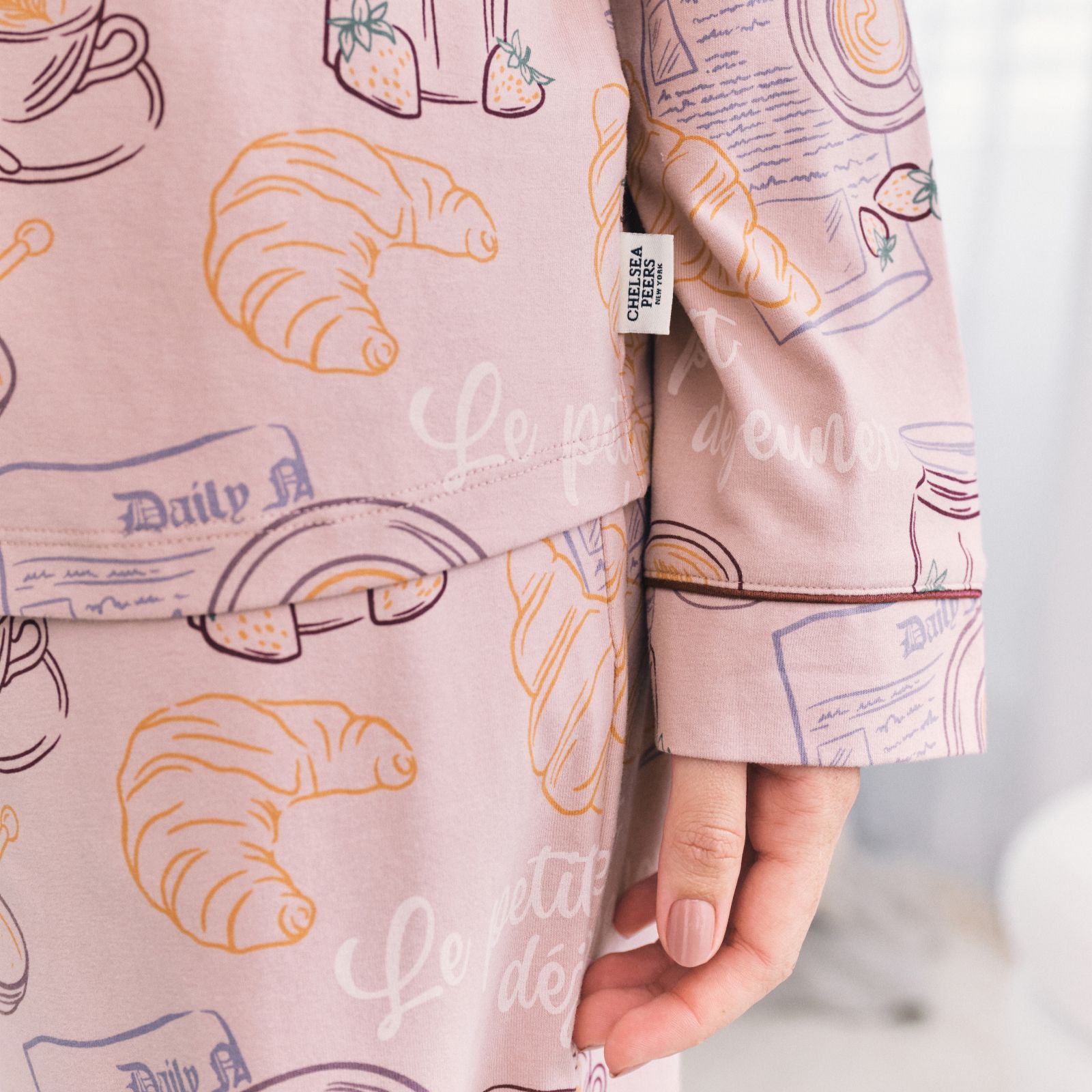 Start your mornings or wind down in style with this Chelsea Peers long button-up pyjama set. Featuring a charming breakfast-themed print against a rich burgundy backdrop, you'll receive a classic button-front top and matching full-length trousers. Perfect for lounging or sleeping, this set blends playful design with comfort, making it a delightful addition to your nightwear collection.