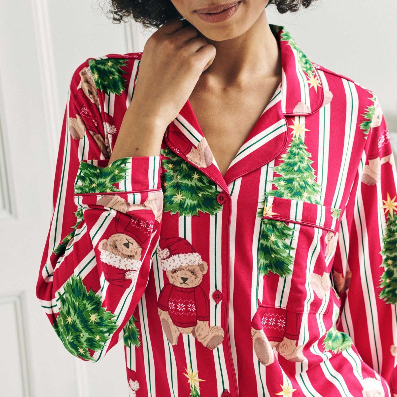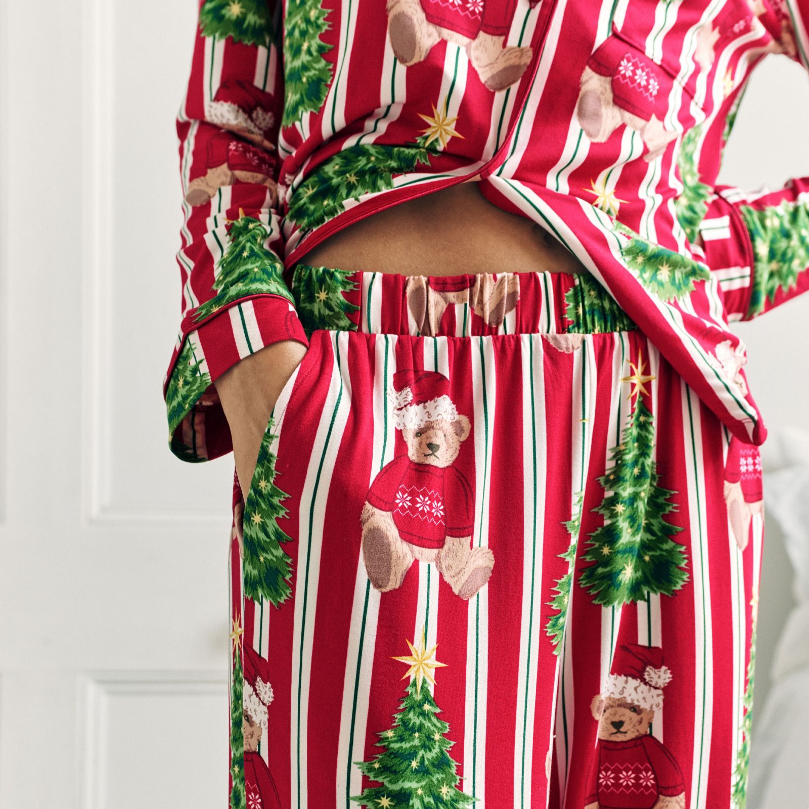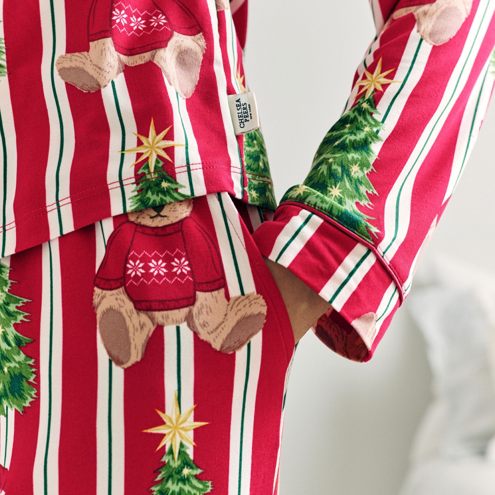 Celebrate cosy evenings with the Chelsea Peers festive pyjama set, featuring a classic long button-up top and matching trousers adorned with a charming bear stripe design. Perfect for unwinding after a busy day, this set invites you to lounge in comfort, whether you're sipping hot chocolate or settling in for a restful night's sleep.