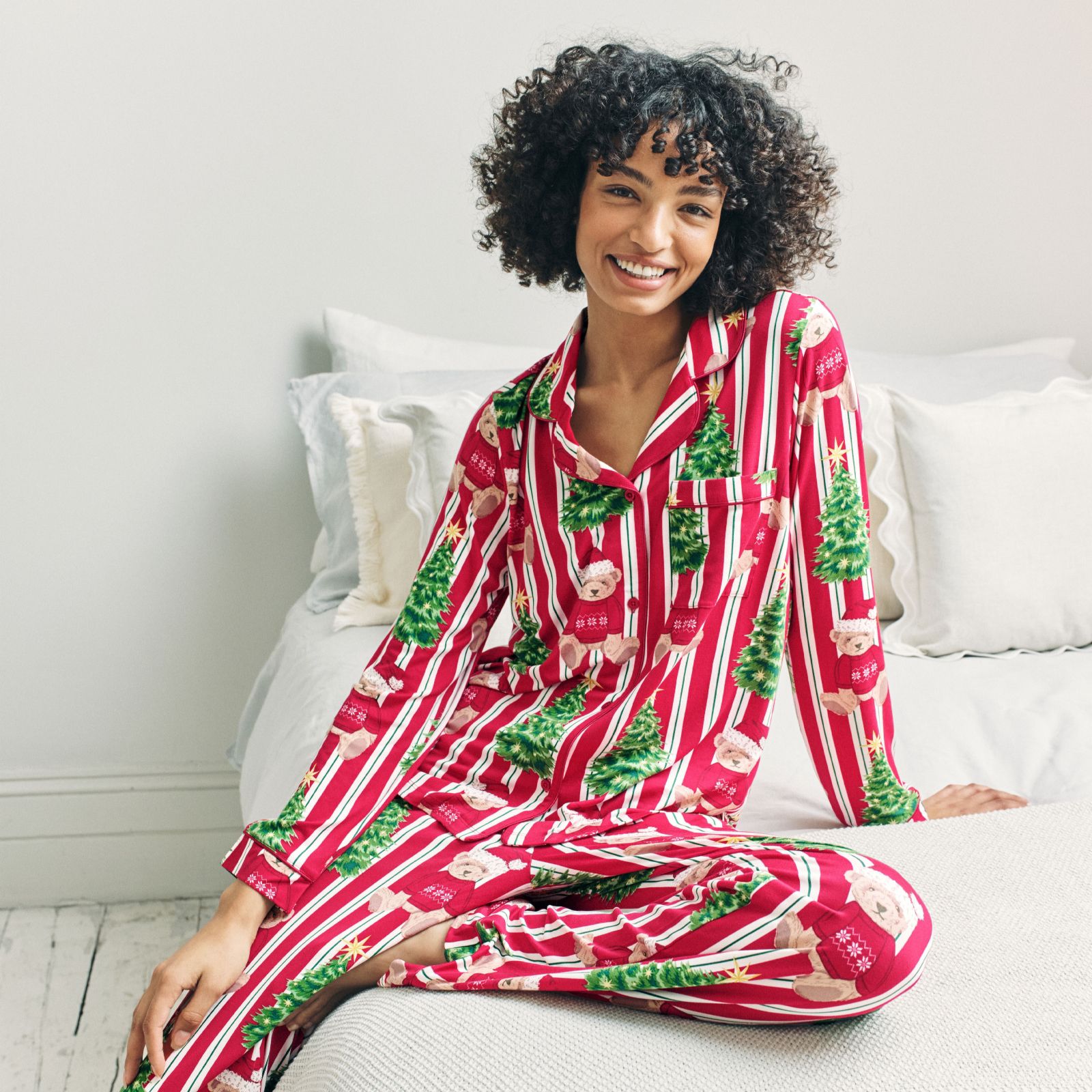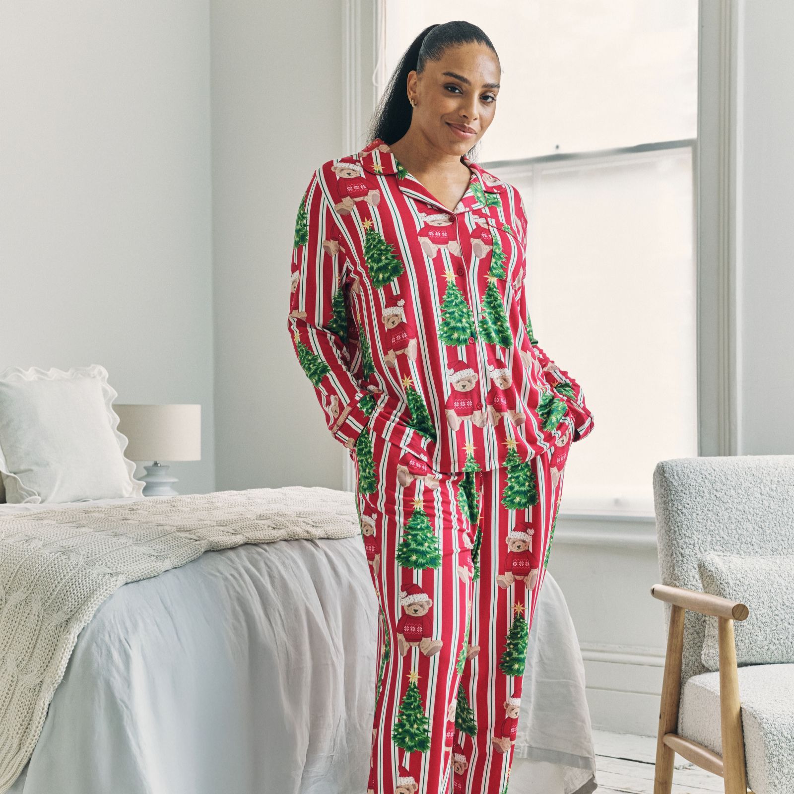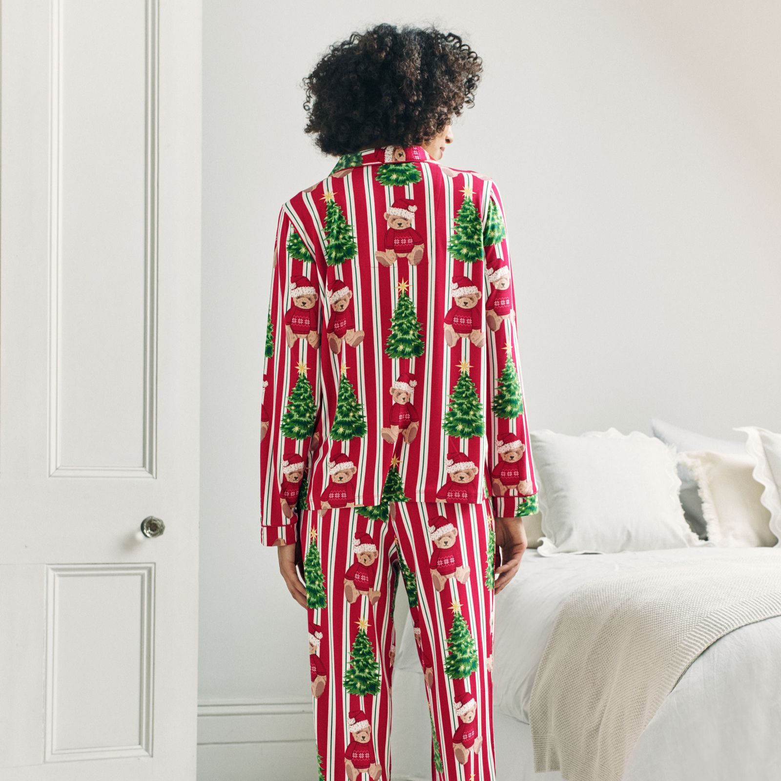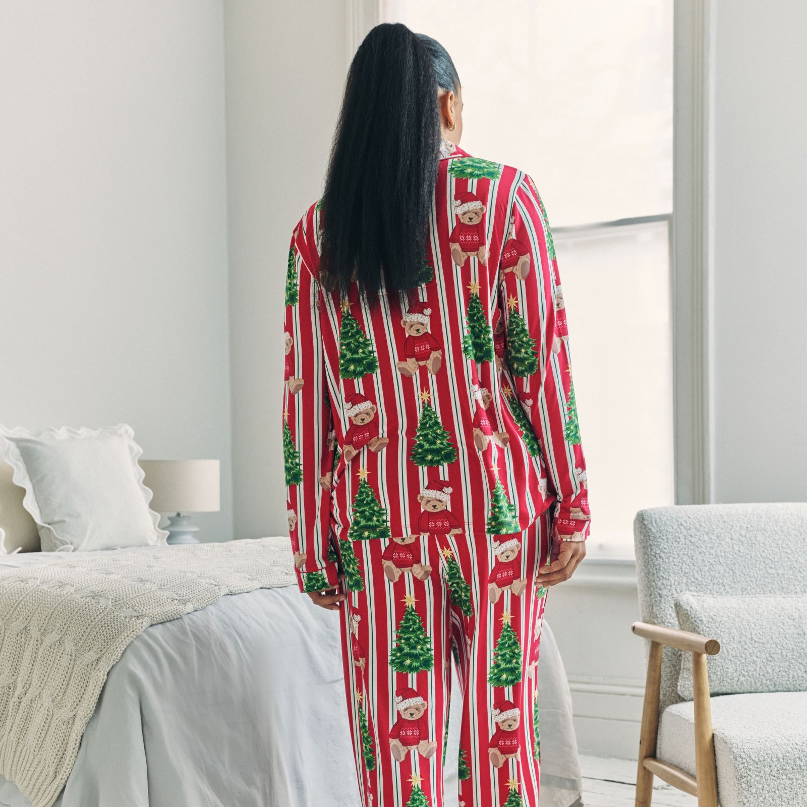 Celebrate cosy evenings with the Chelsea Peers festive pyjama set, featuring a classic long button-up top and matching trousers adorned with a charming bear stripe design. Perfect for unwinding after a busy day, this set invites you to lounge in comfort, whether you're sipping hot chocolate or settling in for a restful night's sleep.