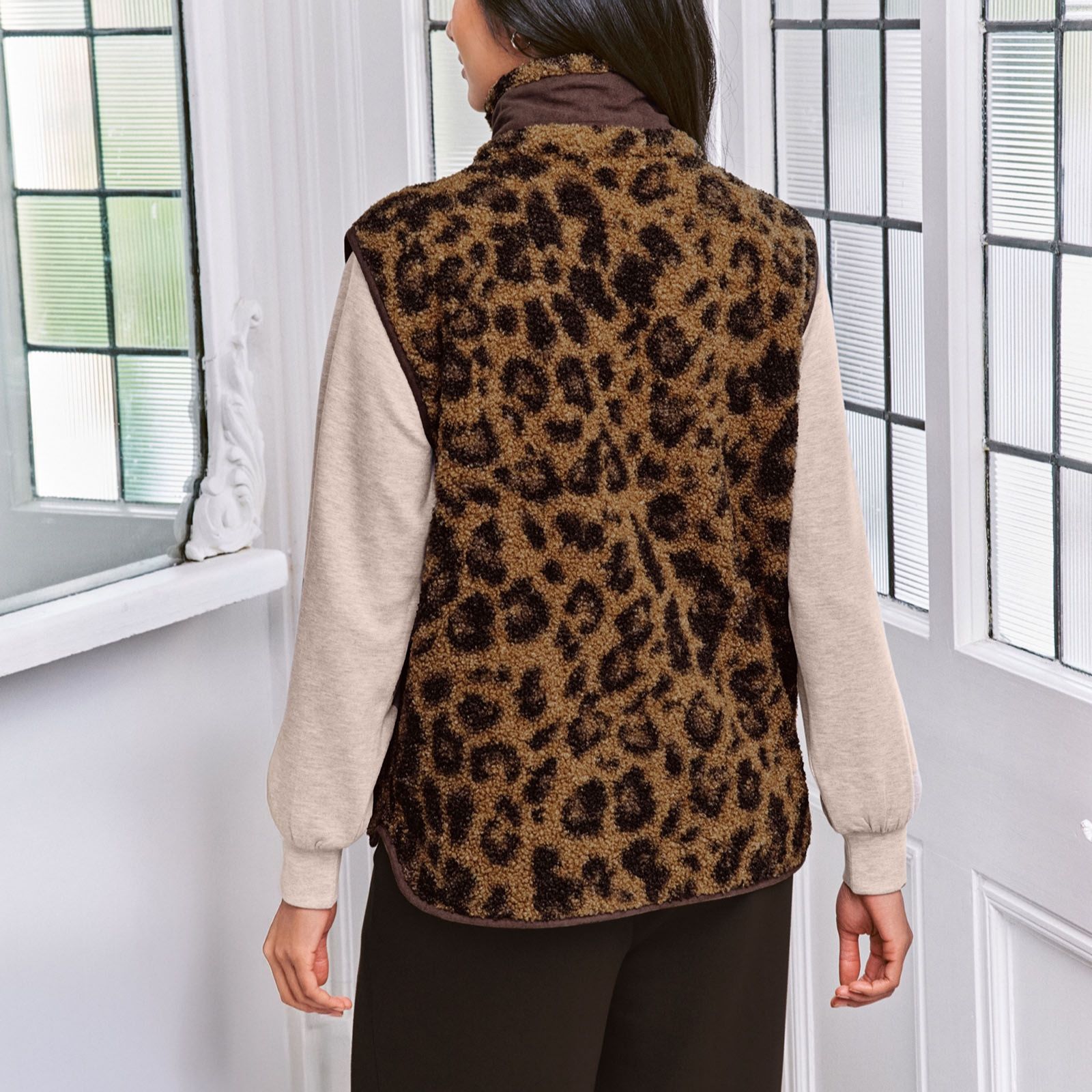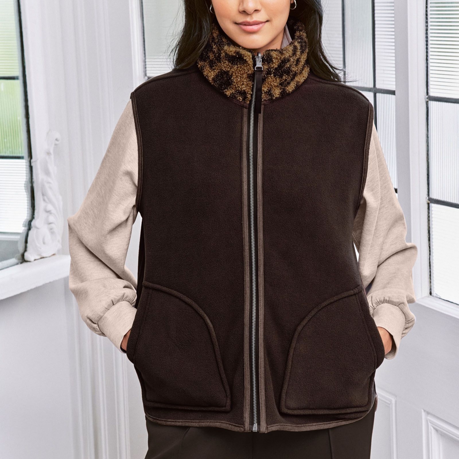 Switch up your look effortlessly with the Chelsea Peers reversible boucle gilet, offering two stylish layers in one. One side boasts a bold leopard-print teddy Borg fleece for cosy texture, while the reverse features sleek polar fleece for a more streamlined feel. Perfect for city strolls, countryside escapes or casual weekends, it layers beautifully over knitwear or under a coat, and works just as well with jeans as with a midi dress.