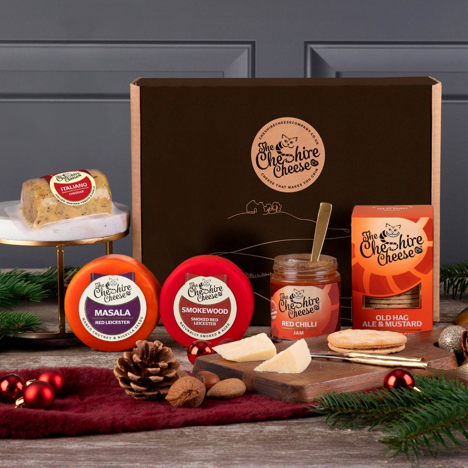 Make your Christmas celebrations extra special with the Festive Christmas Feast Gift Collection from Cheshire Cheese Co. This beautifully presented hamper features Smokewood Star and Vintage Cheddar tree-shaped cheeses, gourmet caramelised onion chutney, crunchy biscuits, and a milk chocolate tree, all delivered chilled and ready for gifting. Perfect for festive gatherings, this set is a wonderful centrepiece for your seasonal cheeseboard or an ideal gift for loved ones.