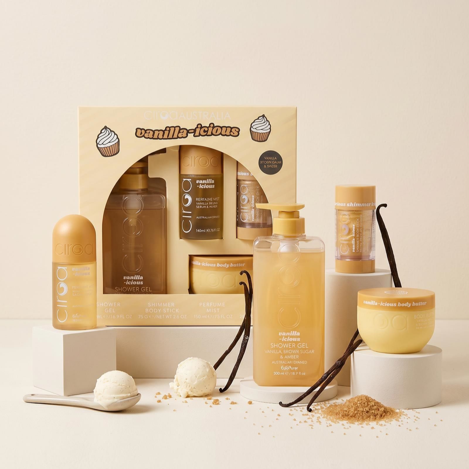 Glow like your most radiant self with the Vanilla Shimmer & Glow Bodycare Collection from Ciroa, a QVC-exclusive set. This four-piece set brings together a shower gel, body butter, shimmer body stick and perfume mist, all infused with the indulgent Vanilla-icious fragrance. Perfect for adding a touch of everyday luxury, this boxed collection helps leave your skin feeling soft and beautifully scented, making your daily routine feel that little bit more special.