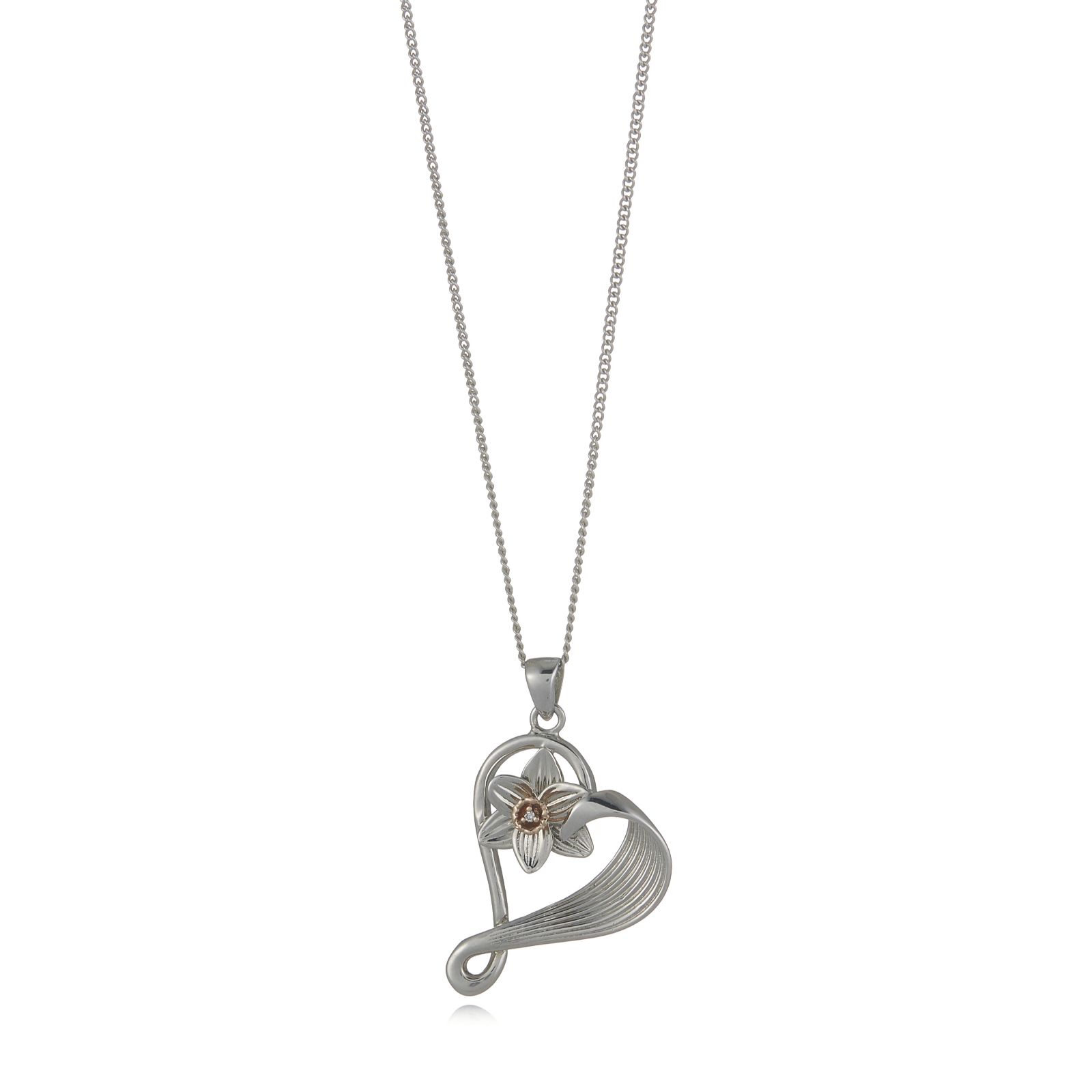 Catherine Huntley for Clogau Daffodil Necklace. This necklace features a rhodium-plated sterling silver heart pendant wrapped around a delicate daffodil design with a 9 carat rose gold and diamond centre, suspended from a single bale on a curb chain. Designed by QVC's very own Catherine Huntley and inspired by a treasured childhood memory of her dad picking daffodils for her, this intricate and necklace is a gorgeous piece to add to your jewellery collection.