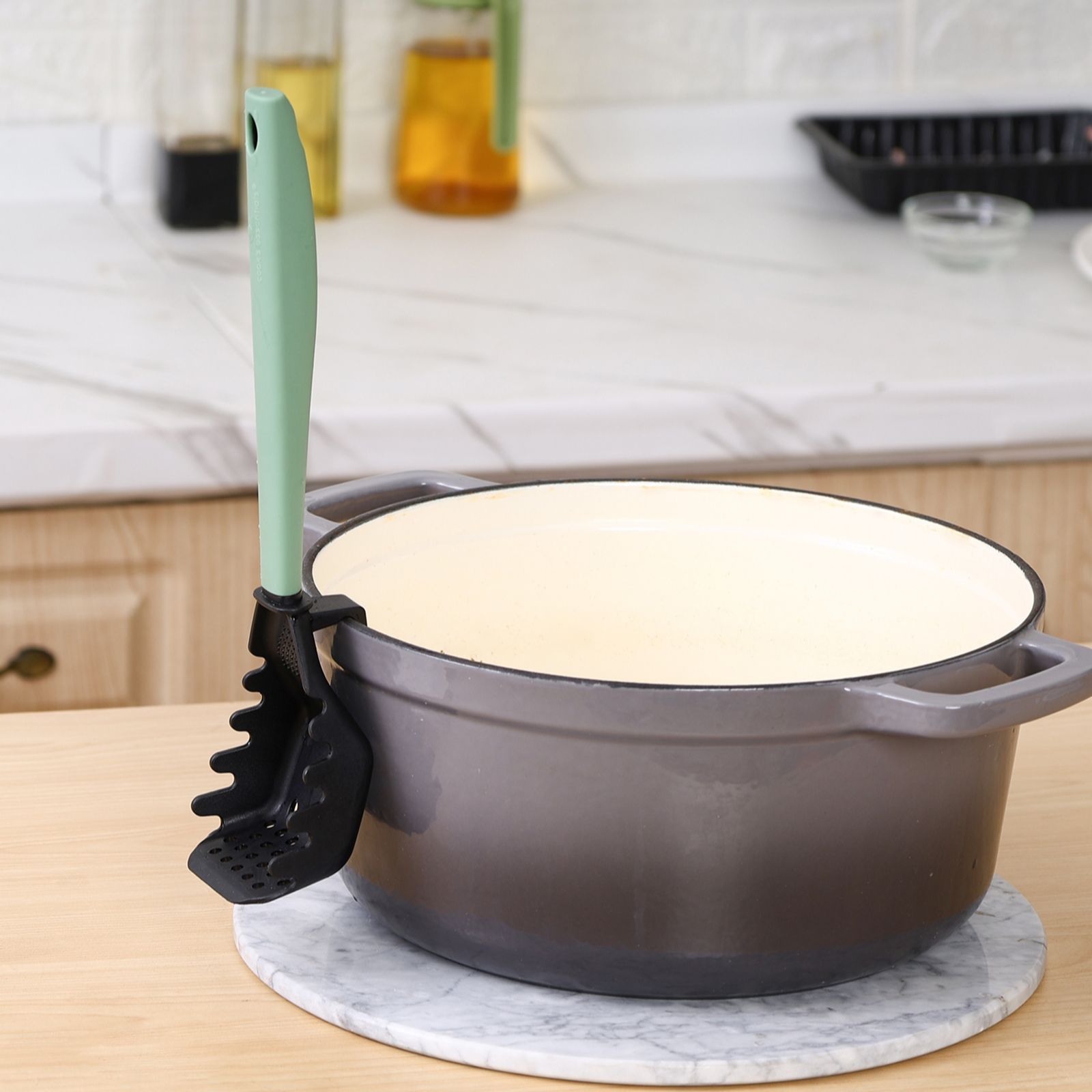 - Slotted spatula converts to a masher by twisting the centre stem anticlockwise