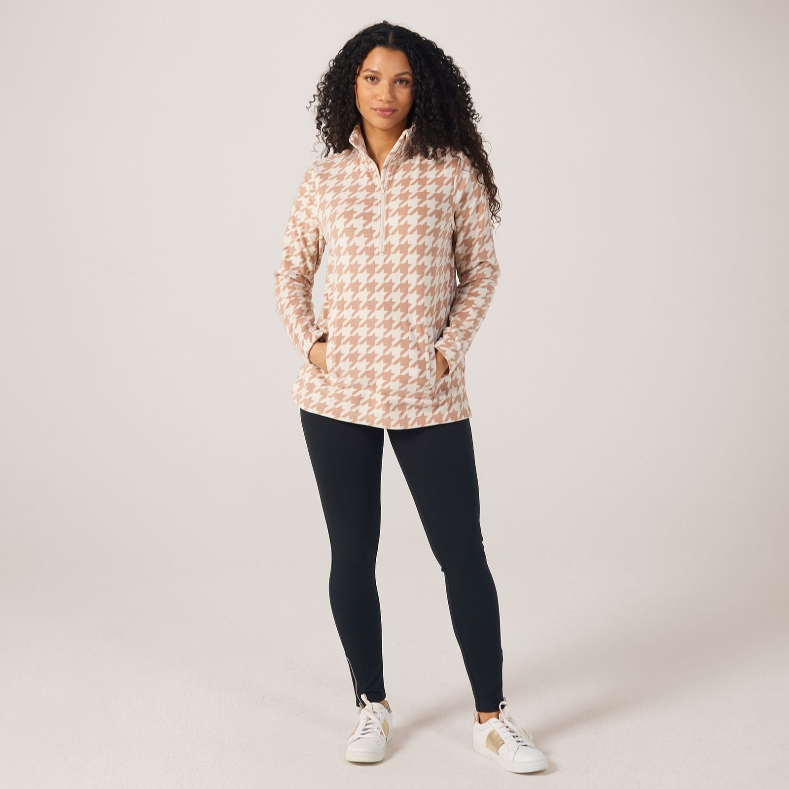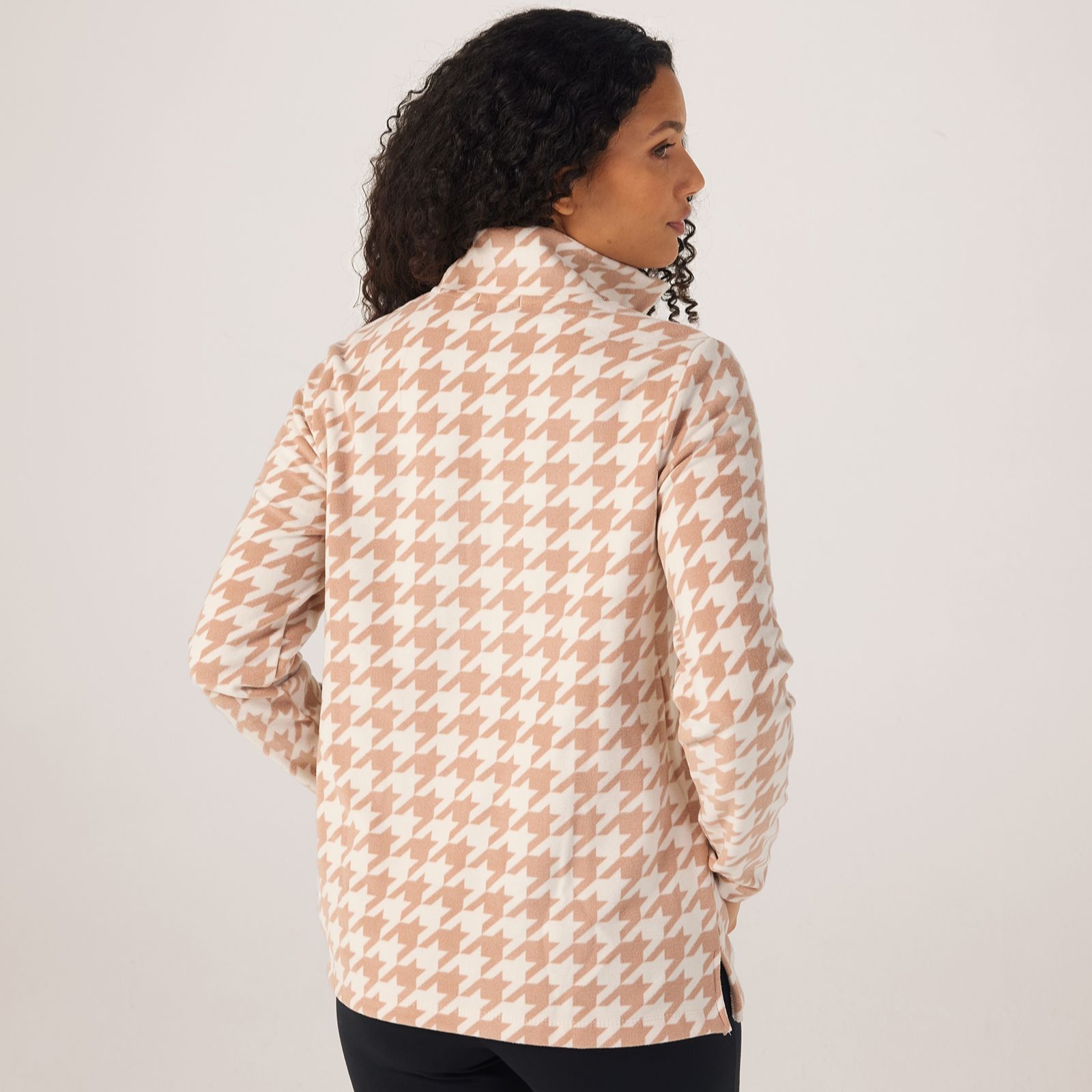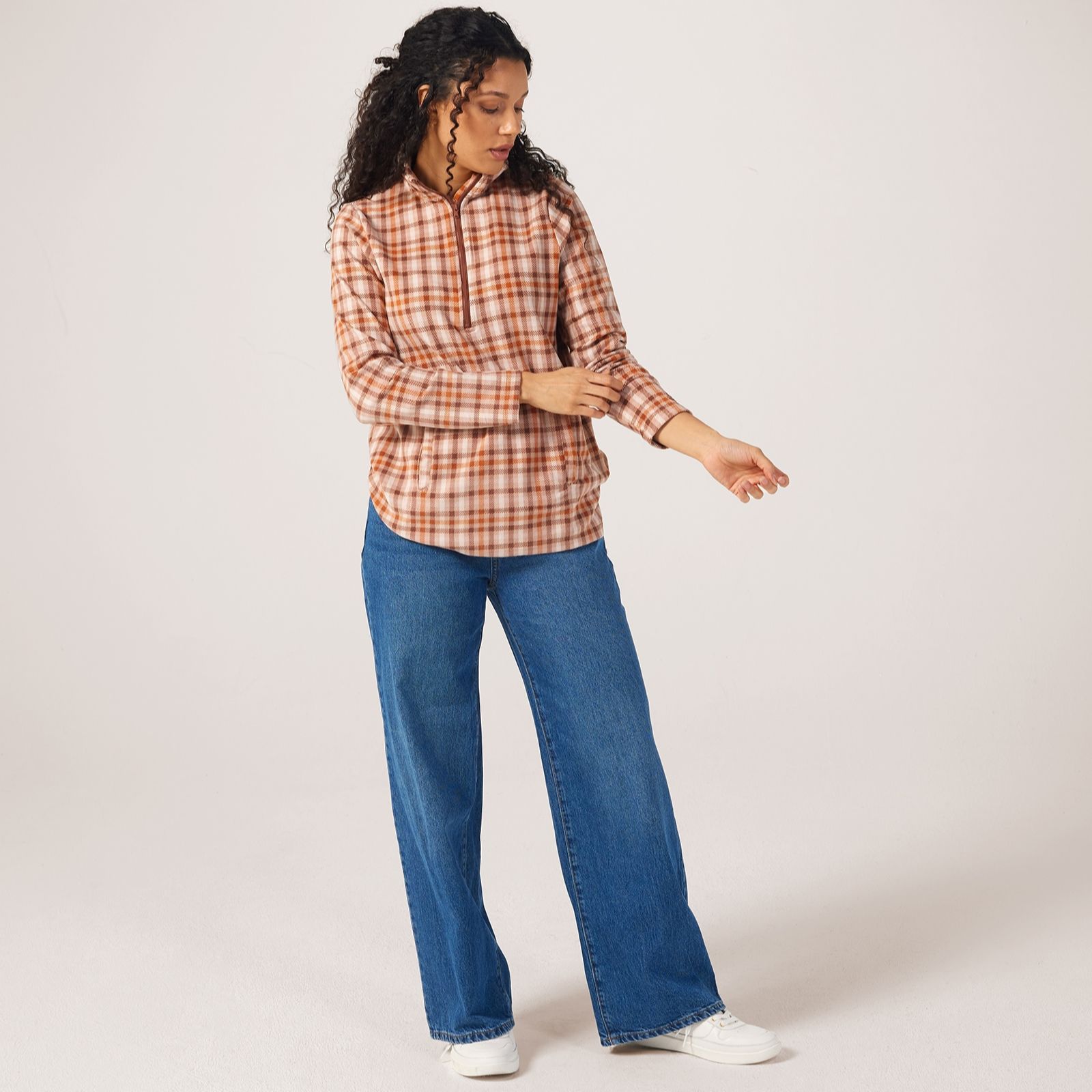 Get ready to cosy up with the Cuddl Duds Flannel Fleece Half Zip jumper. This modern twist on a classic features a mock neckline, zip front with garage, and kangaroo pockets with welt openings. The side slits and long sleeves add to its relaxed charm. Crafted from brushed, compact jersey fleece, it combines the fit, stretch, and warmth you need for total comfort. Perfect for lounging at home or casual outings, this jumper pairs effortlessly with jeans or leggings for a laid-back look.