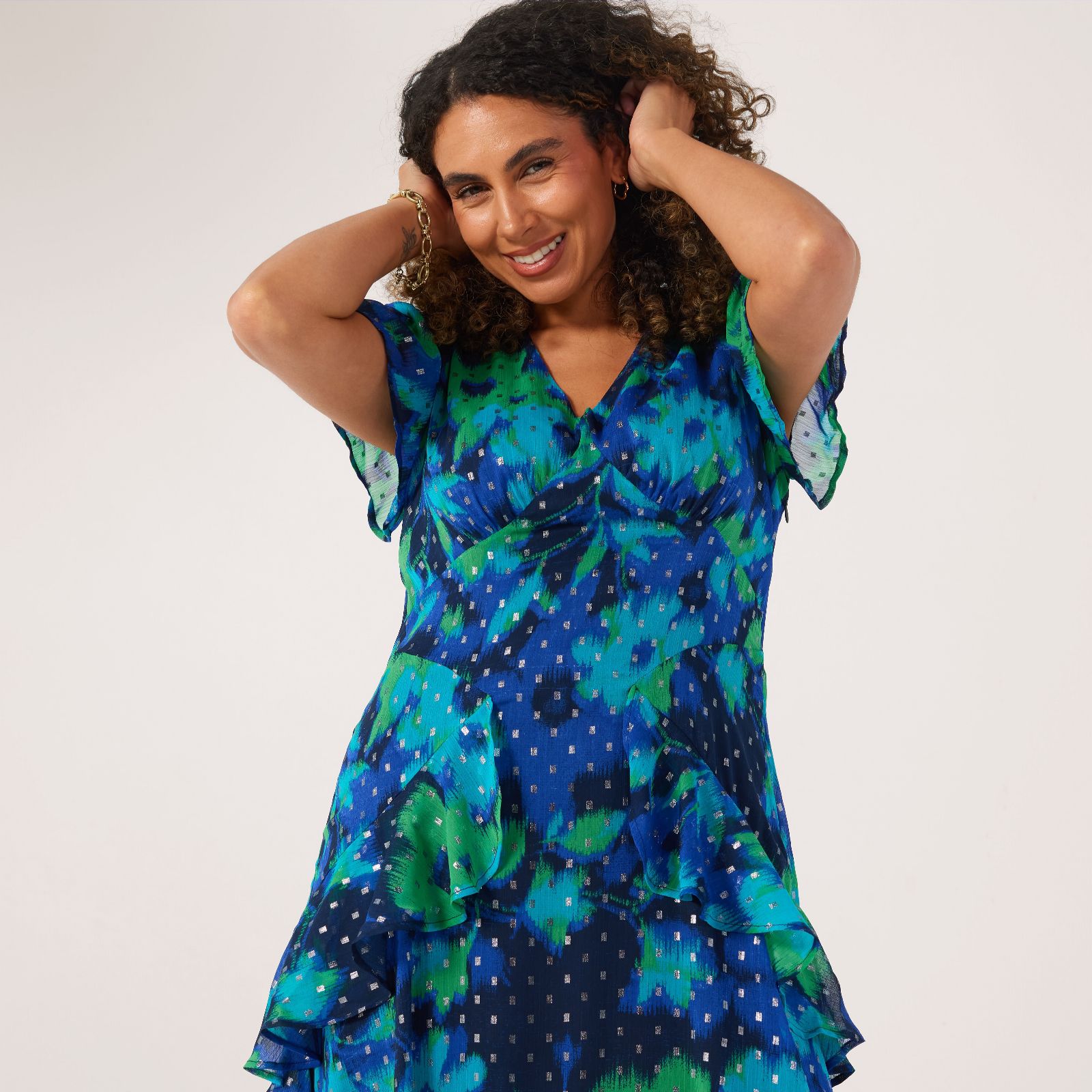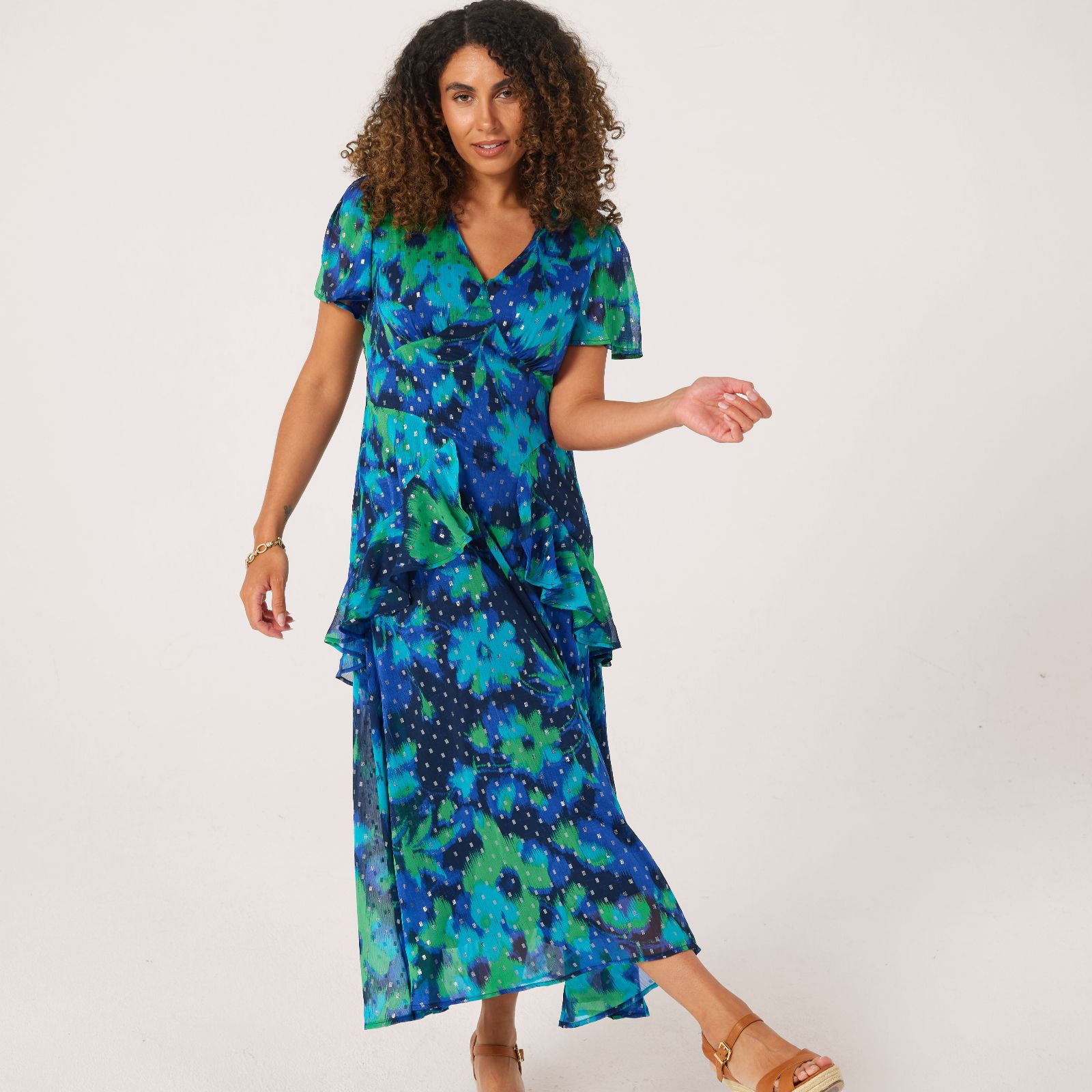 Step out in elegance with the Dannii Minogue frill maxi dress, designed to make every moment special. Featuring charming frill details and a sophisticated foil-printed finish, this dress is perfect for occasions from brunch to evening events. Pair with gold jewellery and heels for a truly standout look that lets the dress' unique features shine.