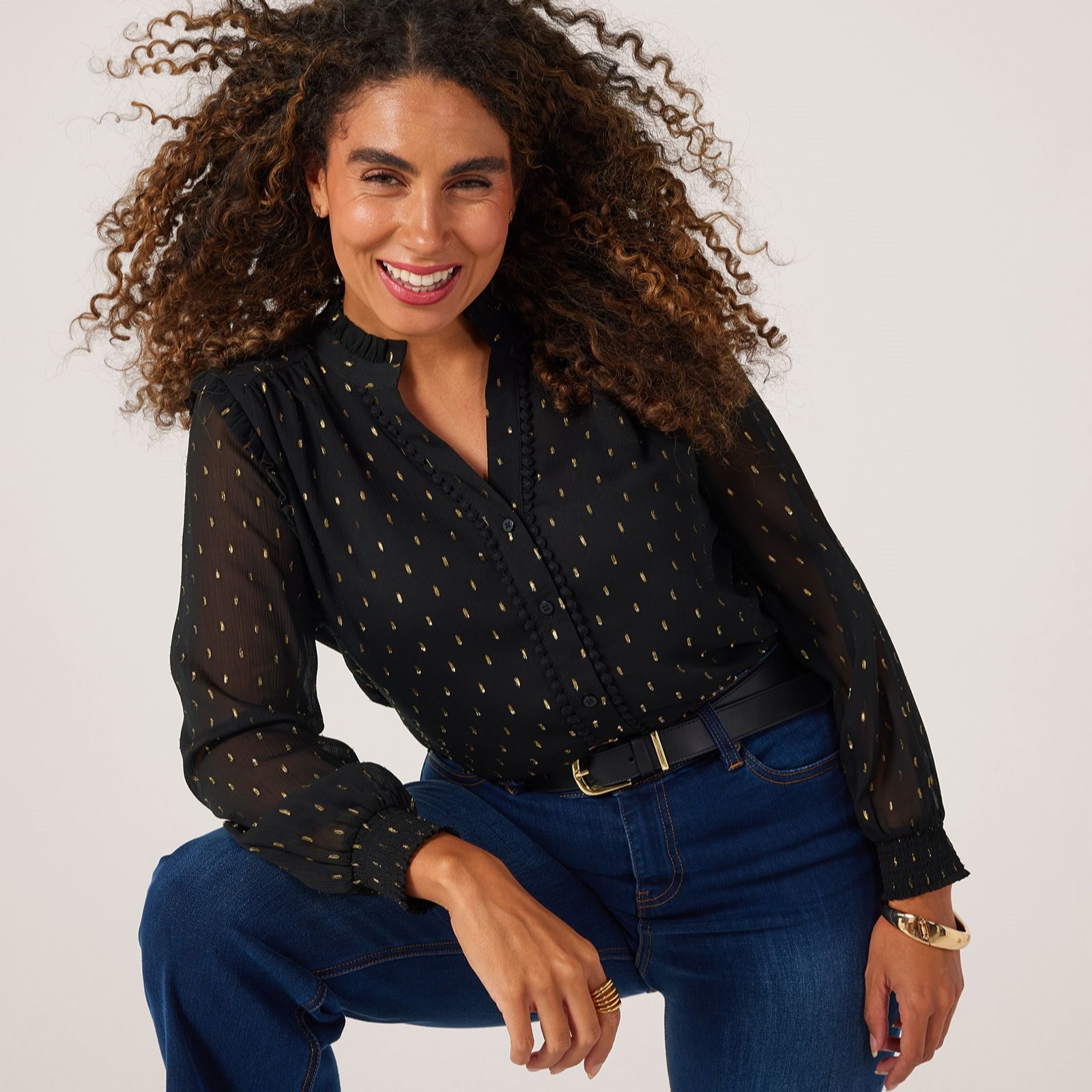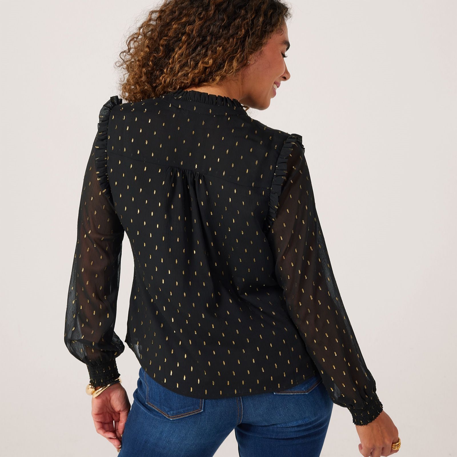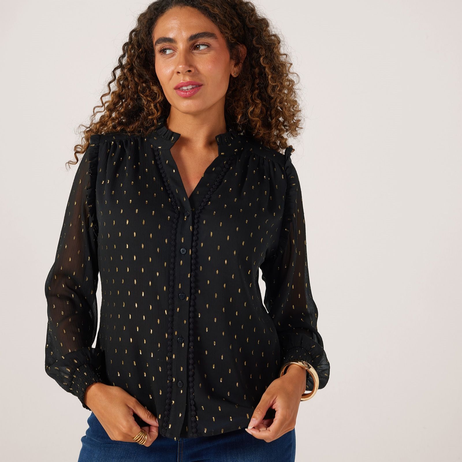 Bring a subtle shimmer to your look with this ruffle blouse from Dannii Minogue. Ideal for adding a touch of glamour to your wardrobe, this blouse features a frilled v neckline and long sleeves with shirred cuffs, creating an effortlessly graceful silhouette, perfect for elevating everything from office looks to evening outings. Layer it with tailored trousers and statement earrings for an instant style boost.