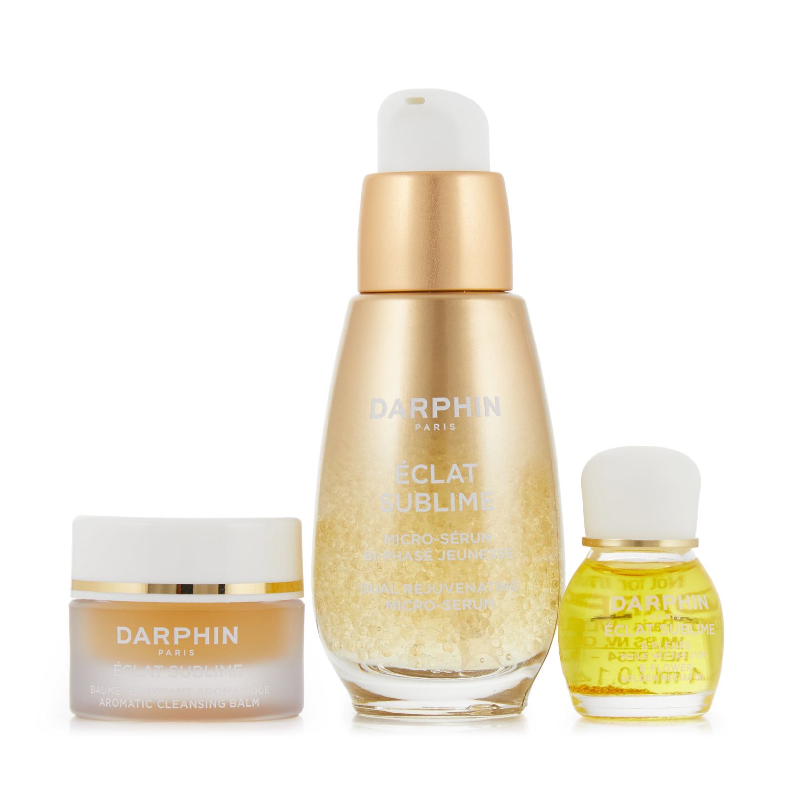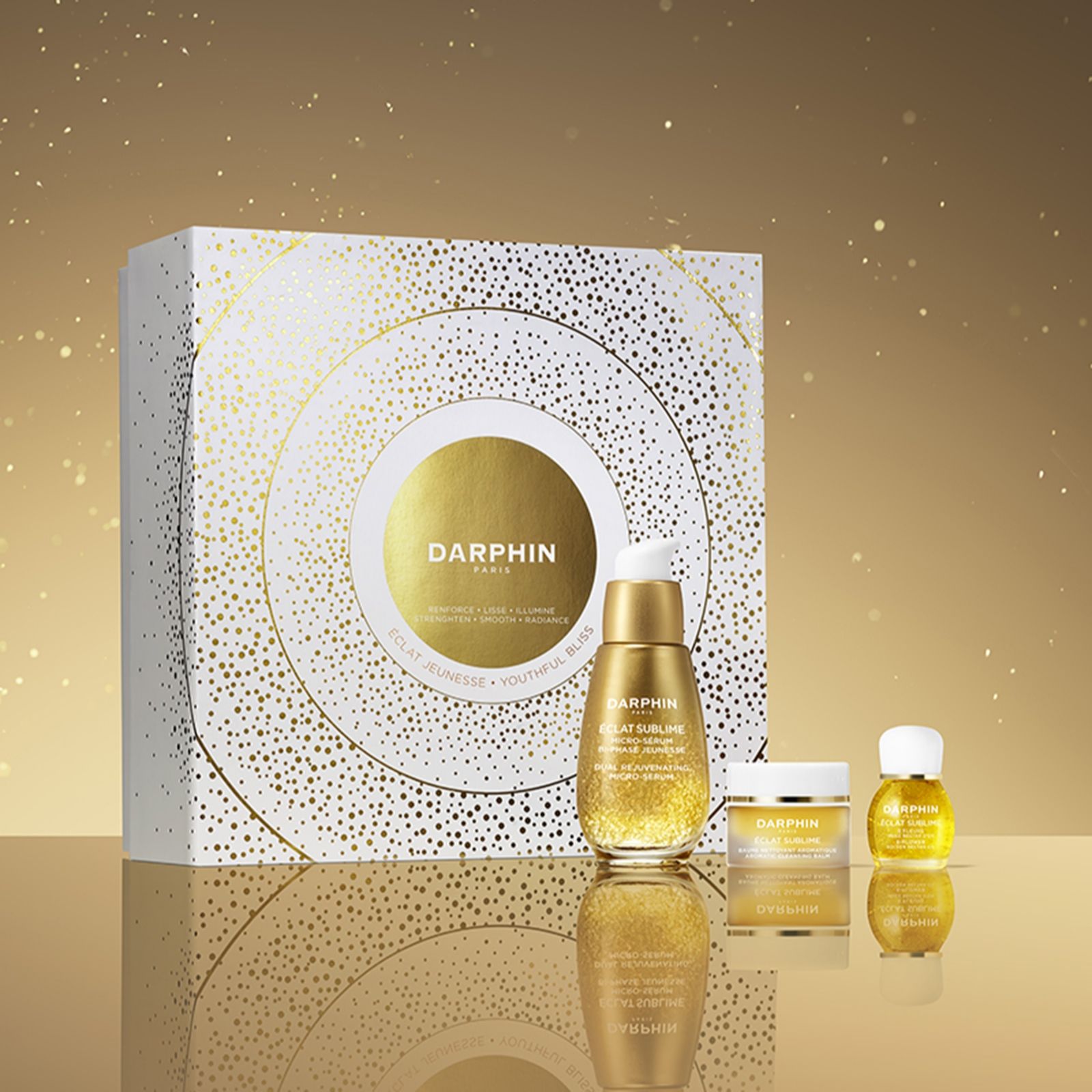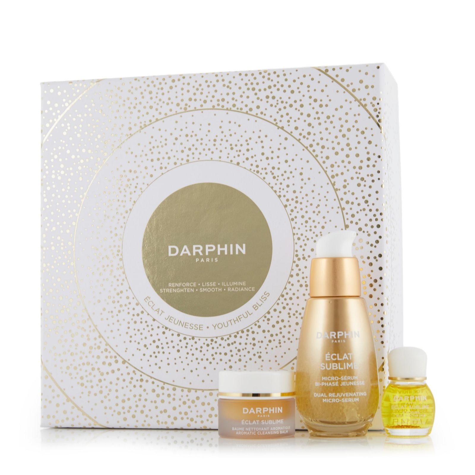 Treat yourself or a loved one to a luxurious skincare experience with the Youthful Bliss Eclat Sublime Gift Set. This gorgeous set from Darphin, complete with a stunning gift box, contains Eclat Sublime Dual Rejuvenating Micro-Serum, Eclat Sublime Aromatic Cleansing Balm and Eclat Sublime 8-Flower Golden Nectar Youth Renewing Oil - all the products you need for a hydrated, cleansed, radiant-looking complexion.