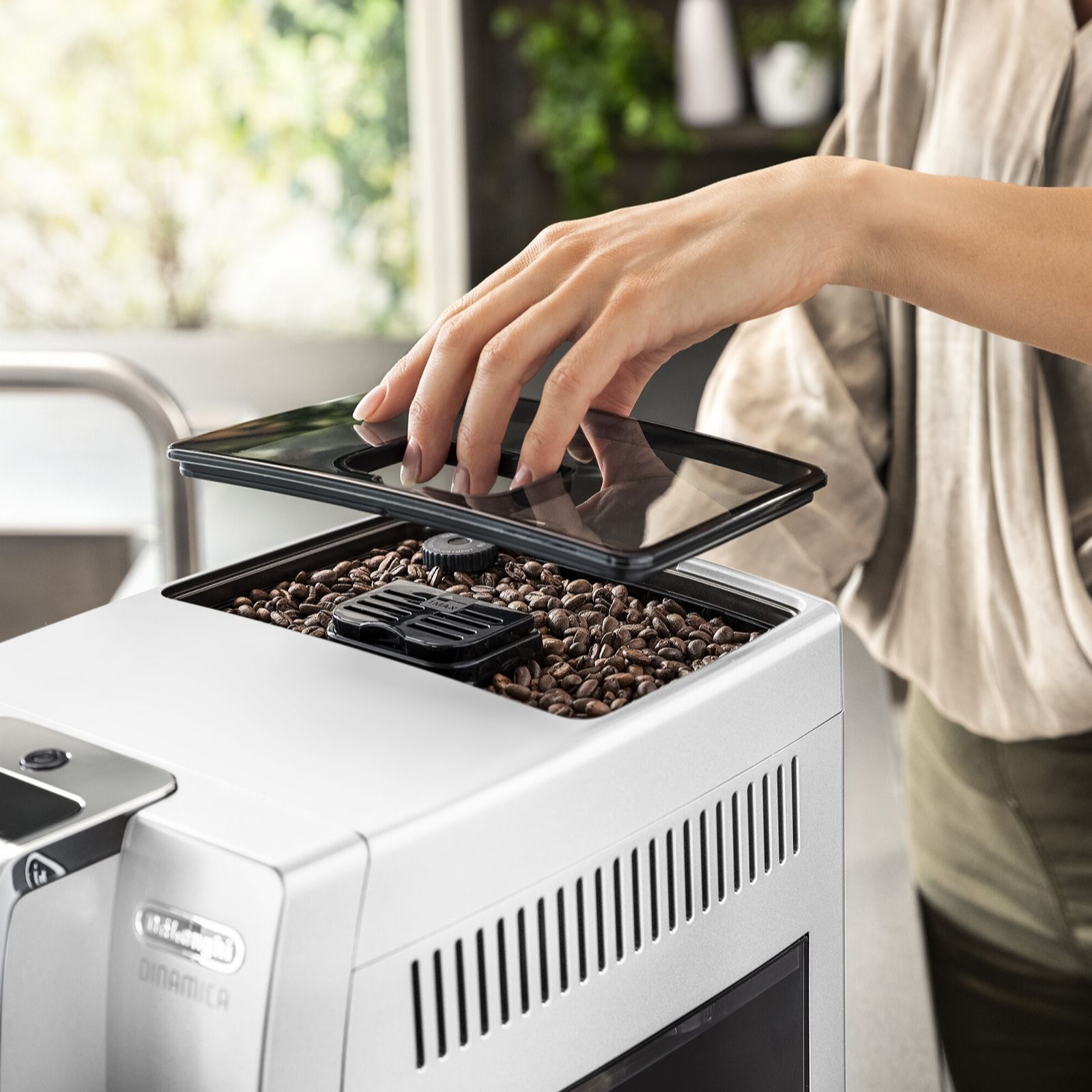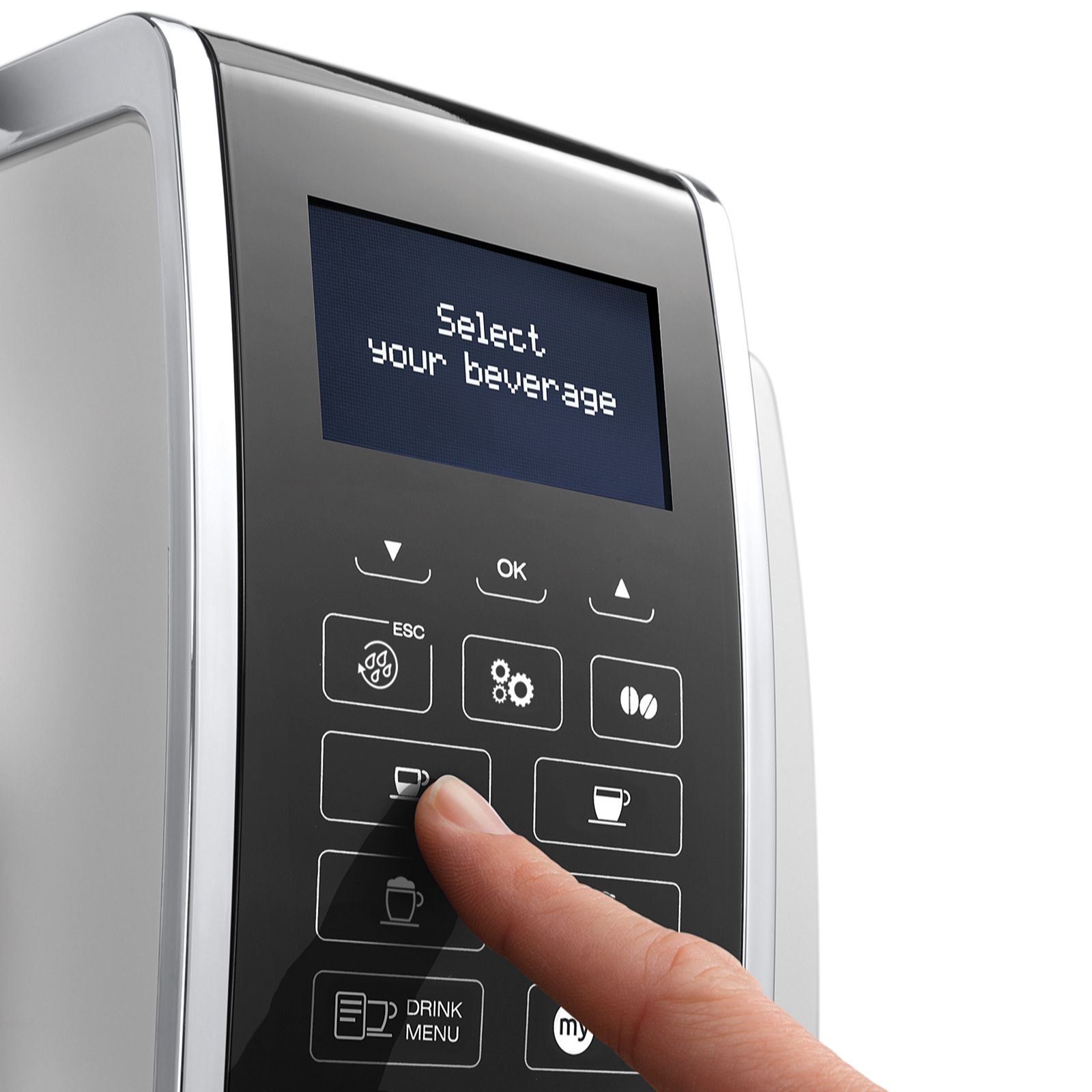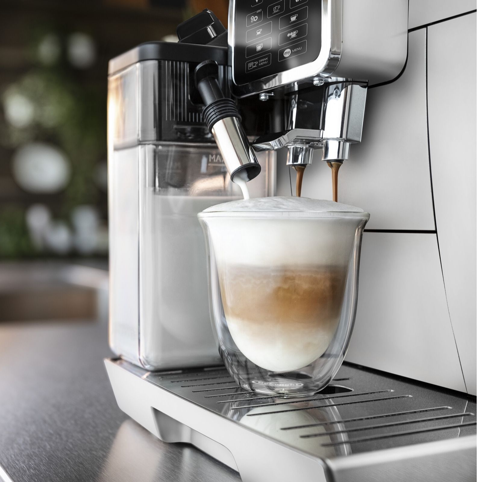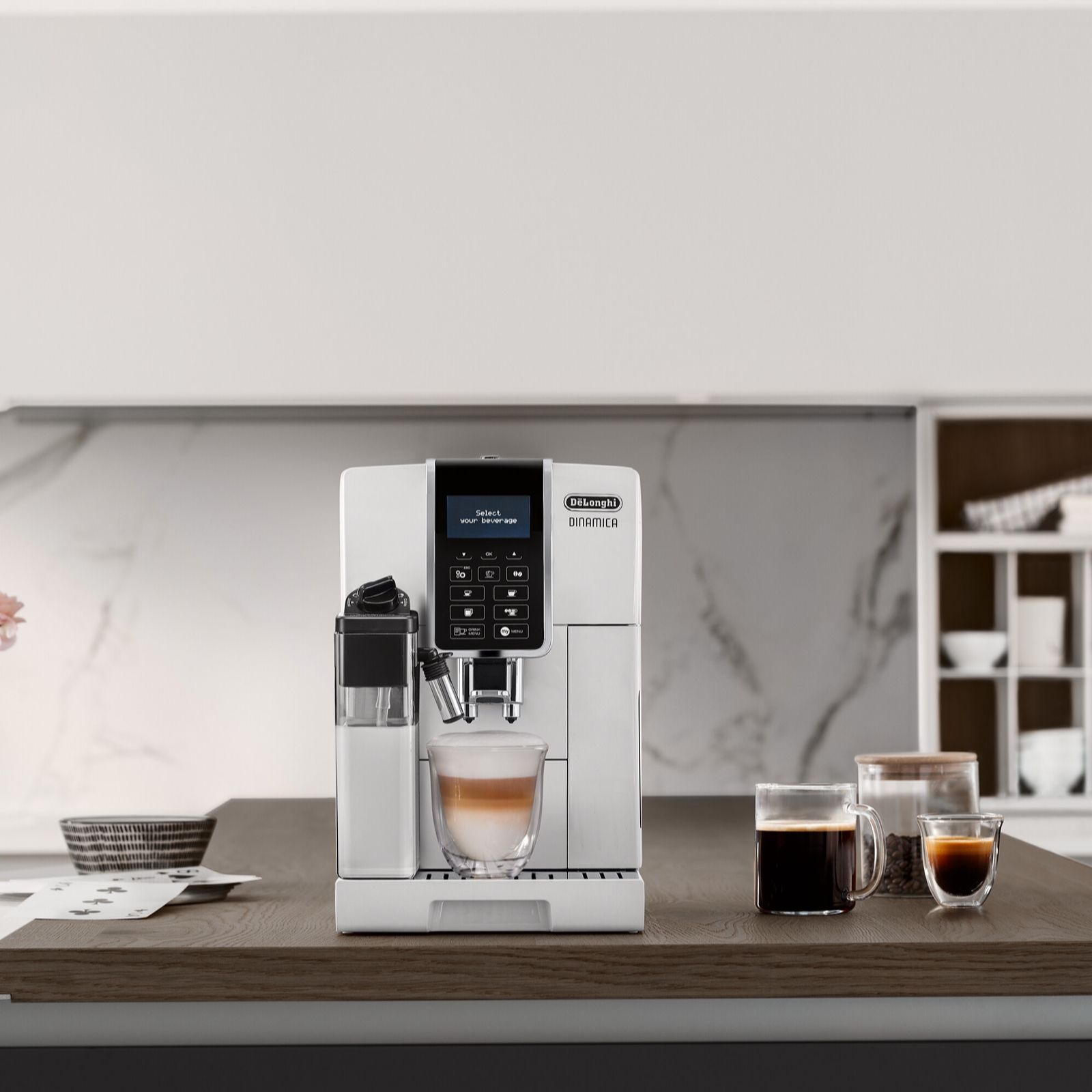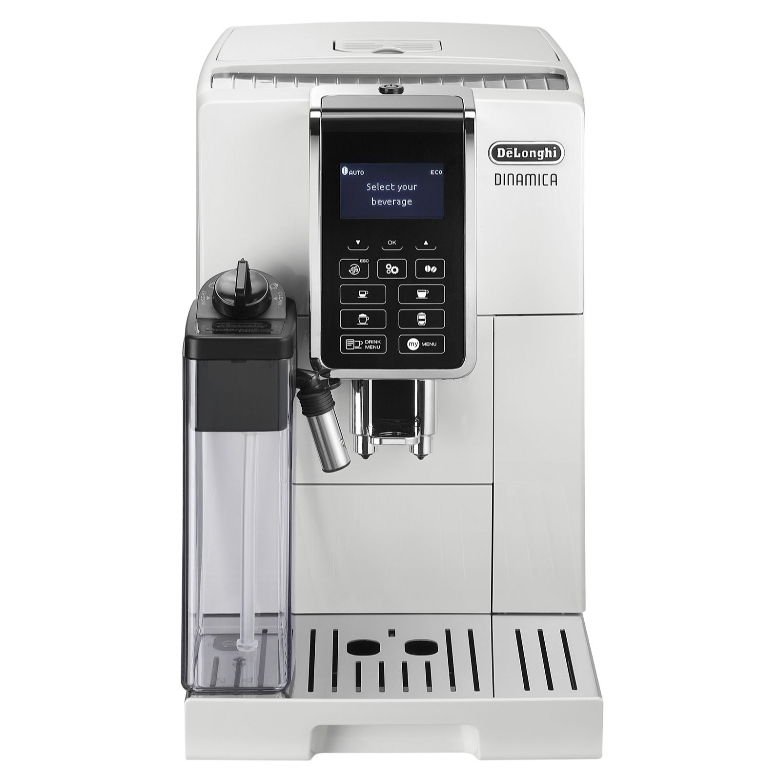 Create your own at-home cafe with the sleek De'Longhi Dinamica fully automatic bean-to-cup coffee machine in white, featuring intuitive touch controls and an LCD display. From espresso to cappuccino, latte to flat white, this machine allows you to enjoy barista-quality drinks at the touch of a button, with the Latte Crema System delivering top-notch froth every time. Personalise recipes with the MY Menu function and savour freshly ground beans for a truly indulgent coffee experience.