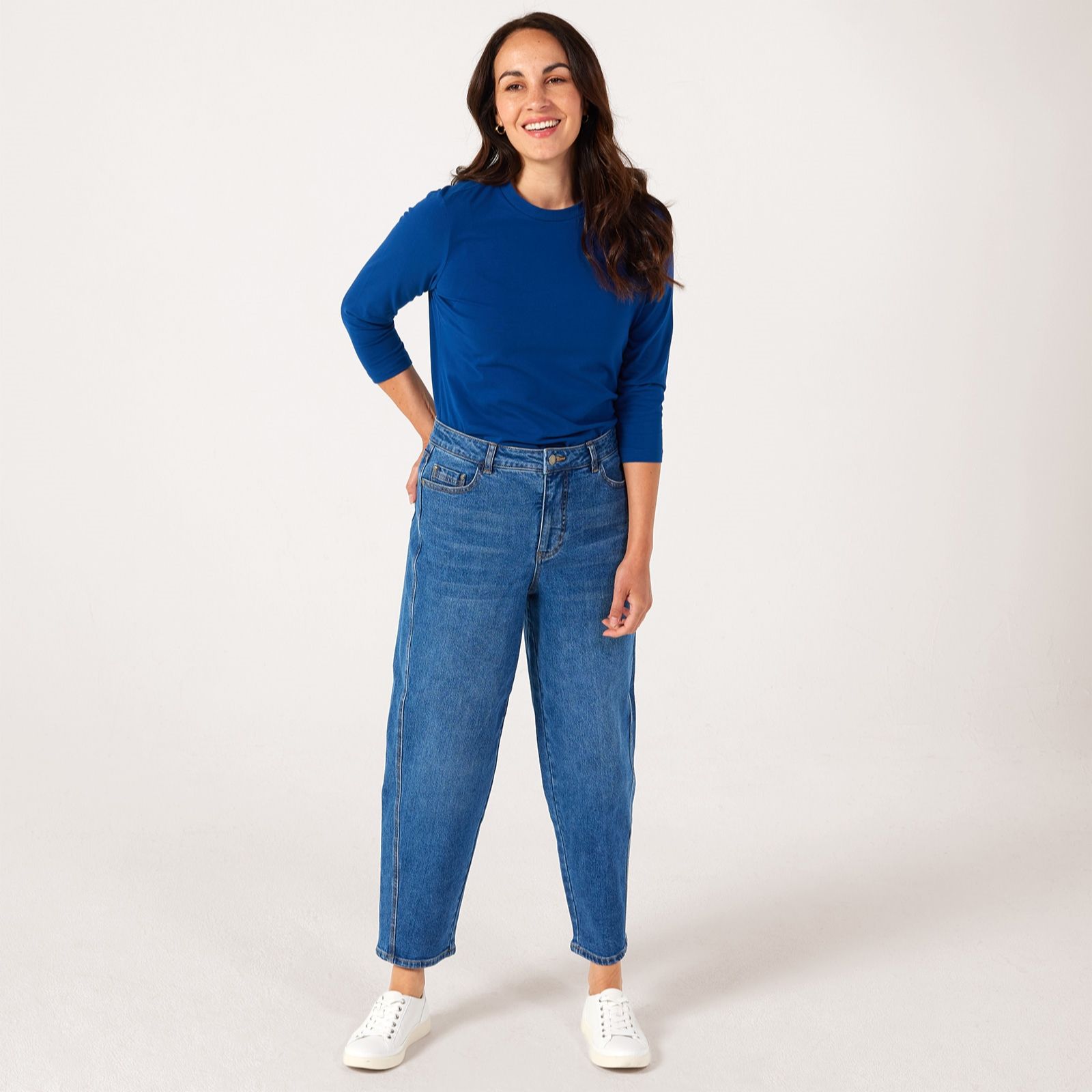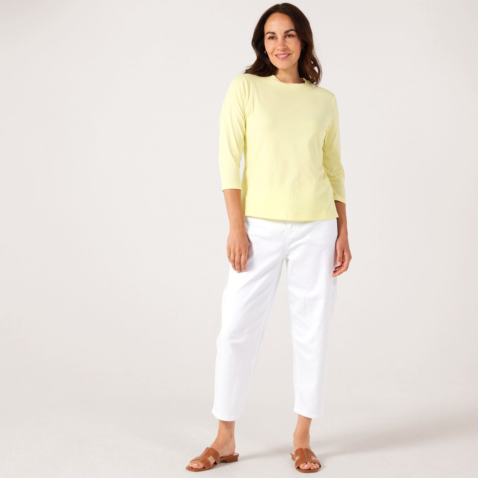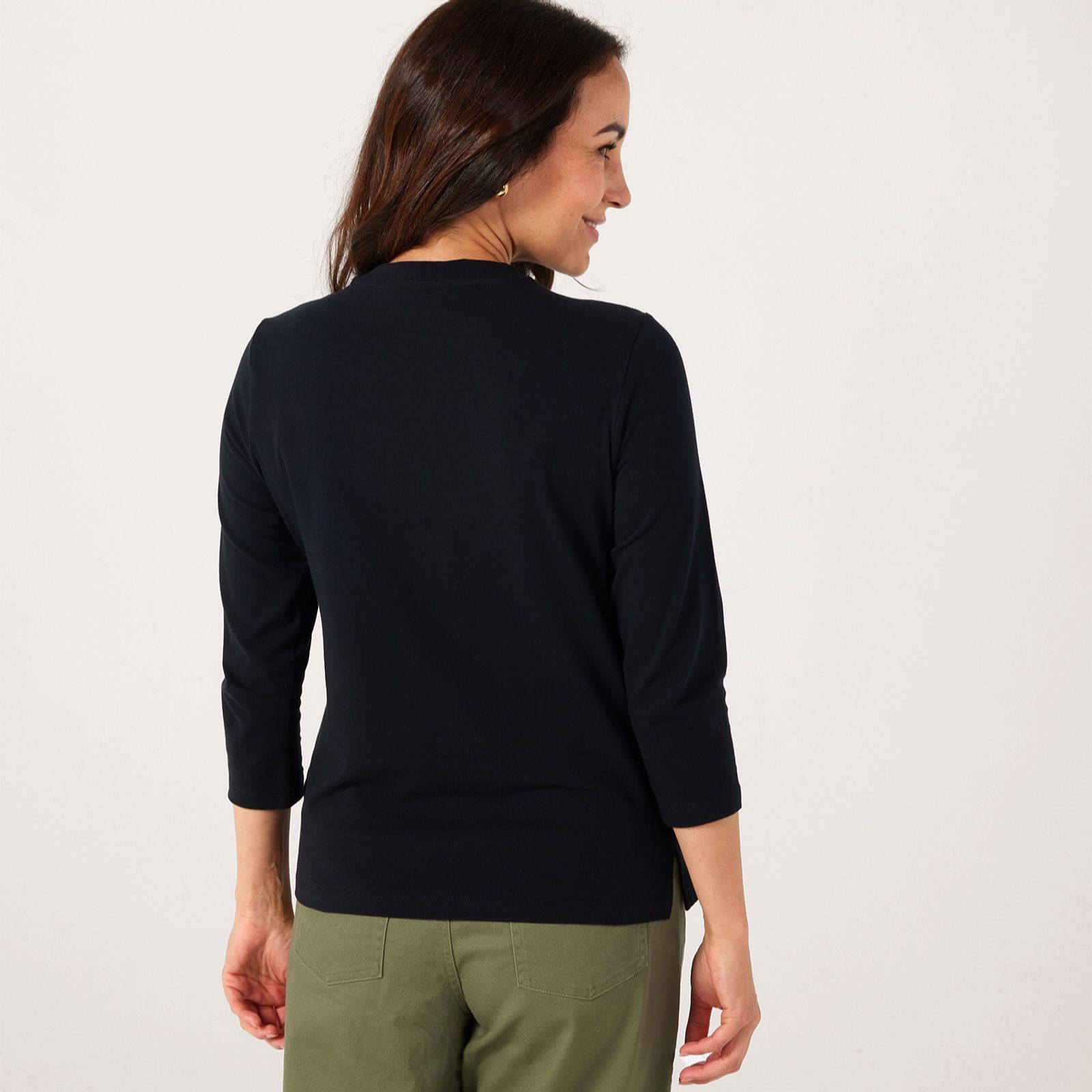 Slip into effortless comfort with this single jersey 3/4 sleeve top from Denim & Co. Essentials, crafted with a classic round neckline and side slits at the hem for a relaxed yet refined finish. Perfect for everything from weekend brunches to days at the office, its easy-wearing style makes it a versatile staple. Layer under a blazer or team with jeans for a look that's simple yet chic.