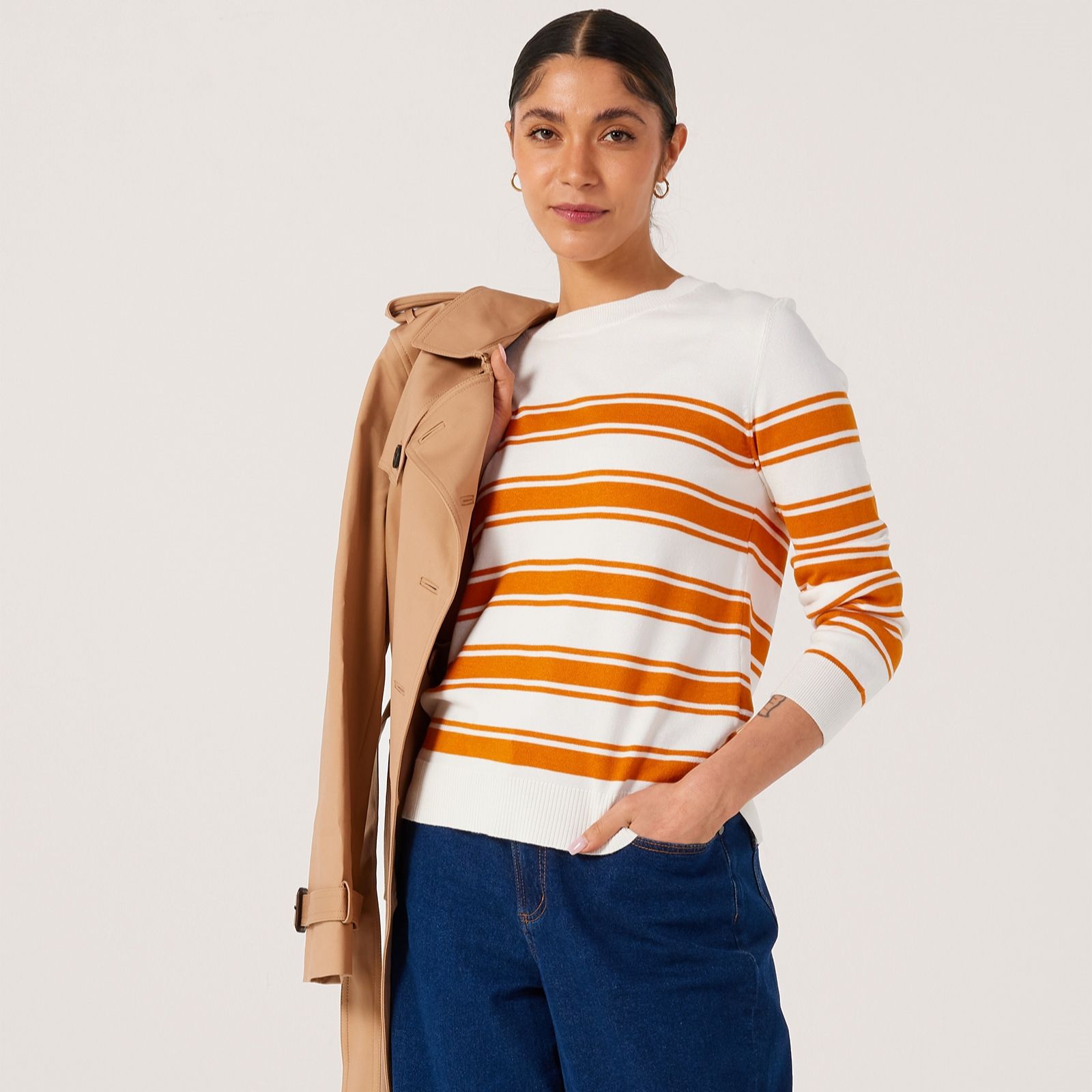 Add a touch of effortless style to your wardrobe with this Denim & Co. Essentials stripe crew neck jumper. This versatile piece features a solid ground with contrast colour stripes, making it perfect for both casual and smart-casual occasions. Wear it with your favourite jeans for a laid-back weekend look or layer it over a crisp shirt for a more polished ensemble.